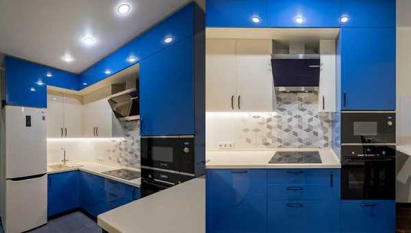 • У вас большая кухня-гостиная? По дизайну лучше проконсультироваться со специалистами, поскольку глянцевый синий может сделать вашу кухню скучной, пустой и бесконечно большой.