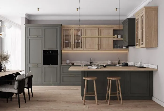Чтобы более точно проследить данную связь, мы для вас представили кухню коллекции КЛЕРМОН и кухню новой эксклюзивной коллекции HARMONY. Первая кухня выполнена из массива дерева, а именно – из натурального дуба, который окрашен в два светлых нейтральных оттенка. Вторая также выполнена из массива натурального дуба, но частично окрашена эмалью, а часть покрыта бесцветным масловоском, который напитывает дерево и придает ему особый эстетичный вид. Но и это еще не все: у обеих кухонь вы можете самостоятельно решить, какой вариант оформления наиболее подойдет именно вам: