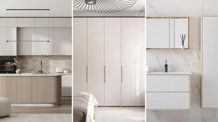 Фасады кухни, гардероба или ванной комнаты выбирайте светлые с ненавязчивыми акцентами, или же отдайте предпочтение светлой отделке, а для фасадов – более насыщенные цвета.