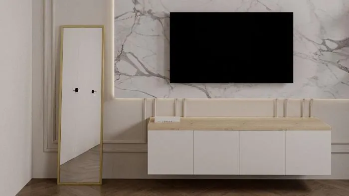 Напольные тумбы. Данный вид замены "стенки" не только практичный, но и довольно простой, так как не нужно крепить к стене и передвинуть в любое другое удобное для вас место можно в любой момент. Здесь же уже не возникает вопросов о том, сколько тумба сможет выдержать, а уборка не требует особых усилий.