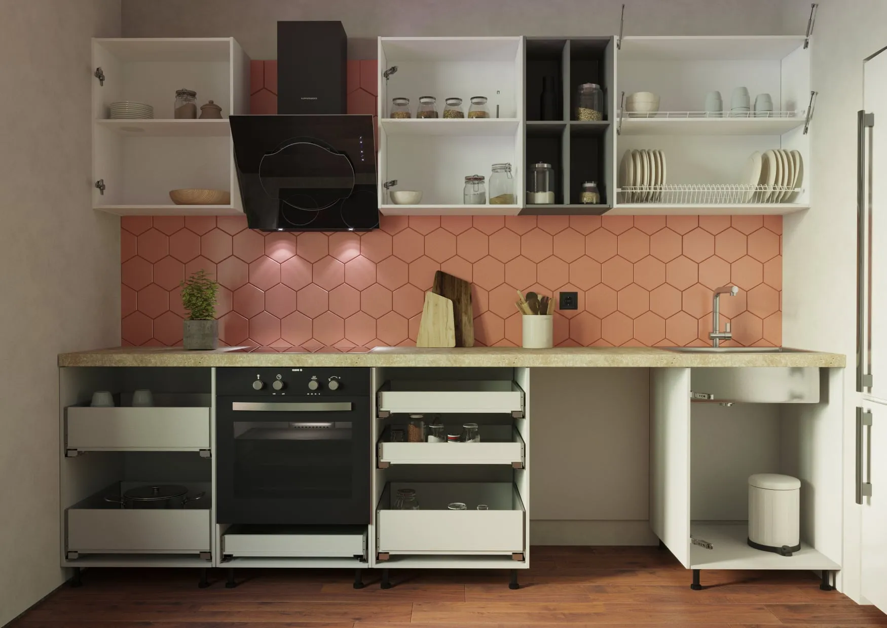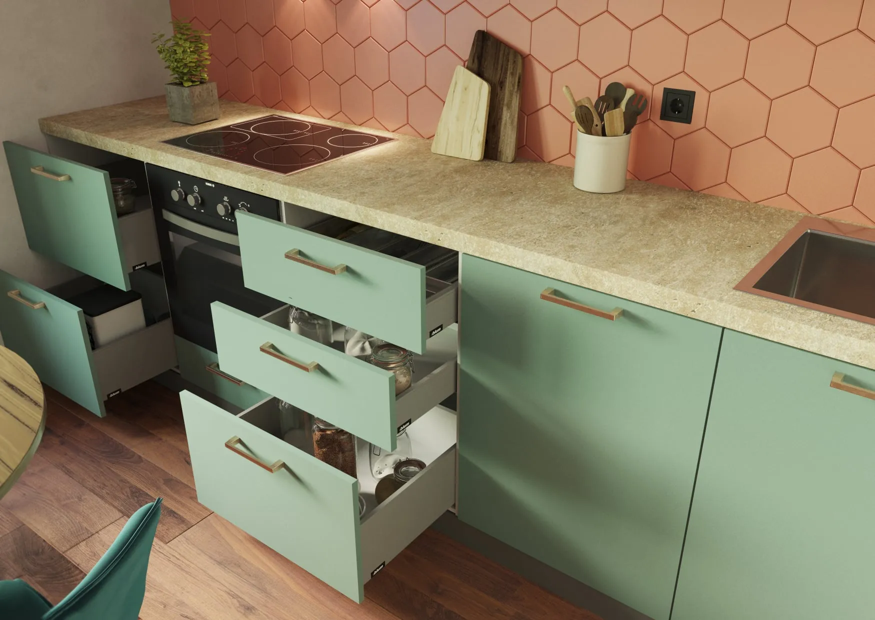 Механизмы открывания: петли Intermat (Hettich), направляющие Quadro 25 (Hettich)
