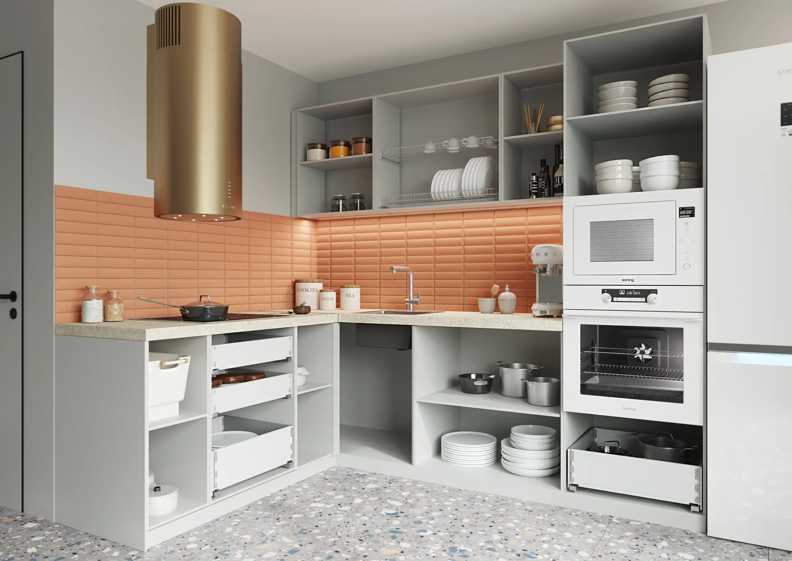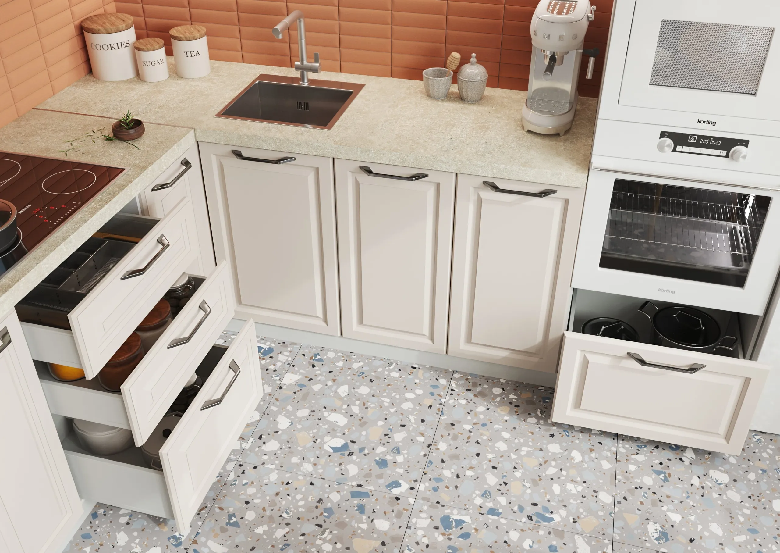 Механизмы открывания: петли BOYARD с доводчиком, направляющие Quadro 25 (Hettich)