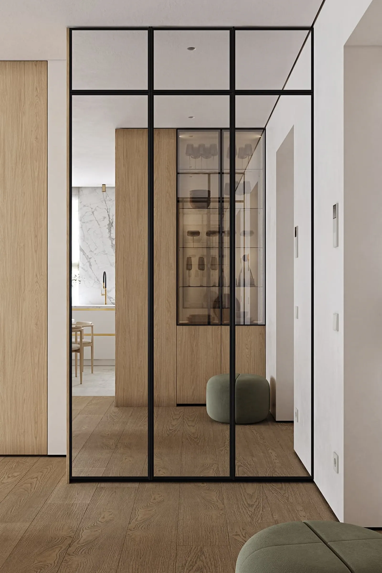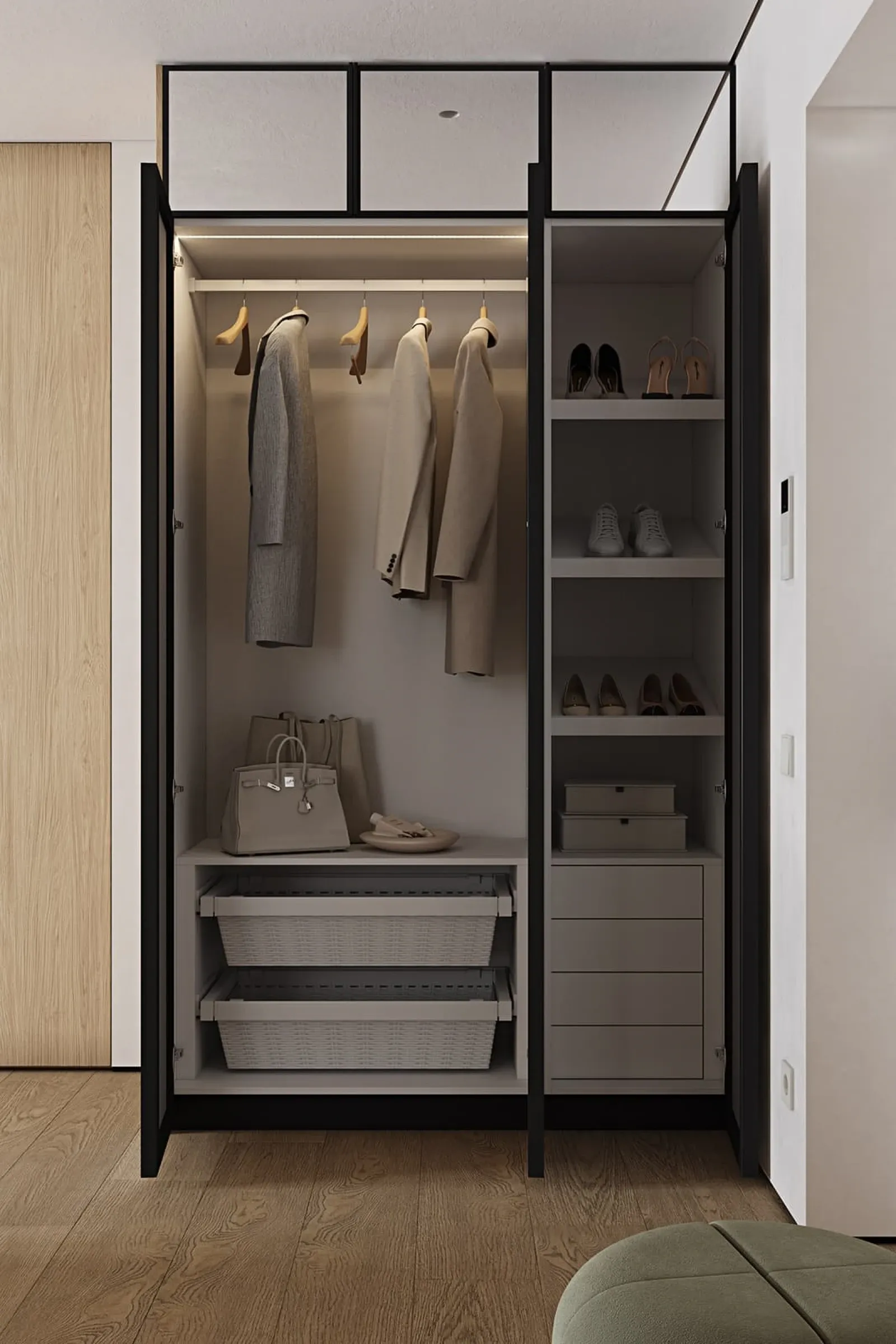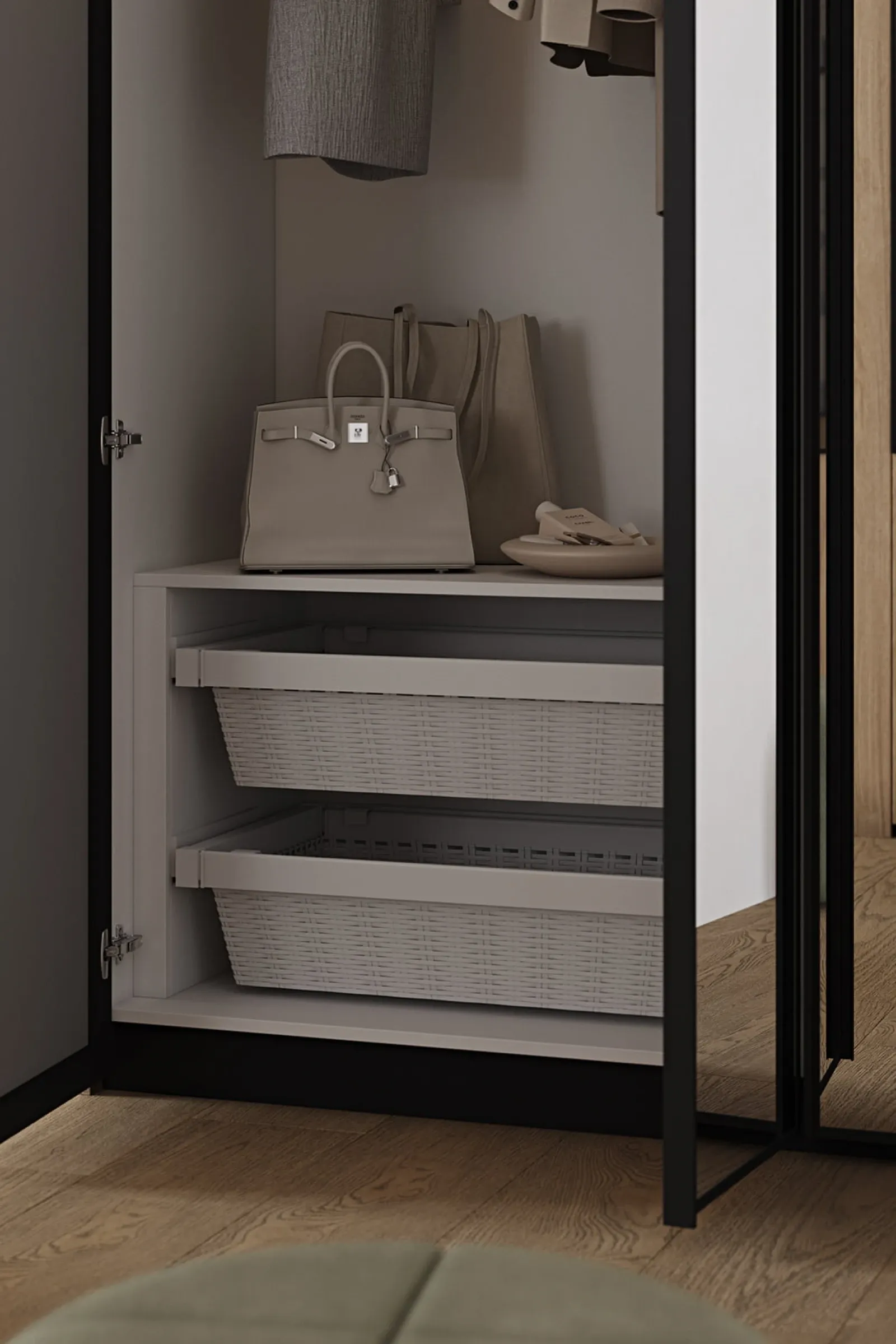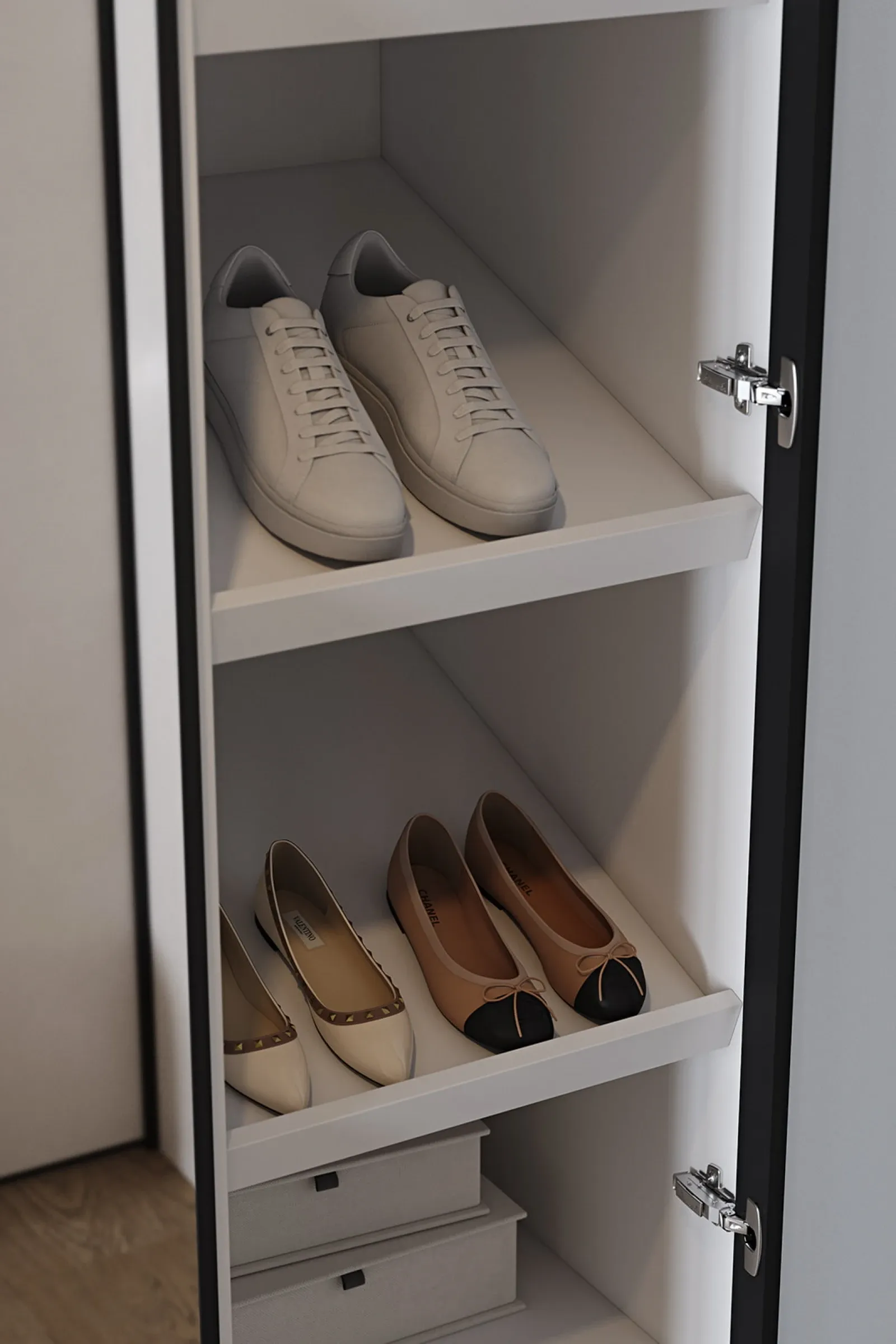 КАРКАС, ПОЛКИ, ВНУТРЕННИЕ ВЫДВИЖНЫЕ ЯЩИКИ / ЗАДНЯЯ СТЕНКА ЛДСП, цвет Белый Премиум / Белый ФАСАДЫ Алюминиевый профиль А - 2 Терра Черная (ручка - профиль С - 5, угол запила 90˚), зеркало