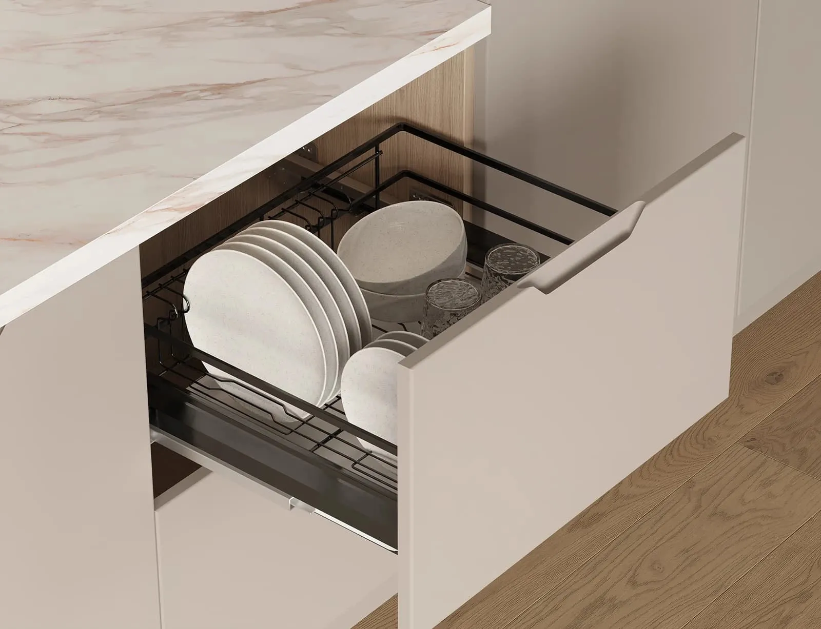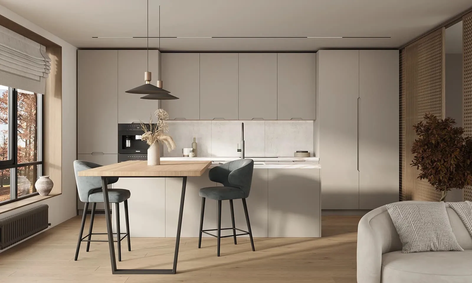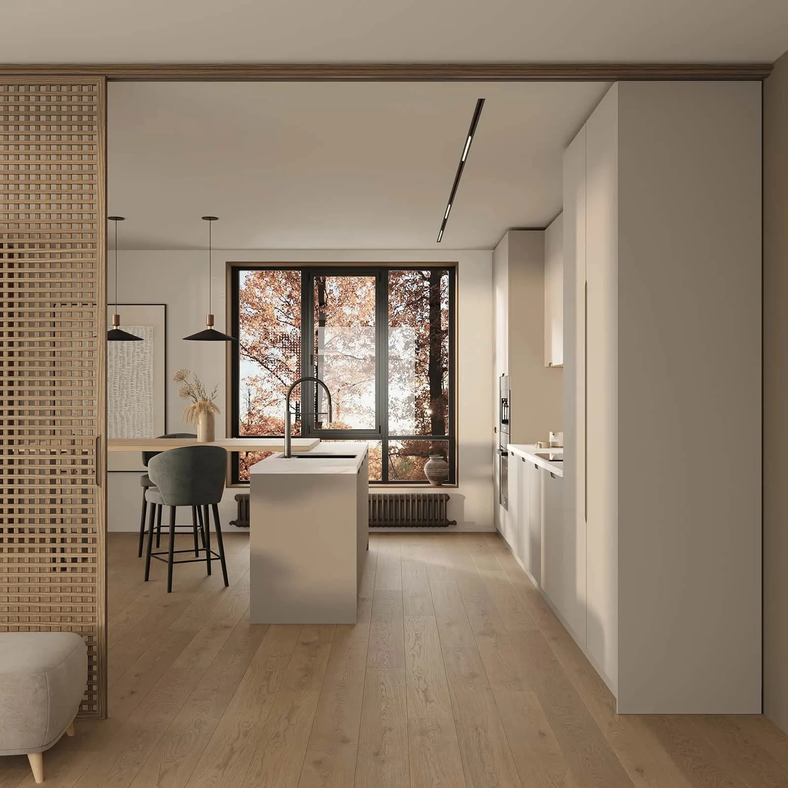 ФАСАДЫ Т622 / T619 Крашеная МДФ, цвет NCS S 2002-Y Матовый СТОЛЕШНИЦА Пластик HPL, 38 мм, декор Энцо / КС массив дуба, 38 мм, цвет #189 (воскобейц Белый)