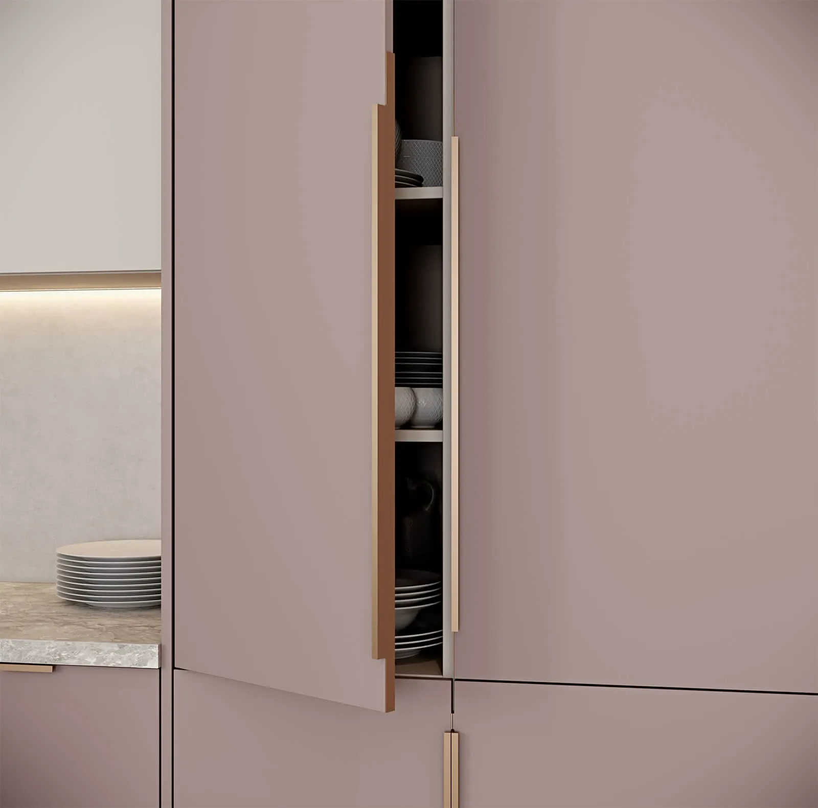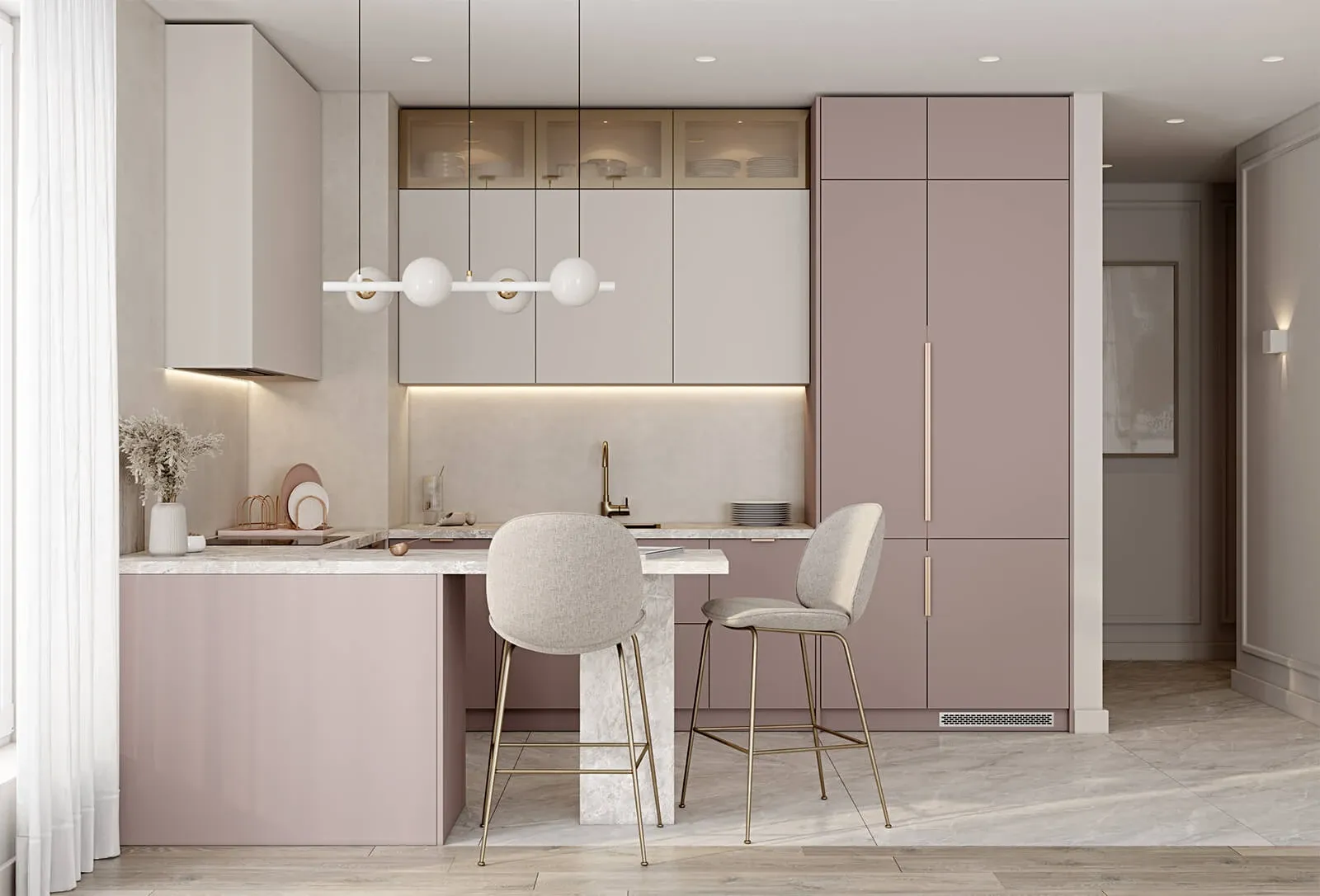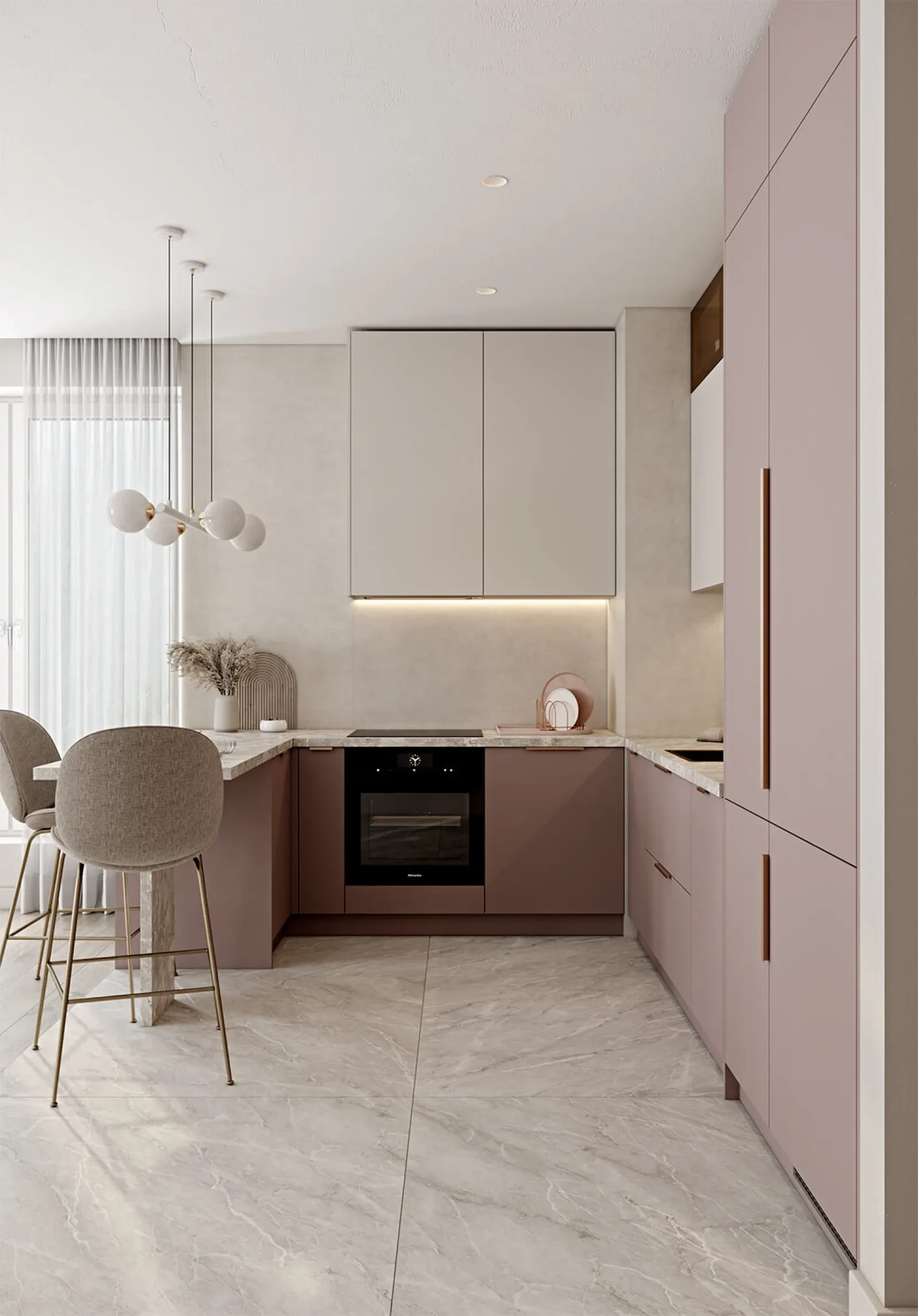 ФАСАДЫ ЛМДФ SUPRAMAT, цвет Дэйзи Супрамат / Сахара Супрамат СТОЛЕШНИЦА HPL, 38 мм, декор Римский Камень