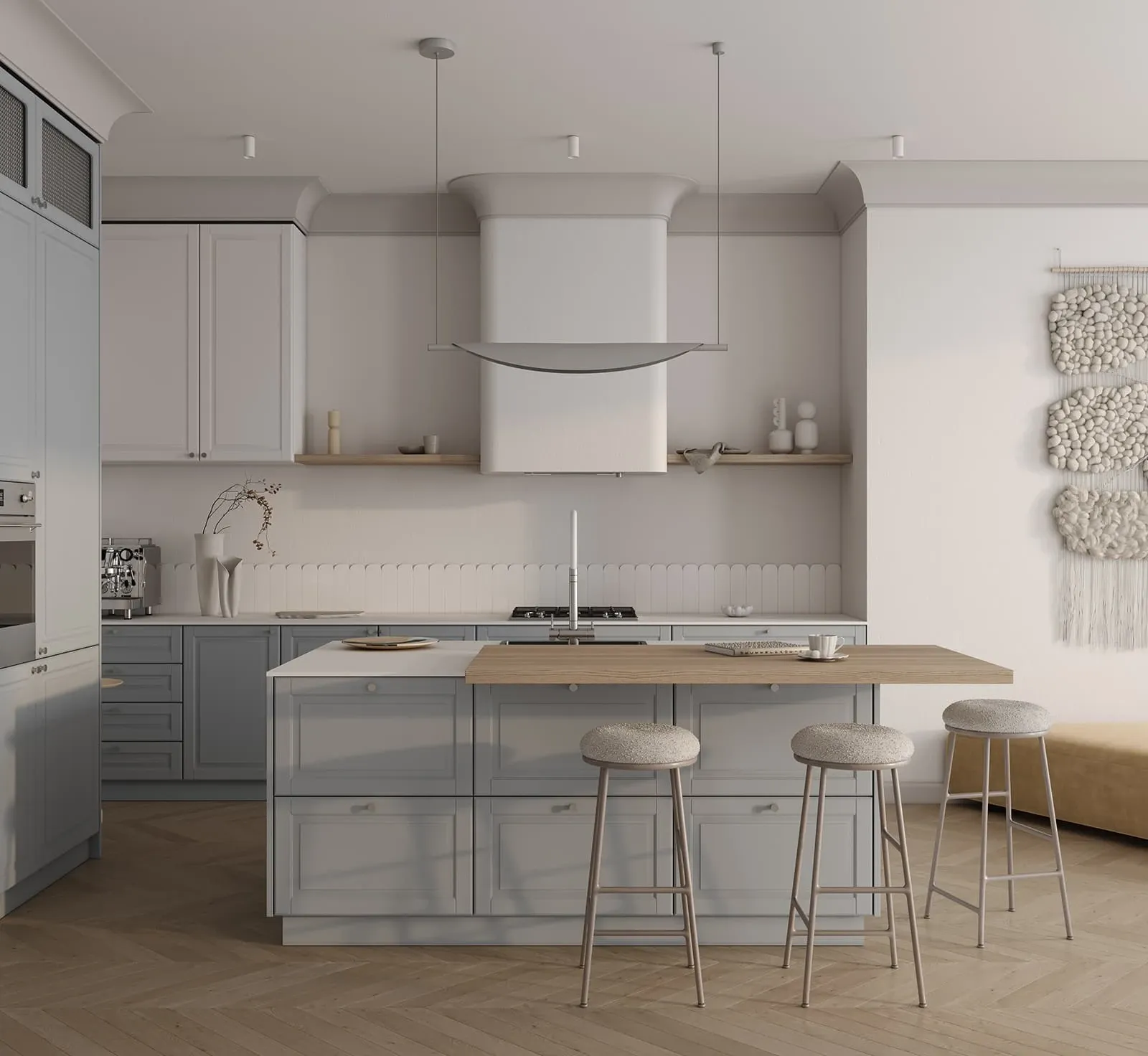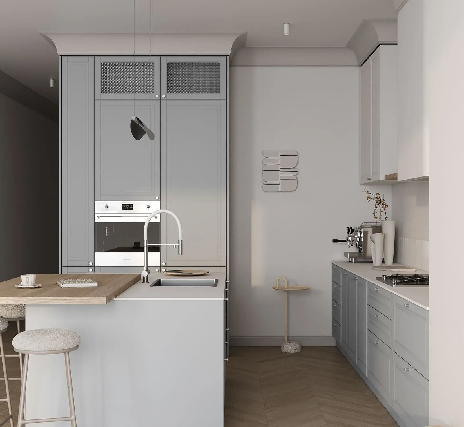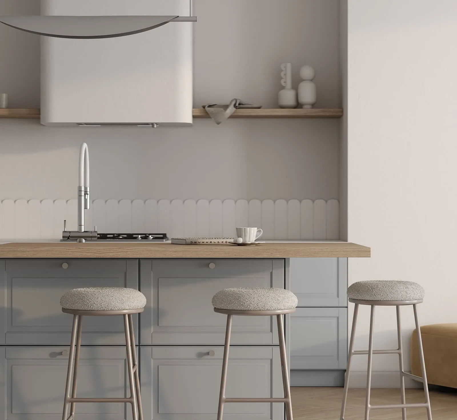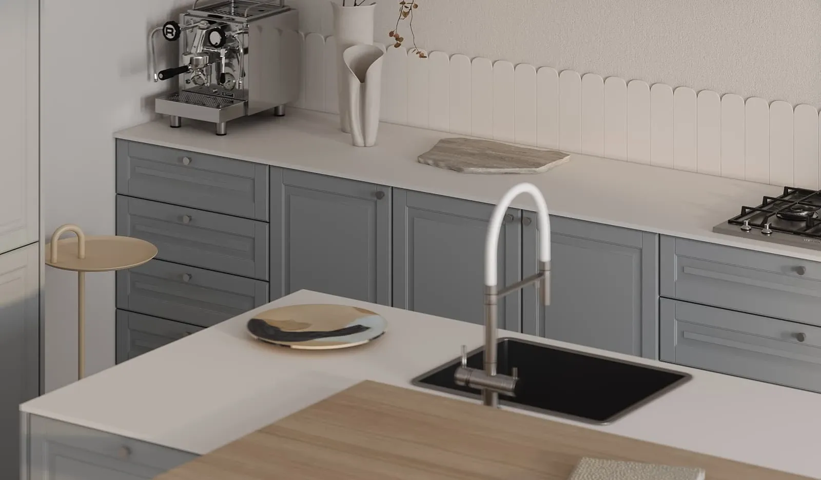 ФАСАДЫ Фаби (МДФ/ПВХ), цвет NCS S 2010-B10G Матовый / NCS S 0500-N Матовый СТОЛЕШНИЦА Компакт-плита, 12 мм / пластик HPL, 38 мм
