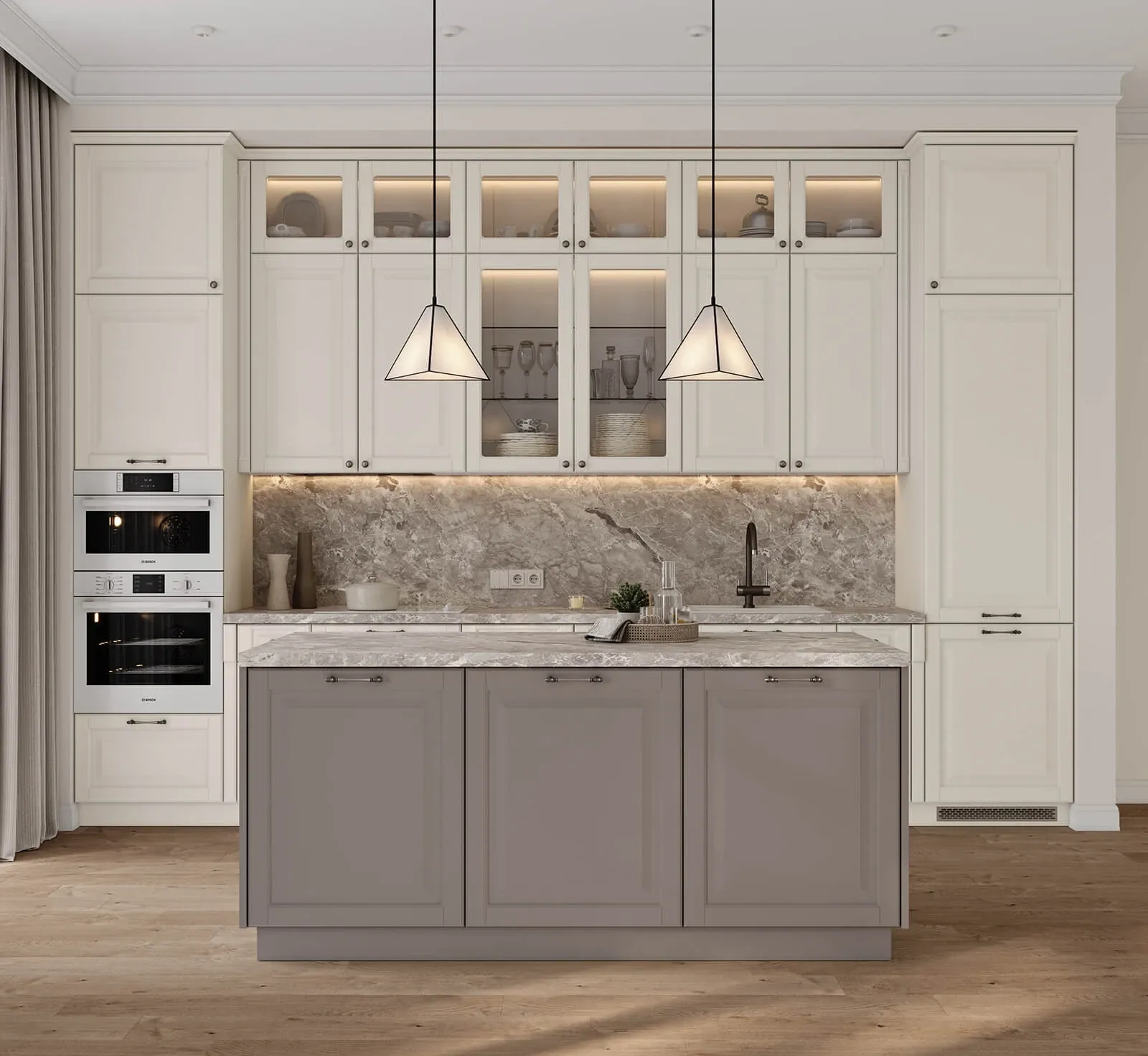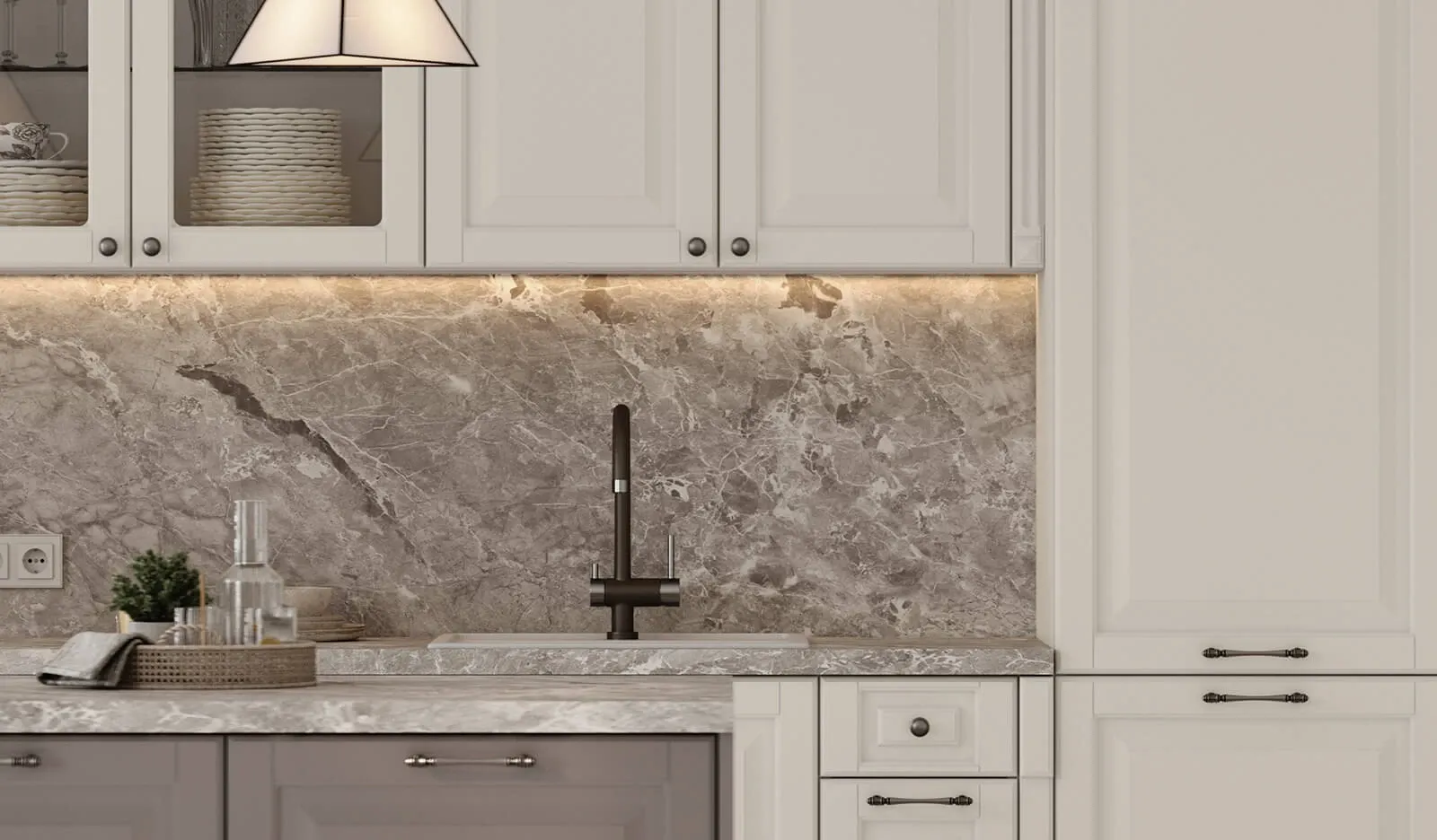 ФАСАДЫ Клайд (МДФ/ПВХ/PET), цвет Кубанит Серый Ф / Молочный PET СТОЛЕШНИЦА Пластик HPL, 38 мм, декор Римский Камень