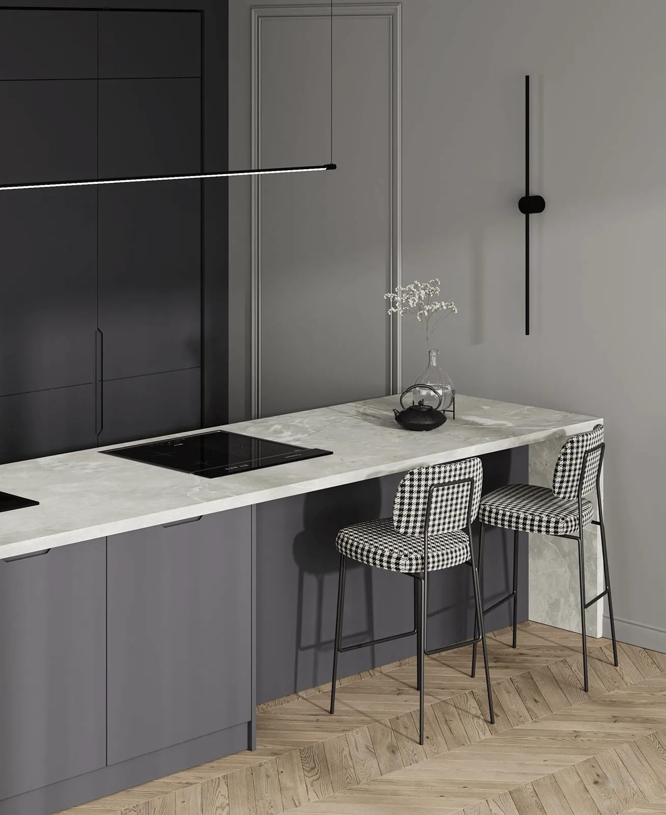 Кухня АЗУР создает атмосферу свободу стиля ЛОФТ, совмещая в себе функциональность и изысканность. Темные фасады кухонных шкафов, изготовленные из МДФ и окутанные Эмалью, придают помещению особую нотку шика и роскоши. Они не только выглядят изысканно, но и идеально вписываются в современные тренды дизайна интерьера. Такой выбор цвета придает кухне современный вид, избавляя ее от обыденности и обычного подхода