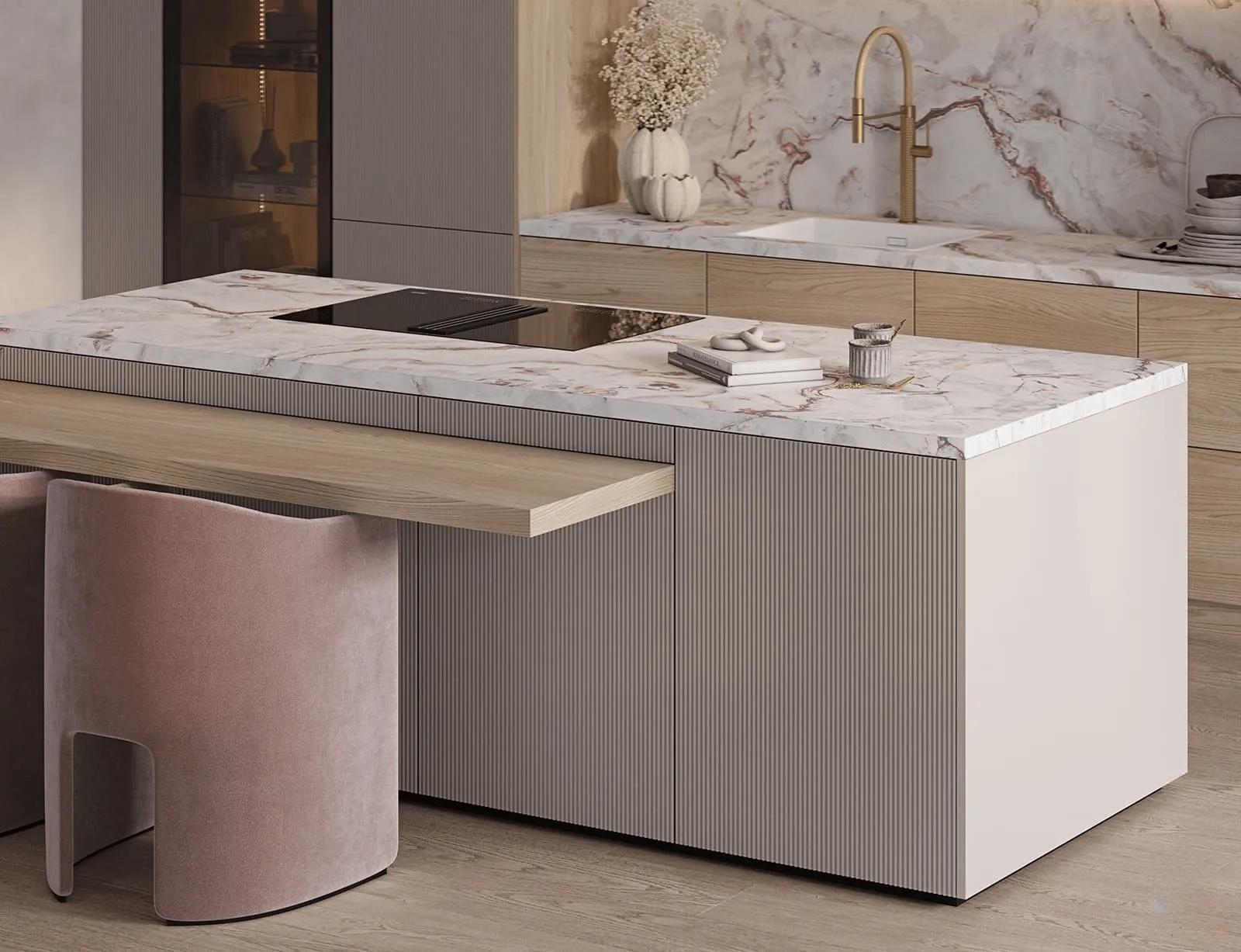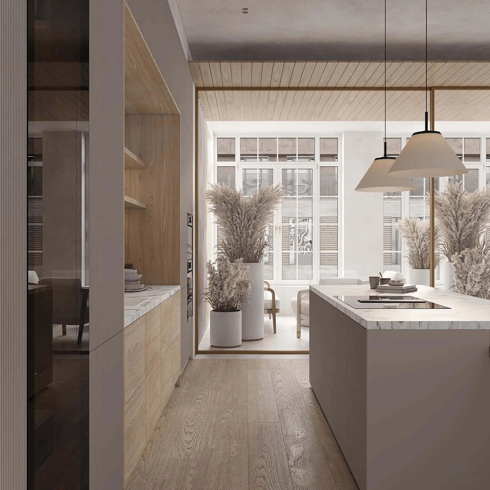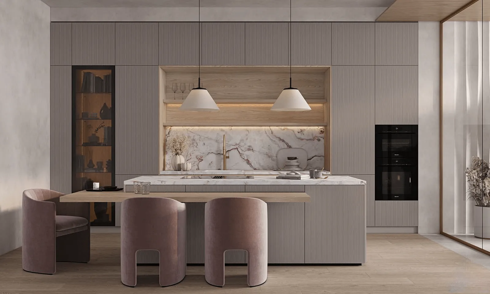 Фасады: Т645 Крашеная МДФ, цвет NCS S 2000-N Матовый / Т419Г Шпон дуба, цвет #189 (воскобейц Белый).