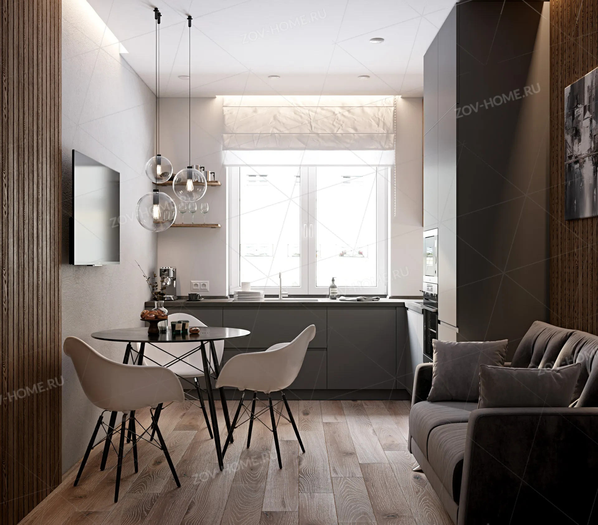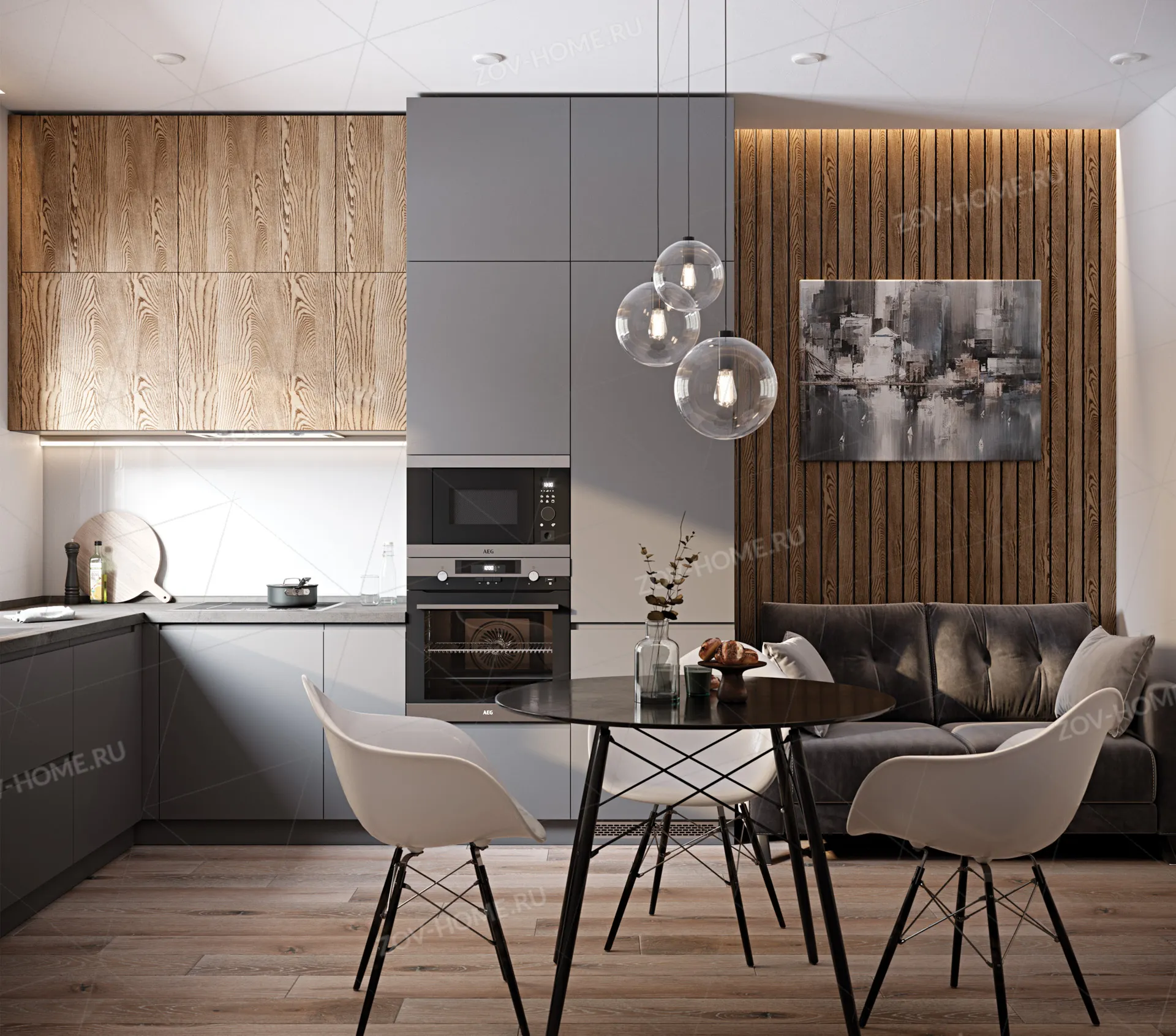 Фасады: Крашеная МДФ, цвет NCS S 6000-N Матовый / Т219В Шпон ясеня, цвет #181 воскобейц Орех