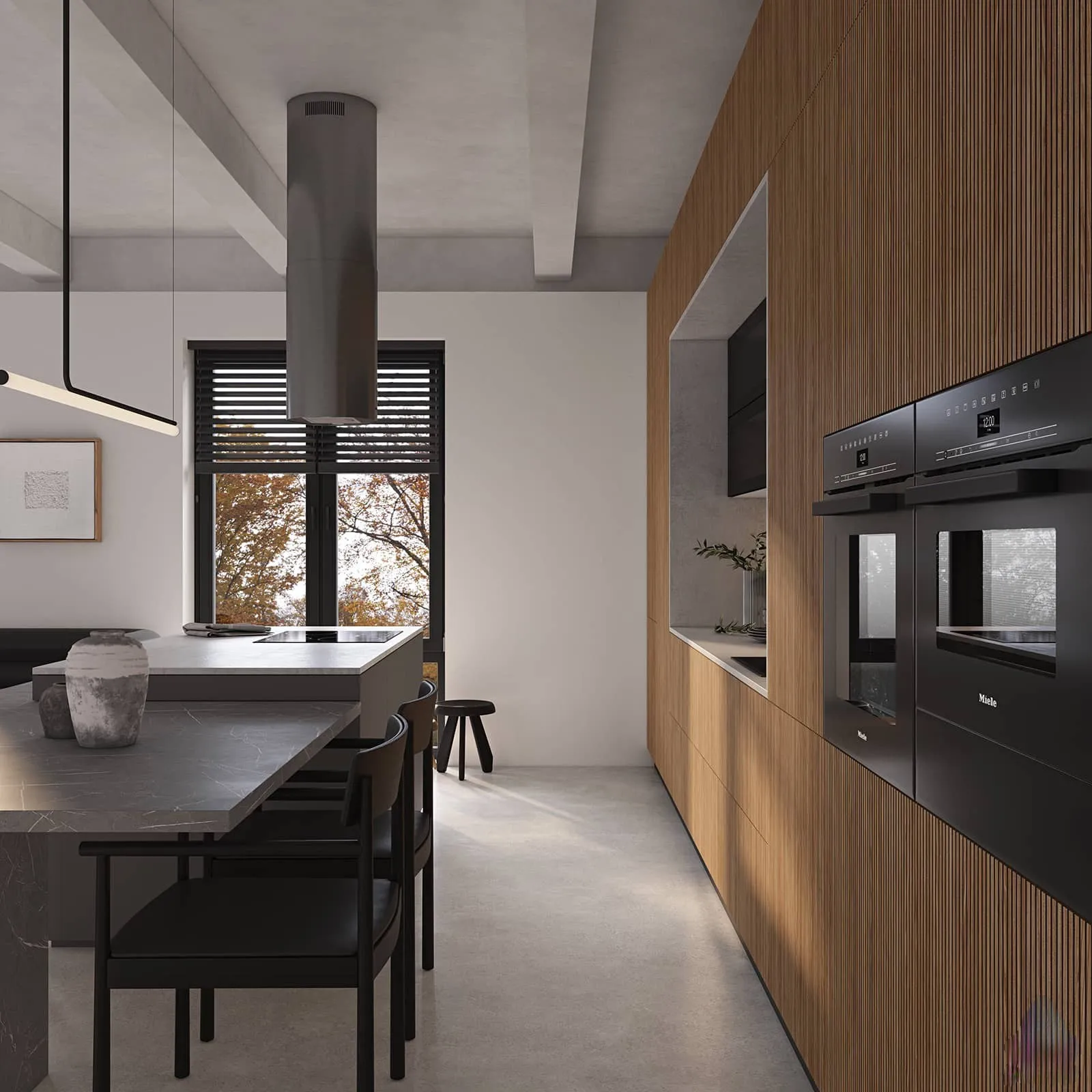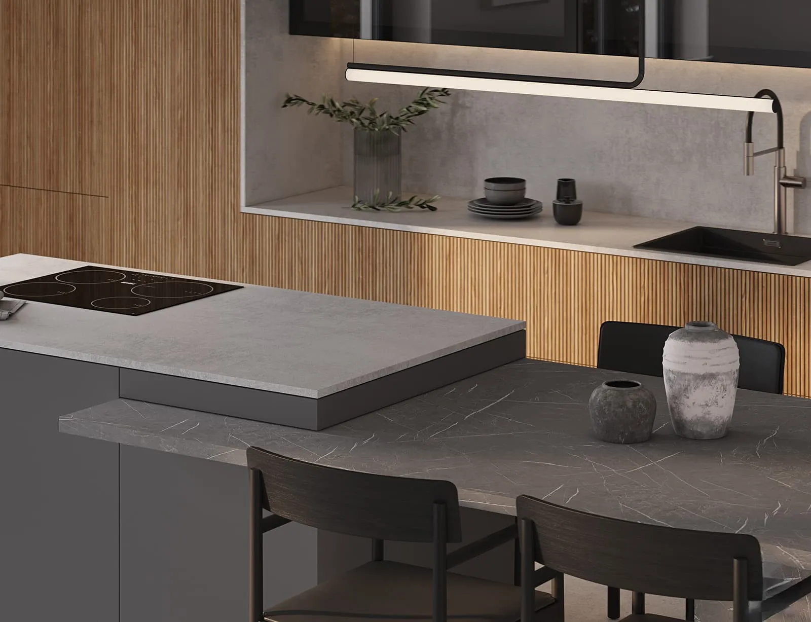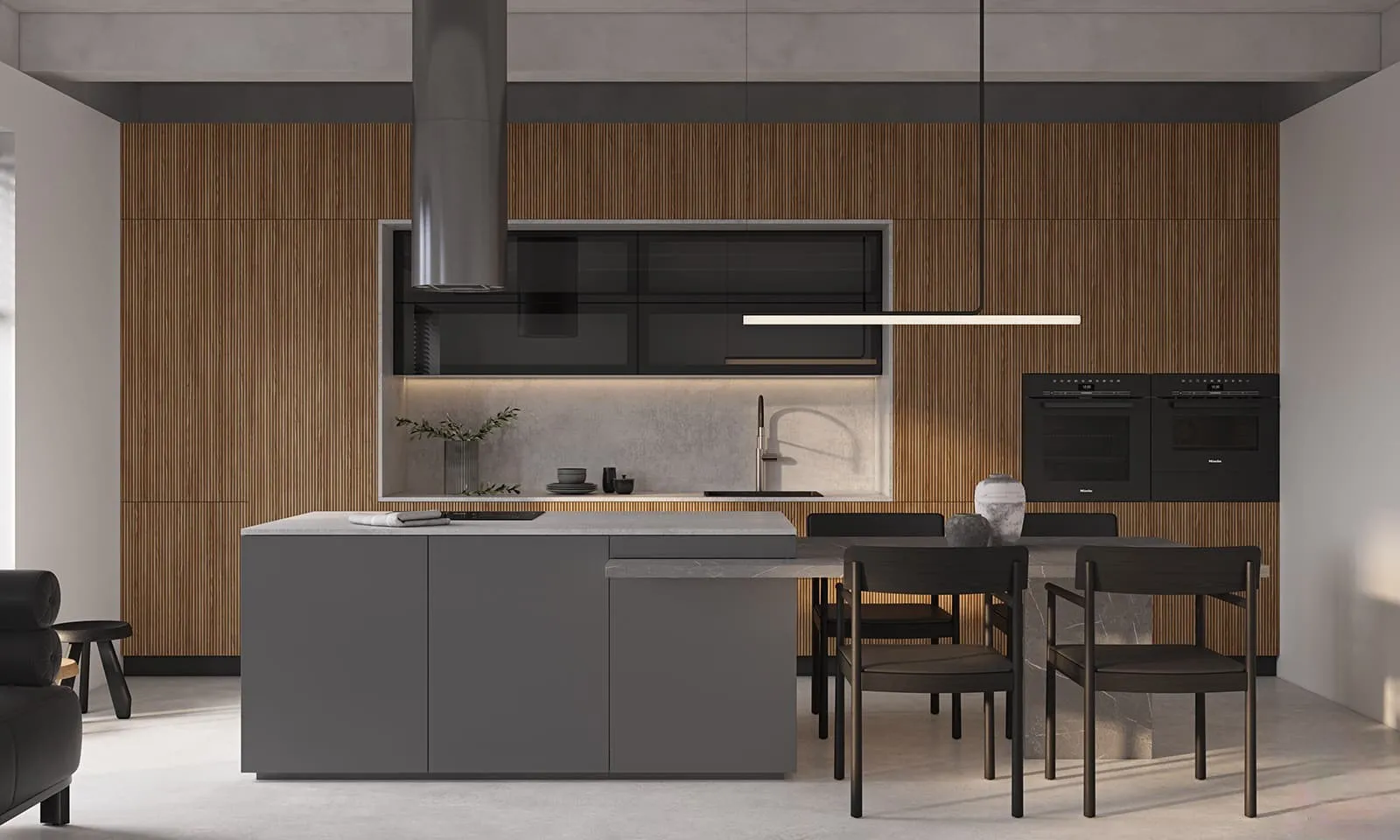 Фасады: T434 Шпон дуба, цвет #111 / акрил Fenix NTM, цвет Серо-синий NTM (0724).
