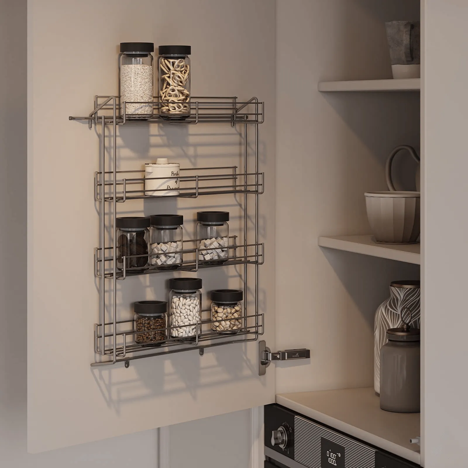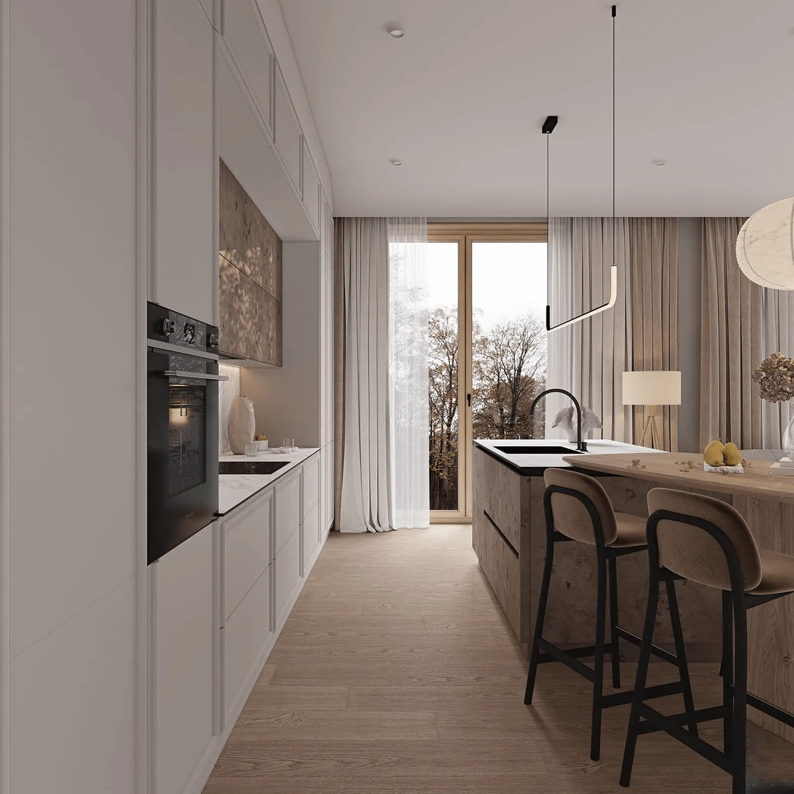 Фасады: Т648 Крашеная МДФ / массив ольхи, цвет 156; ЛДСП Синкрон, декор Титанио.
