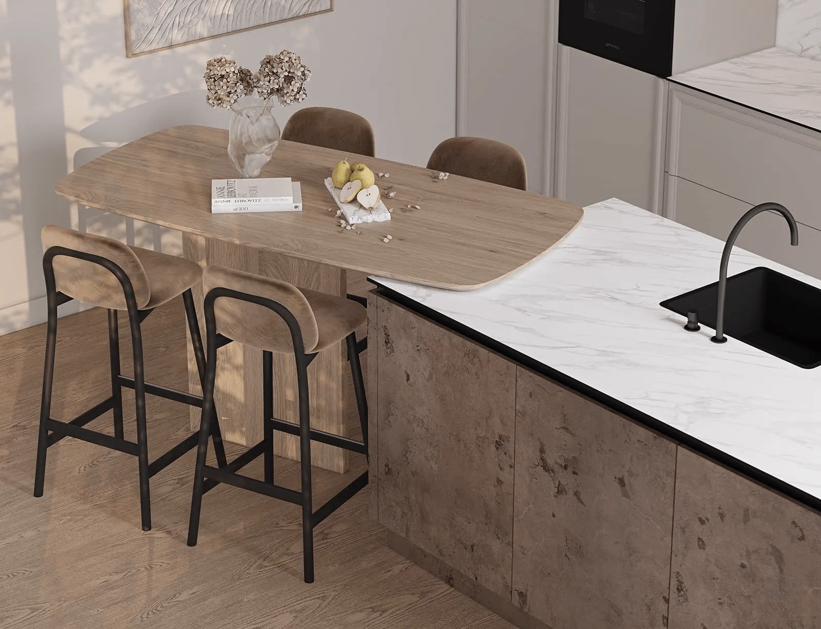 Столешница: Компакт-плита, 12 мм, декор Мрамор Олимпия / массив дуба, 38 мм (скос 30˚), цвет #183 (масловоск Бесцветный).