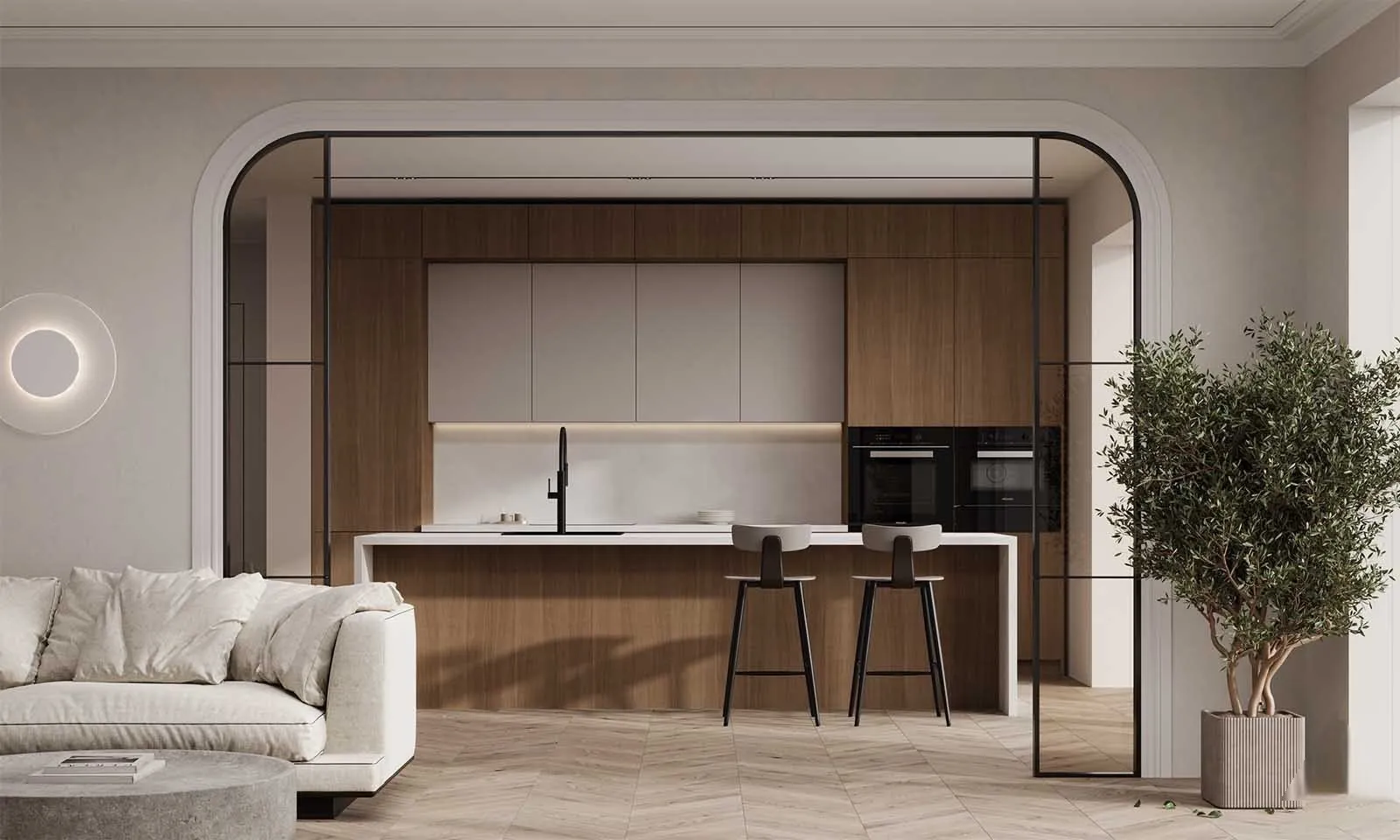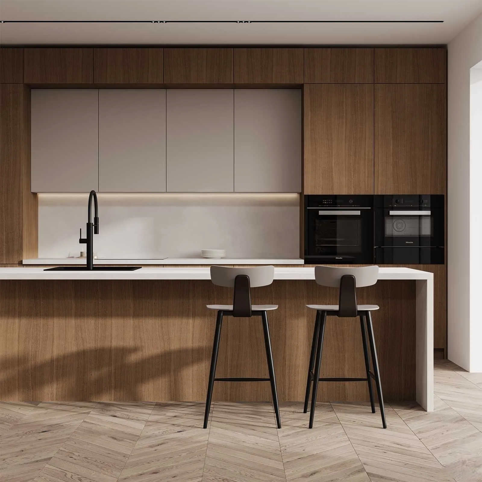 Фасады: ЛМДФ, цвет Сахара Супрамат / Т419В Шпон дуба, цвет #181 (воскобейц Орех).