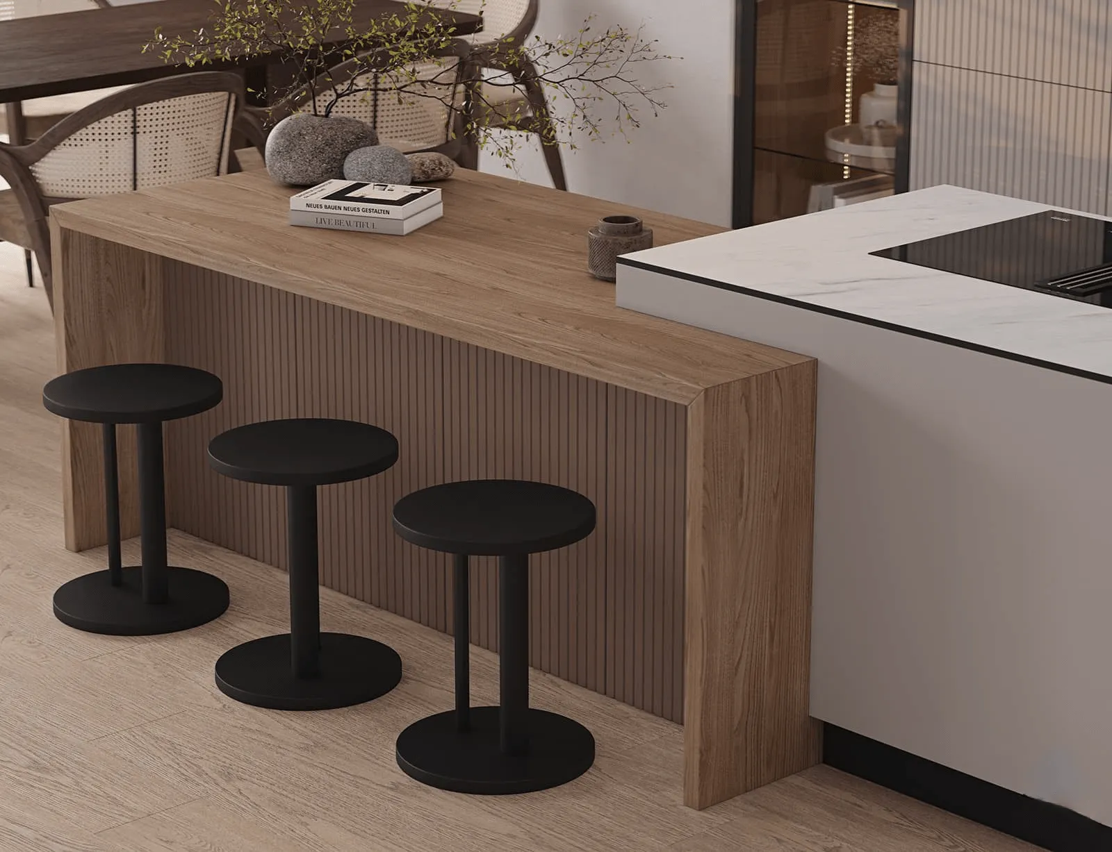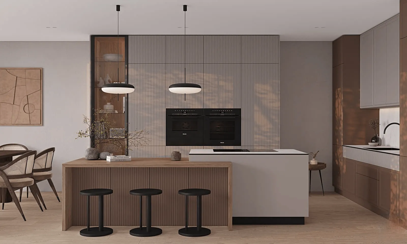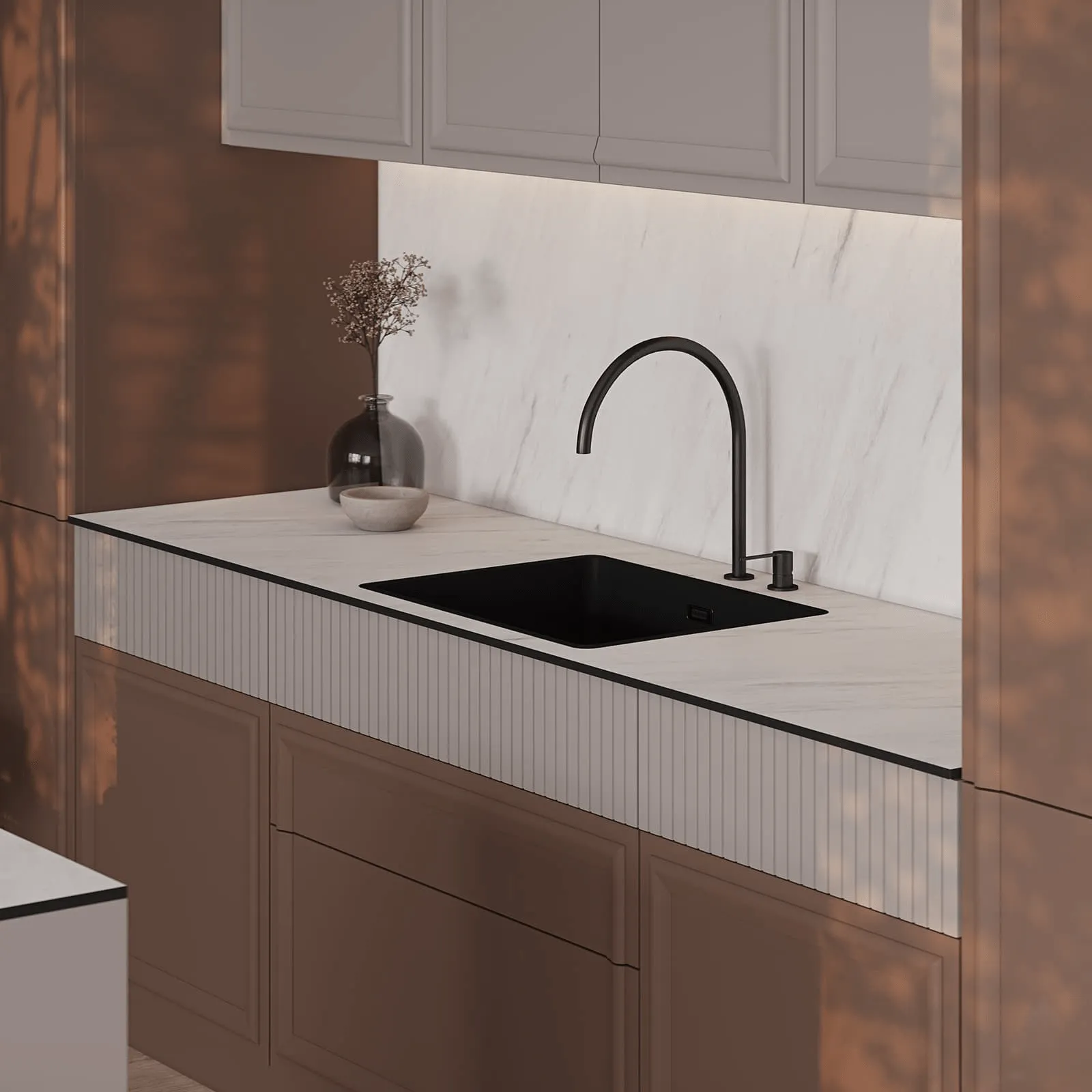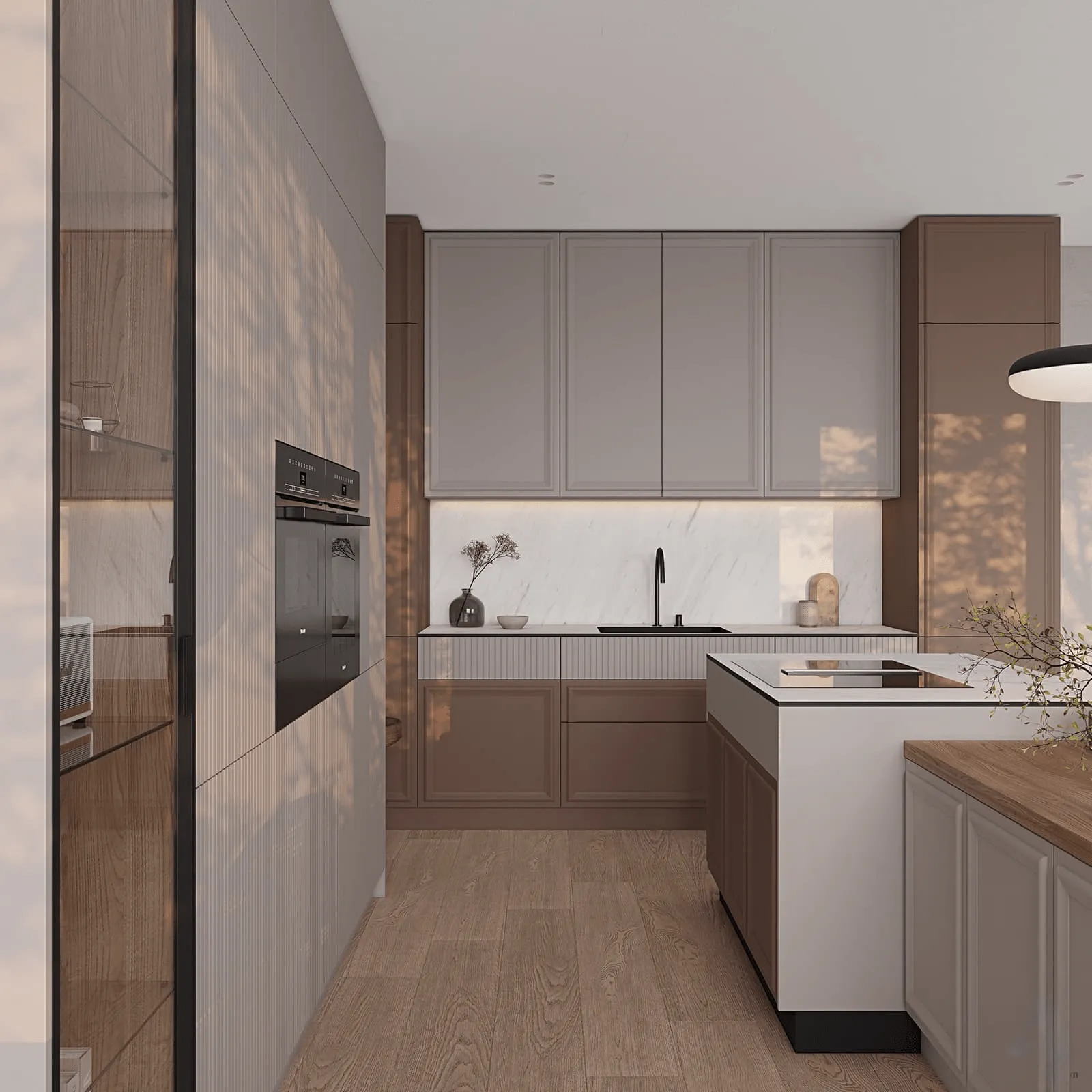 Фасады: Т682 Крашеная МДФ, цвет NCS S 2500-N Матовый / NCS S 6010-Y70R Матовый; Т651 Крашеная МДФ / массив ольхи, цвет NCS S 2500-N Матовый / NCS S 6010-Y70R Матовый.
