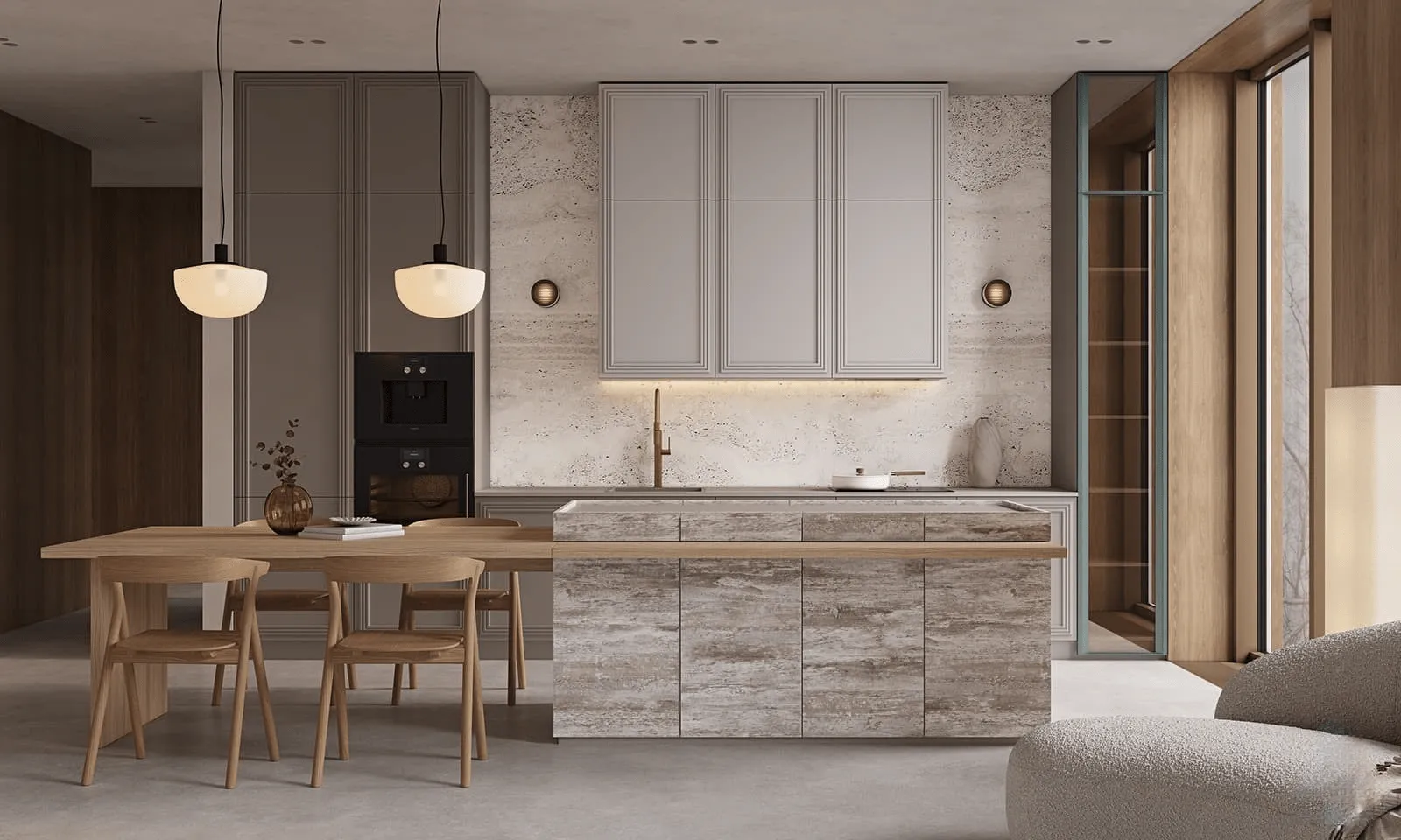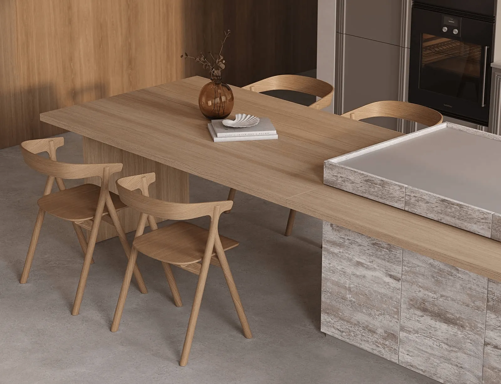 Столешница: Акрил Fenix NTM, 20 мм, цвет Серо-бежевый NTM (0748) / КС массив дуба, 38 мм, цвет #183 (масловоск Бесцветный).Механизмы открывания: Push to open.