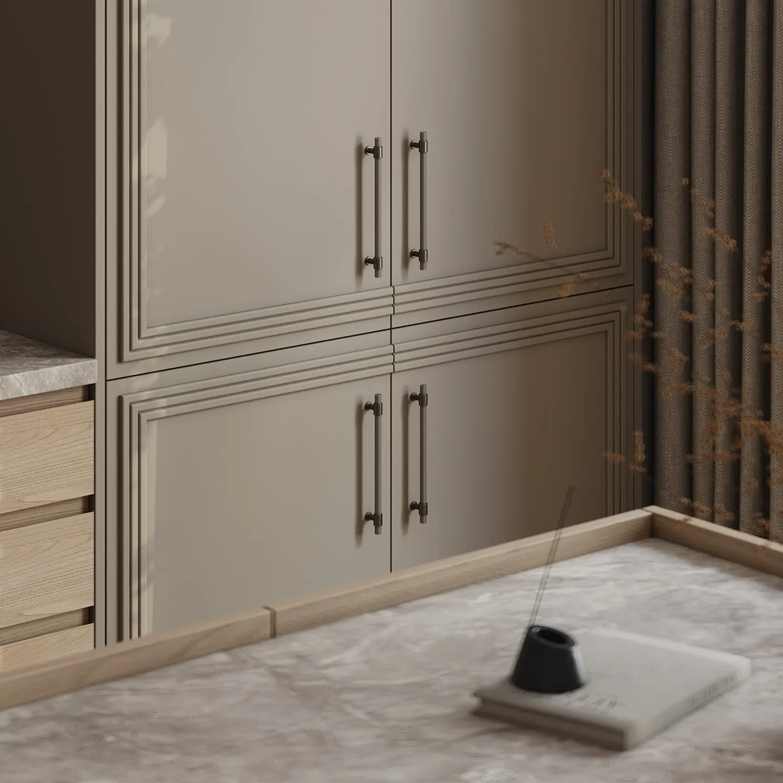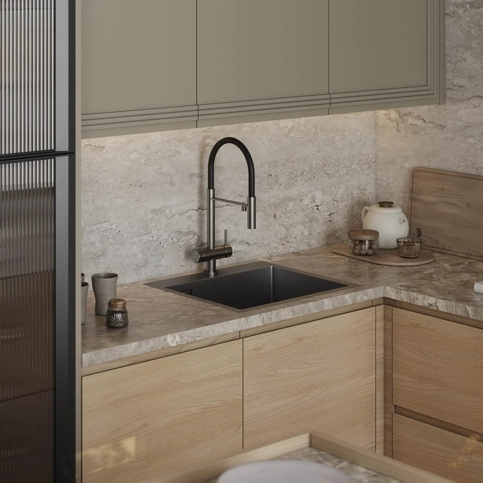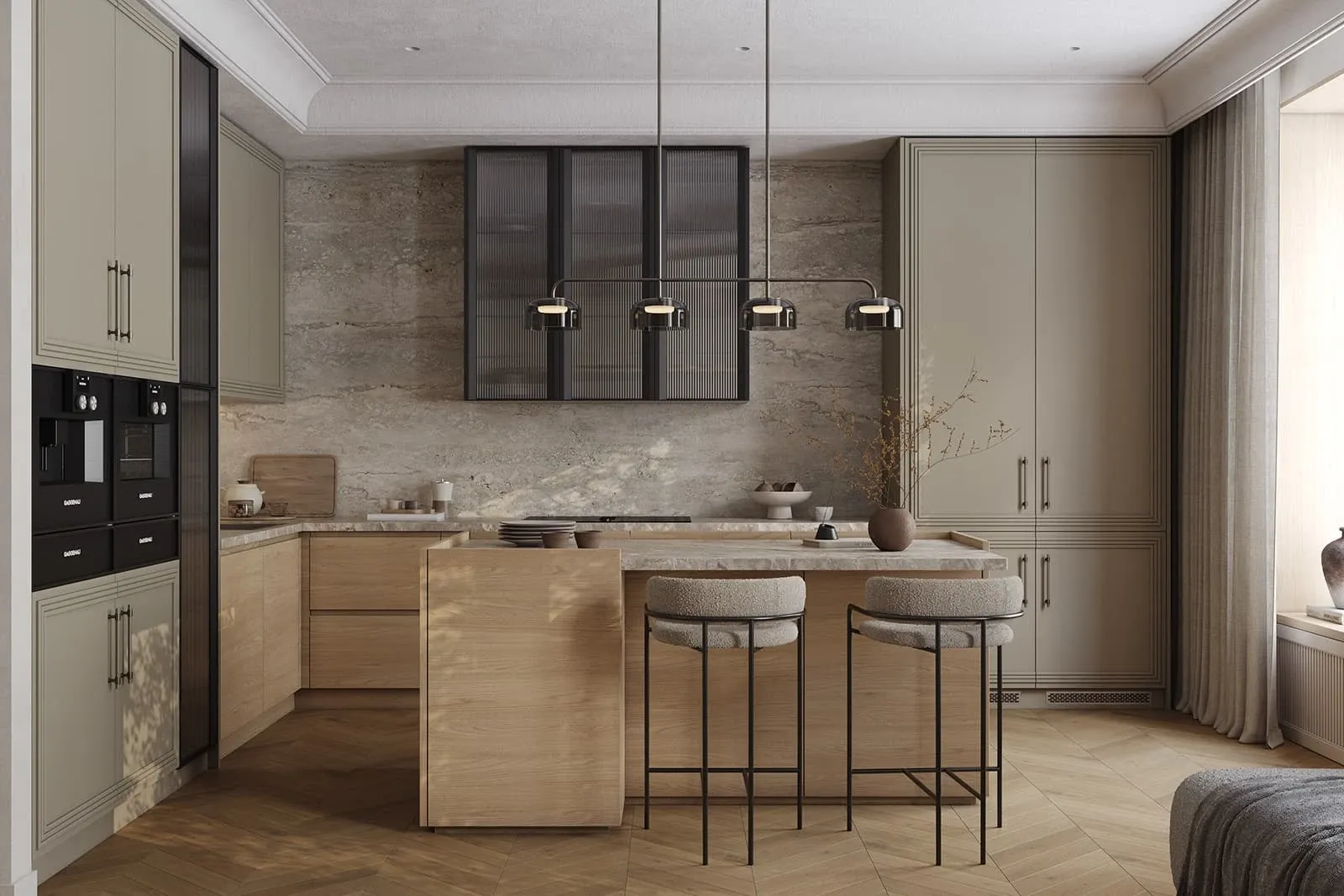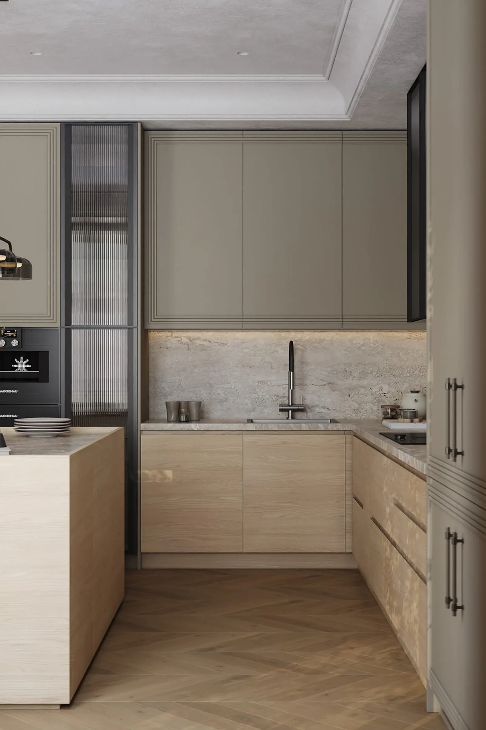 Фасады: Т422 / Т419Г Шпон дуба, цвет #183 (масловоск Бесцветный) / Т650 Крашеная МДФ, цвет NCS S 4005-G80Y Матовый