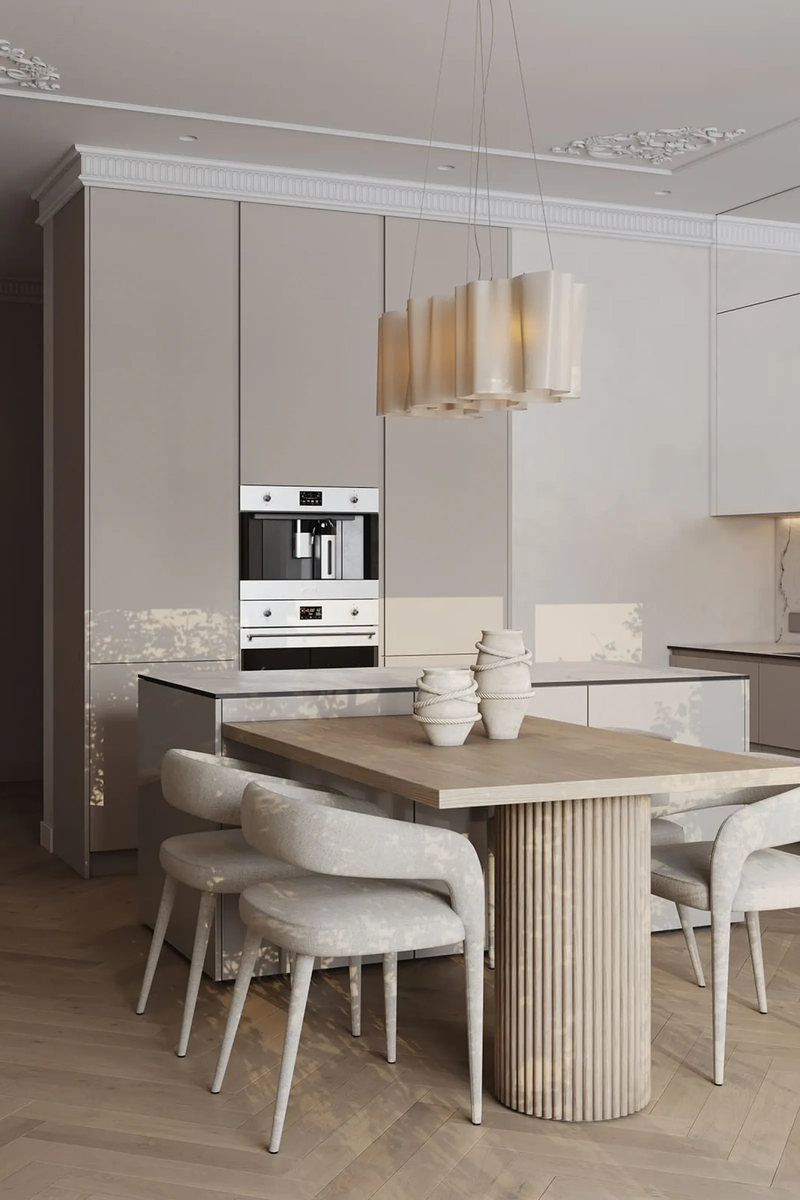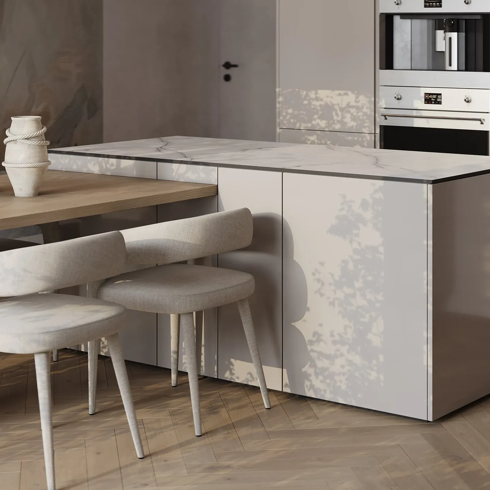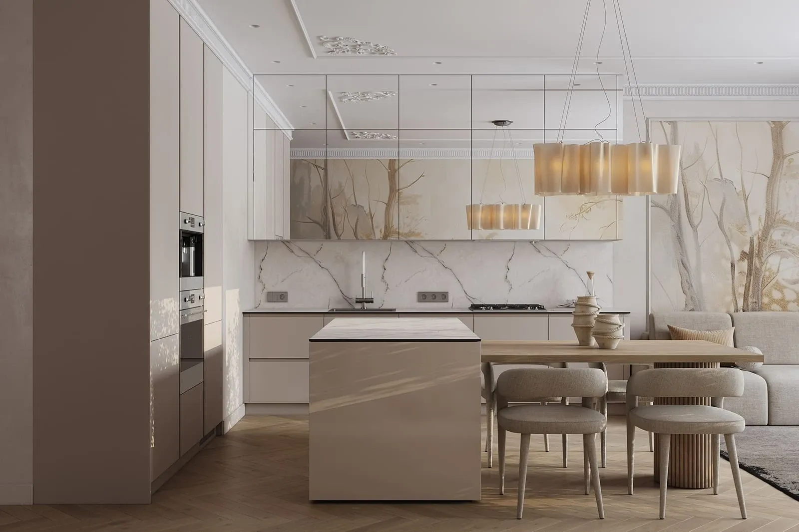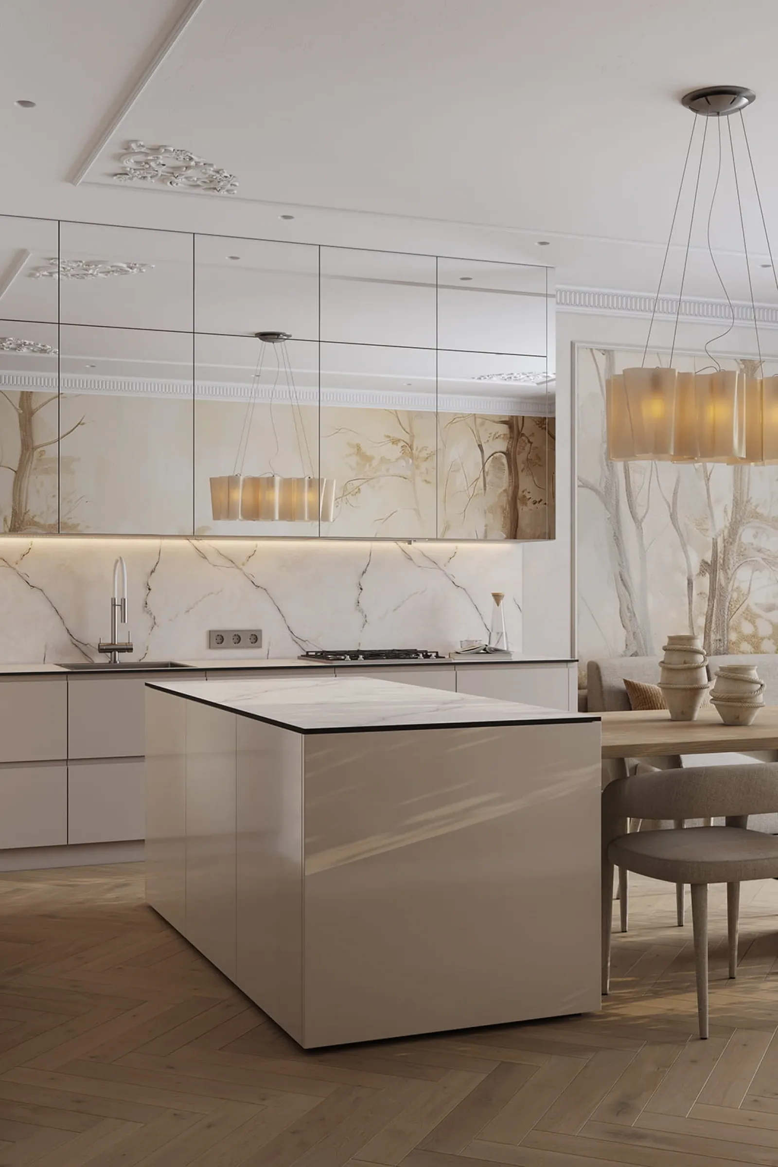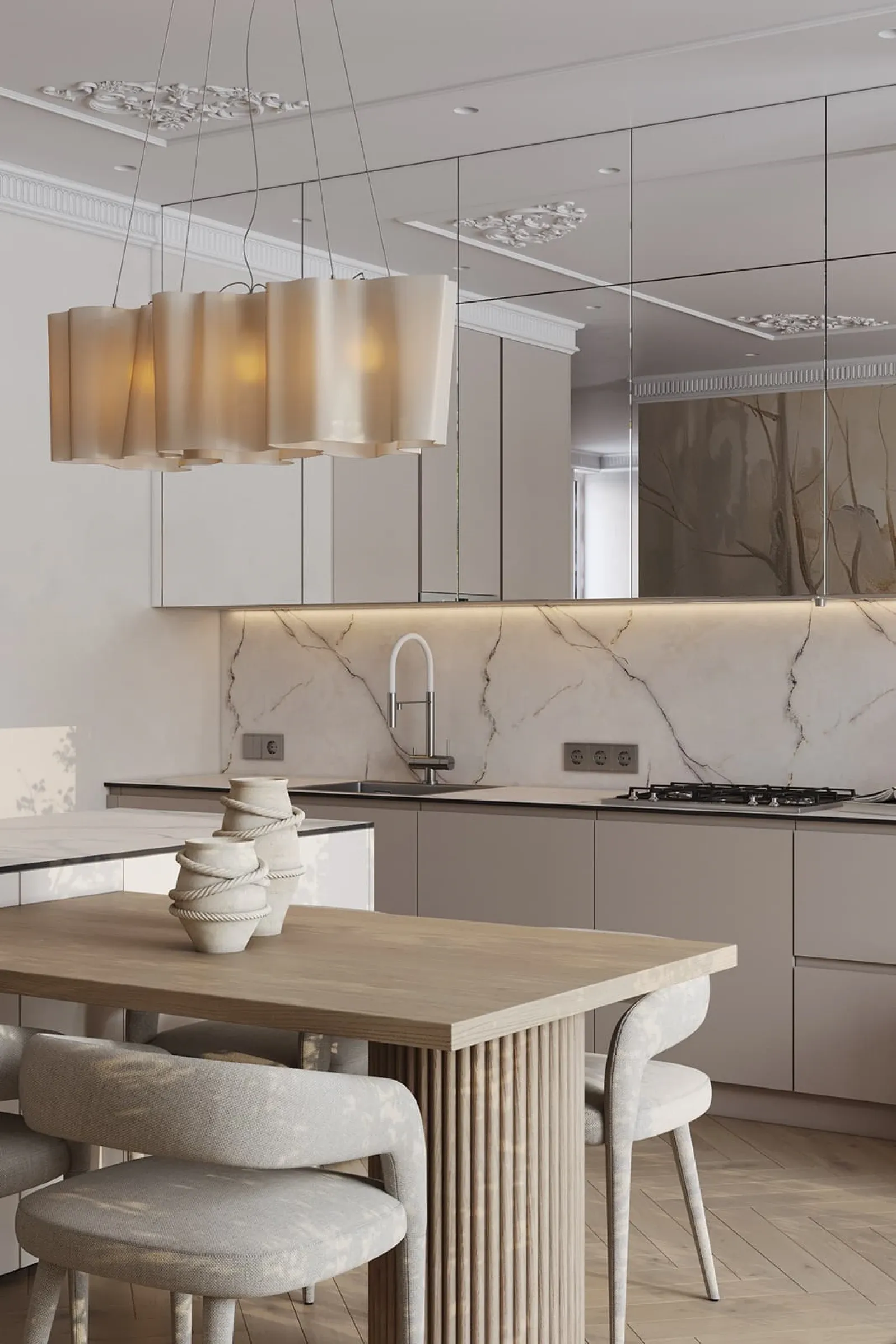 Фасады: Крашеная МДФ, цвет NCS S 2002-Y50R Матовый / акрил Глянец, цвет Тальк / зеркало