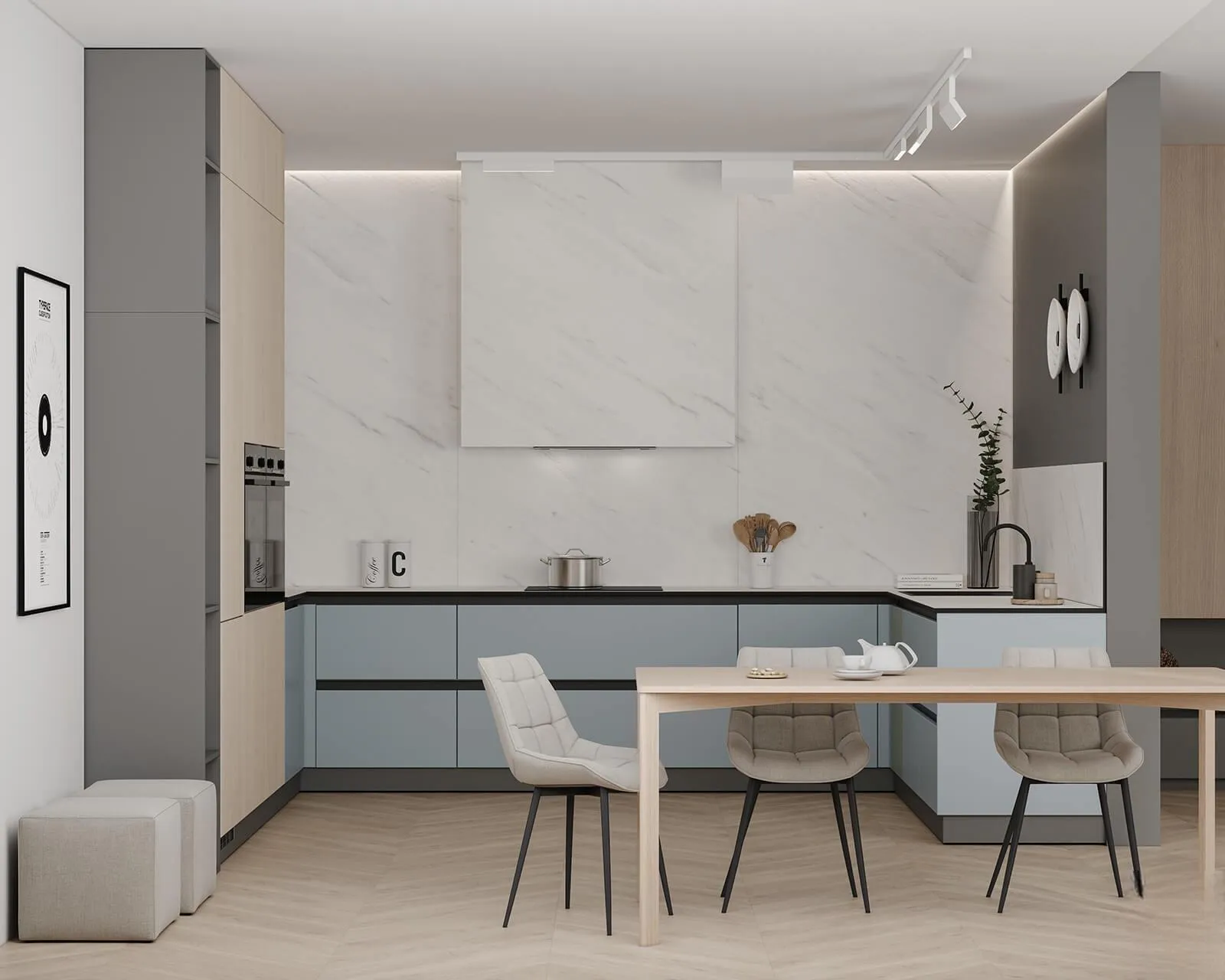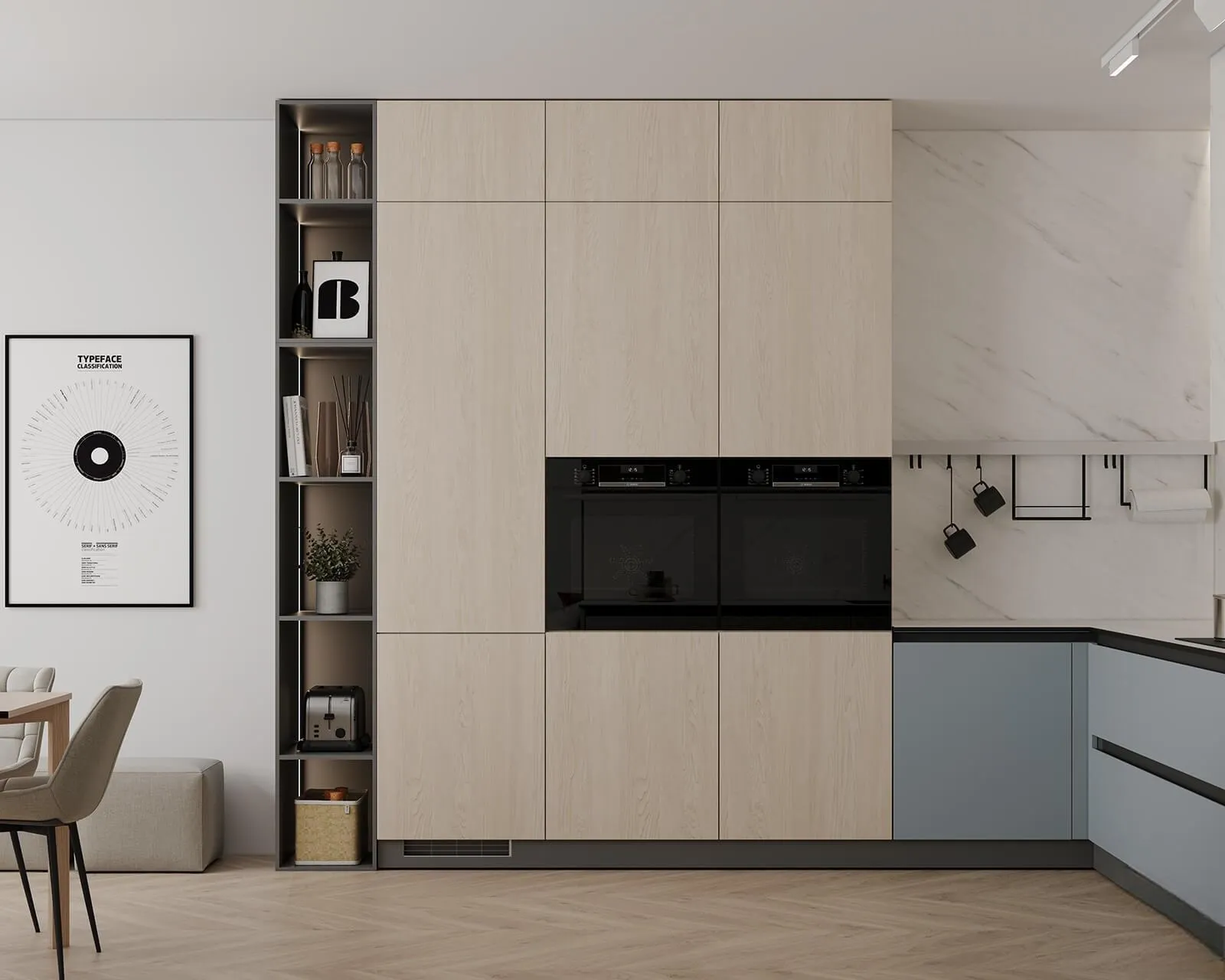 Фасады: Акрил TopMatt, цвет Ниагара Мат, Темно-серый Мат / Т419В Шпон дуба, цвет #189 воскобейц Белый