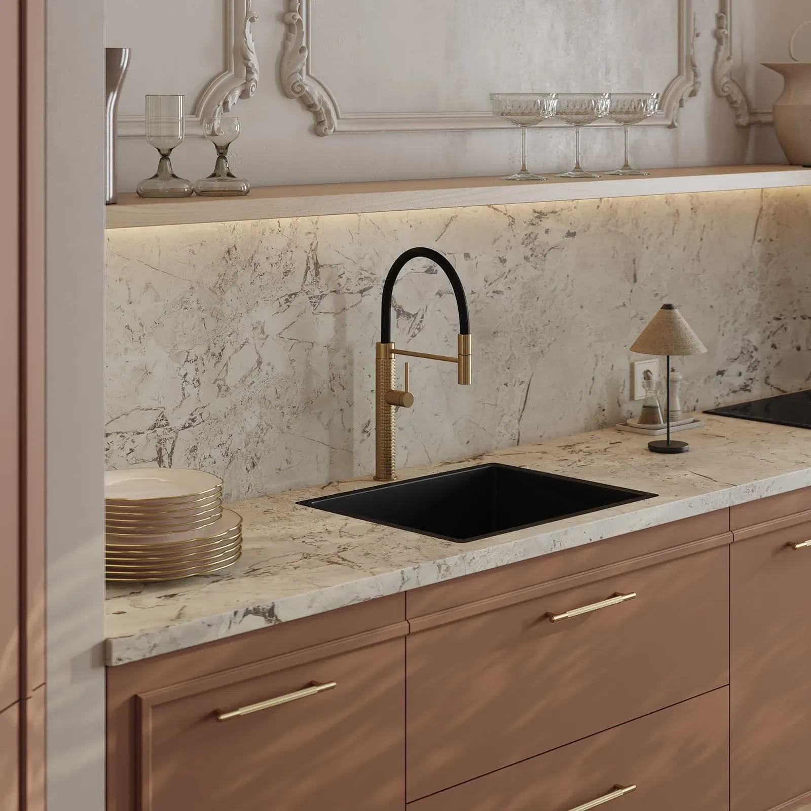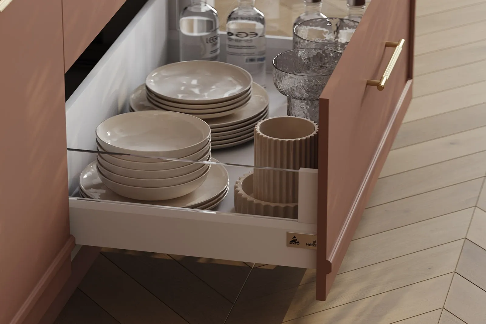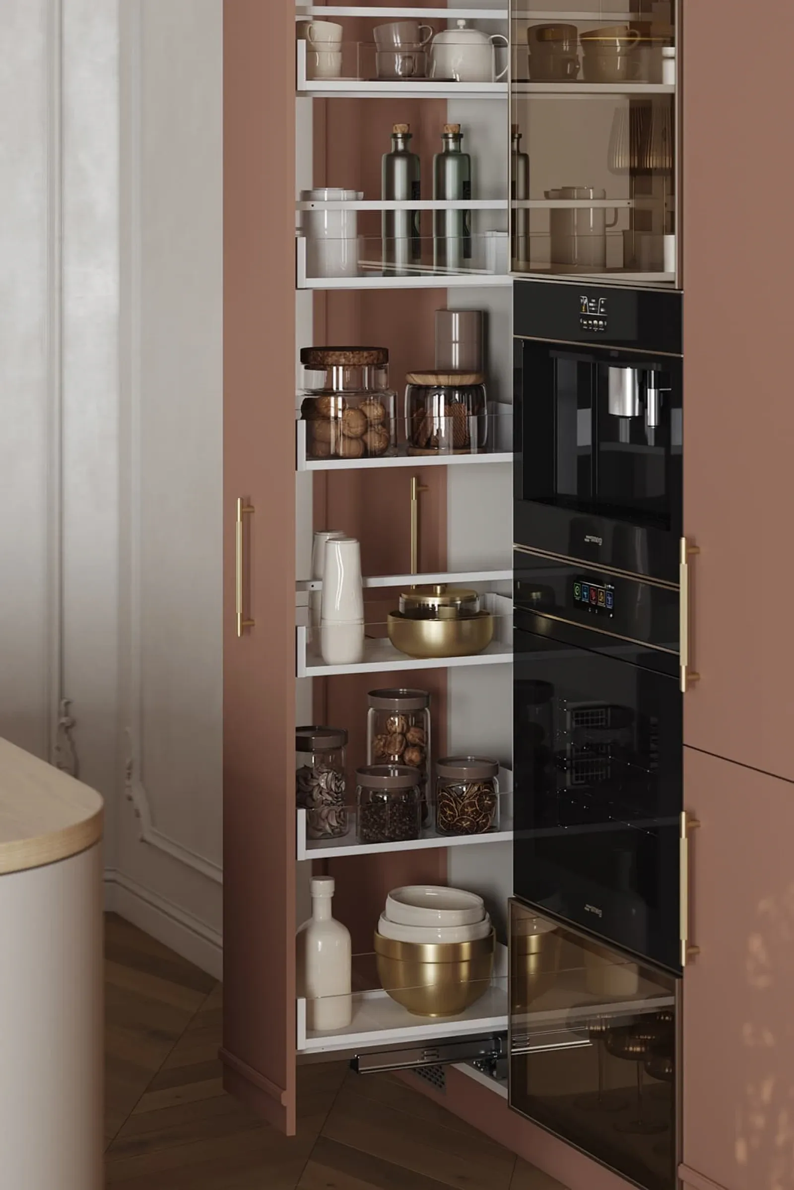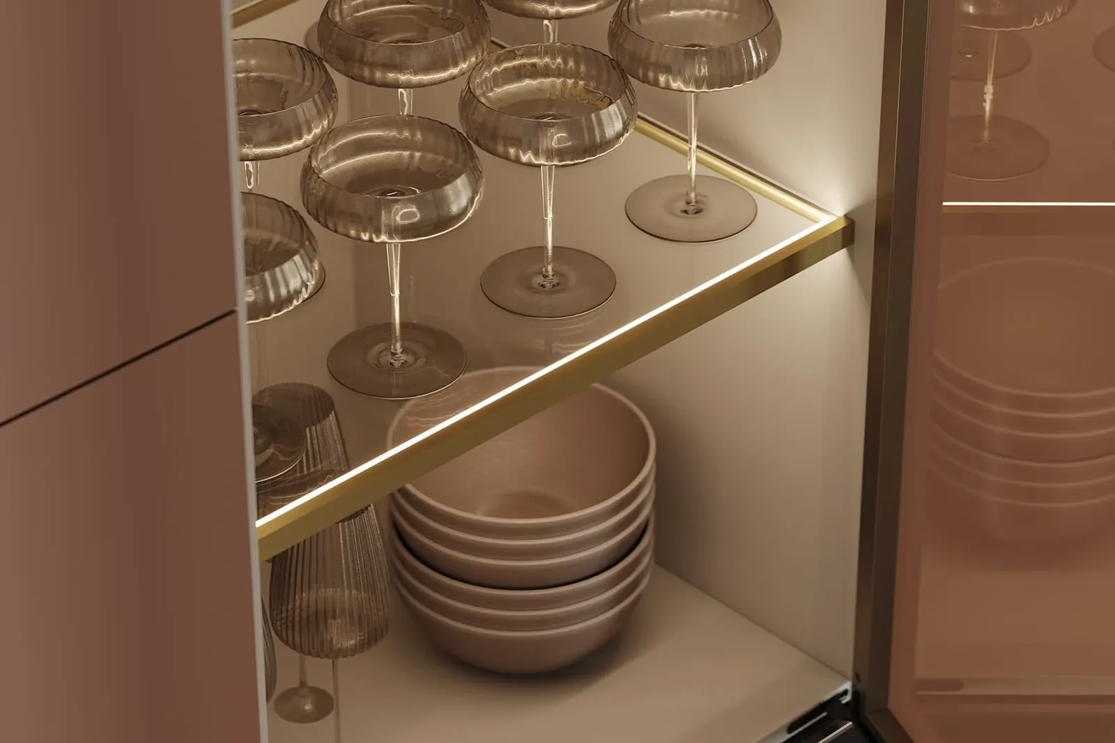Витрины: Алюминиевый профиль А-6 Латунь (скрытая петля AIR PUSH), стекло Феникс Бронза