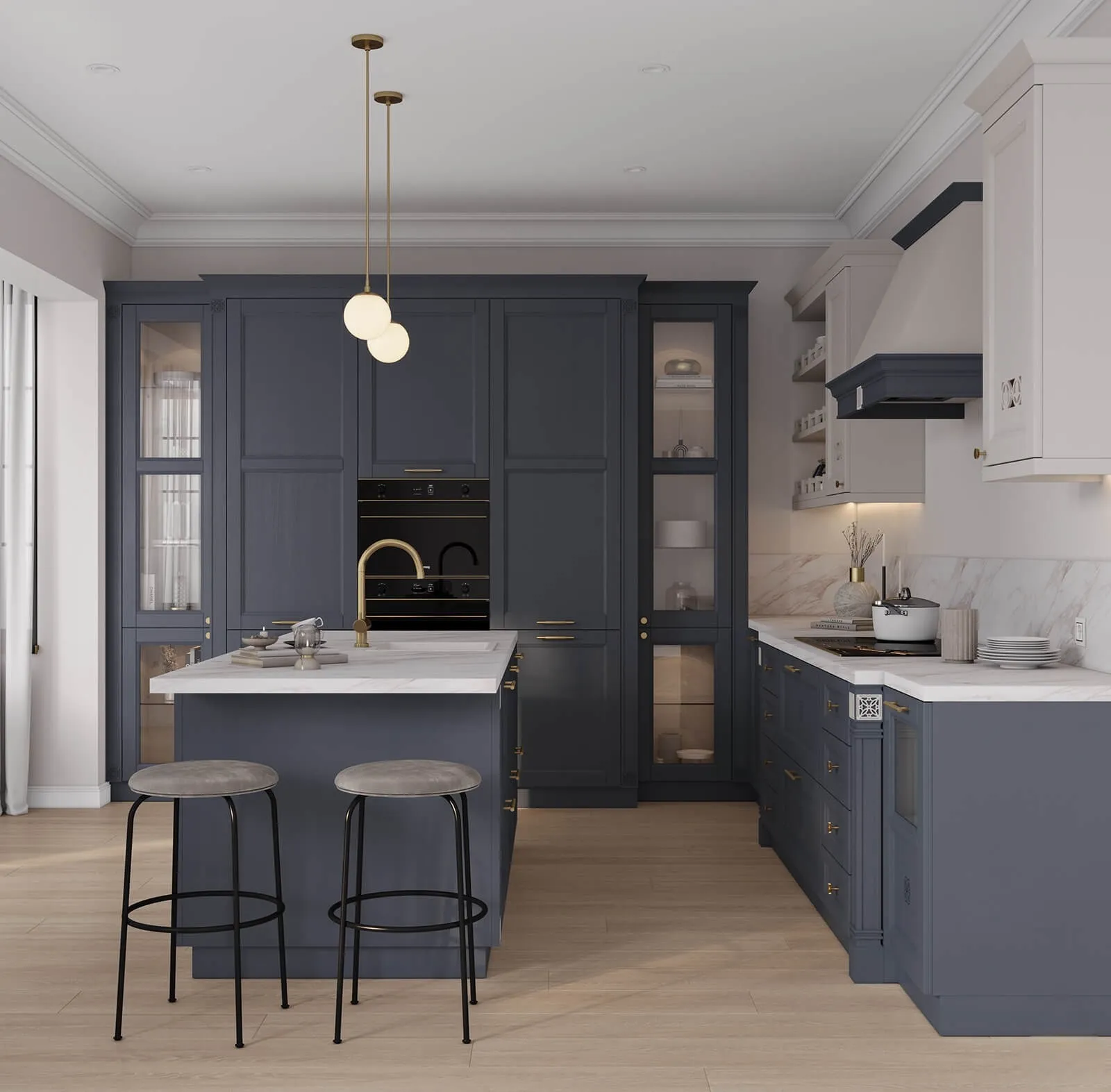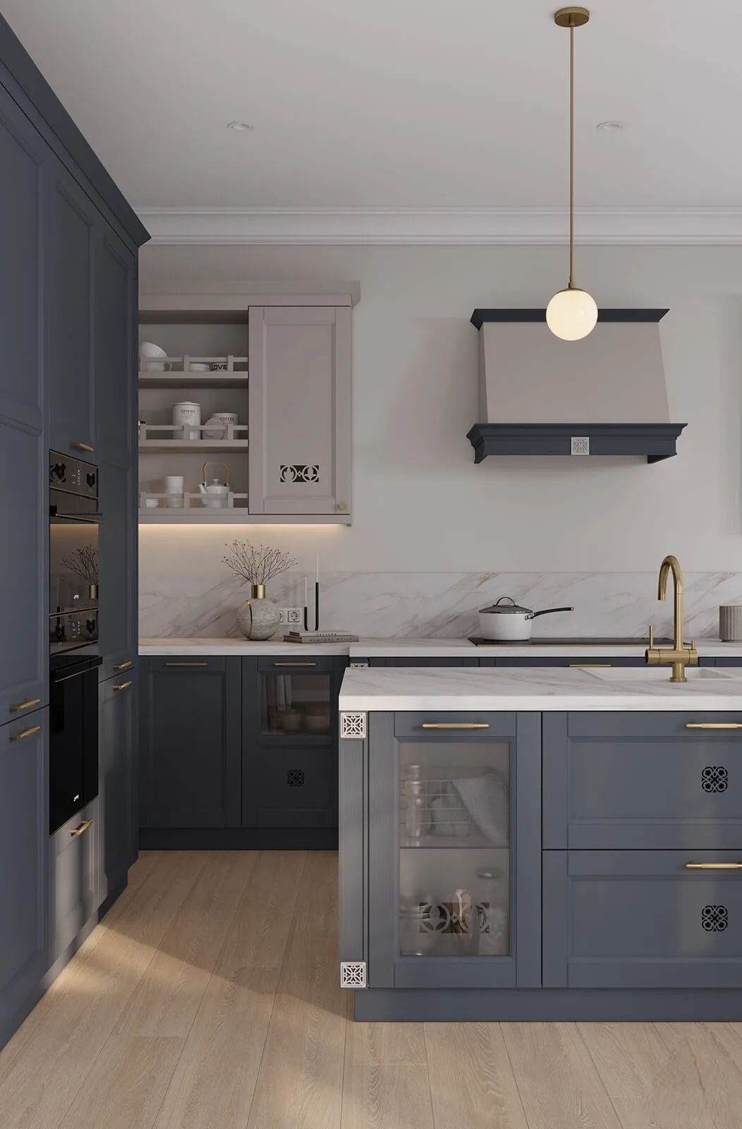 Декоративные элементы: Опора декоративная ОД-10(820); пилястра #12, 13; балюстрада прямая «Техно»; плинтус мебельный ПМ-6; багет ЛГБ-1 прямой; декоративный короб HB «Пьемонт» (700) под встраиваемую вытяжку.