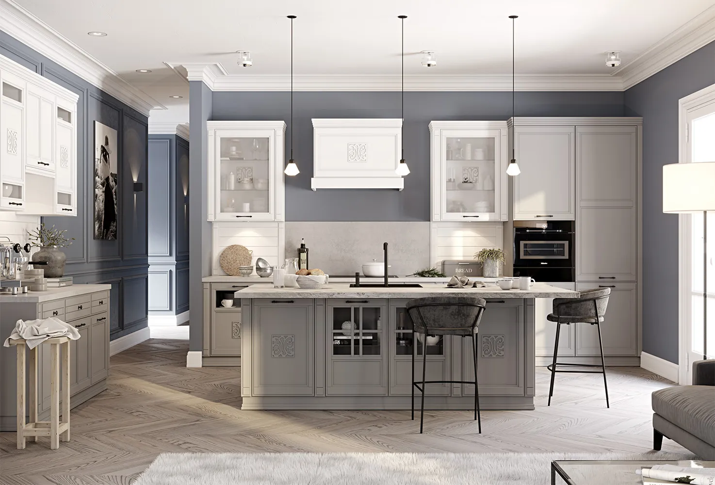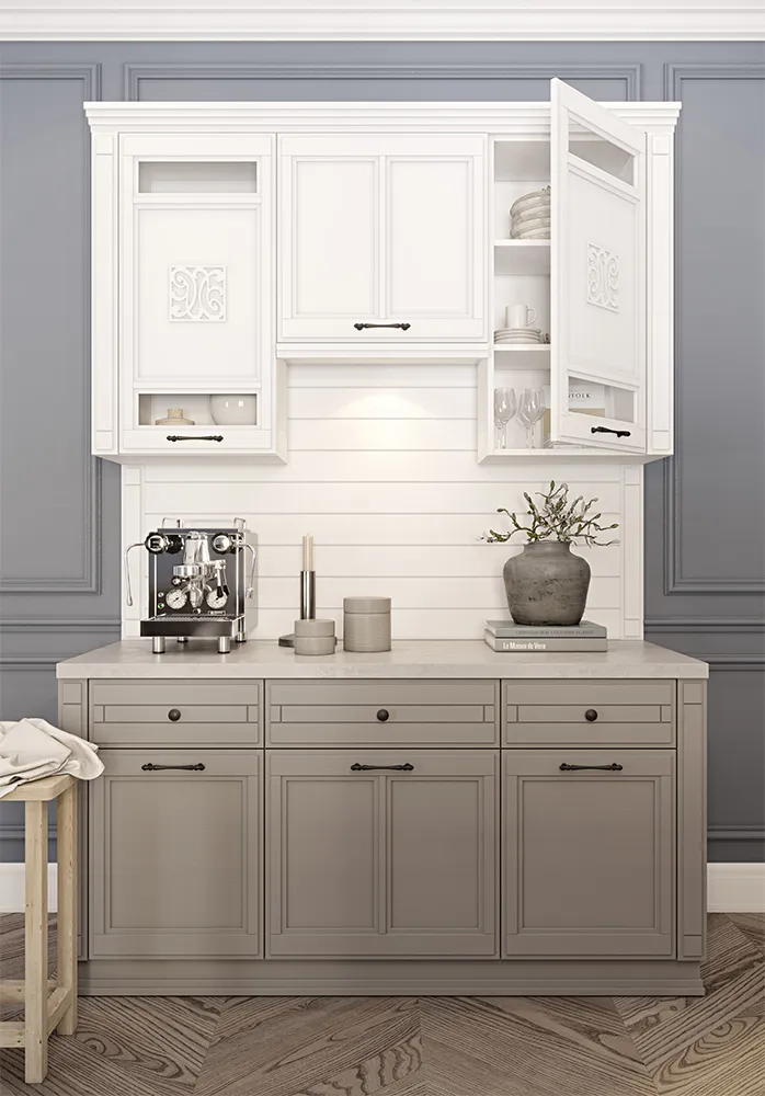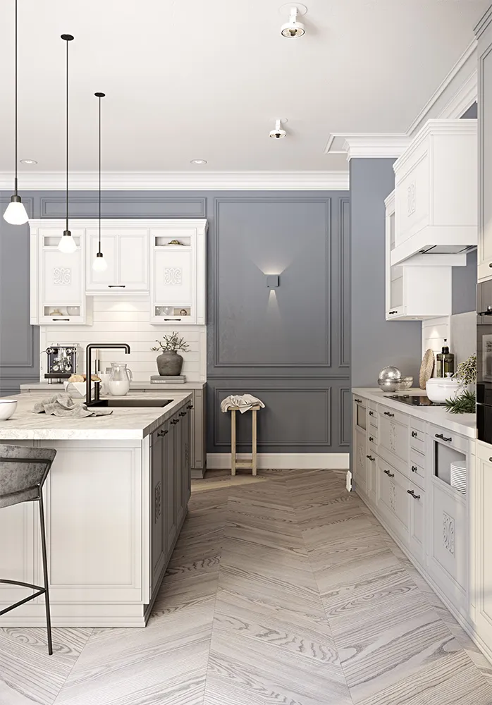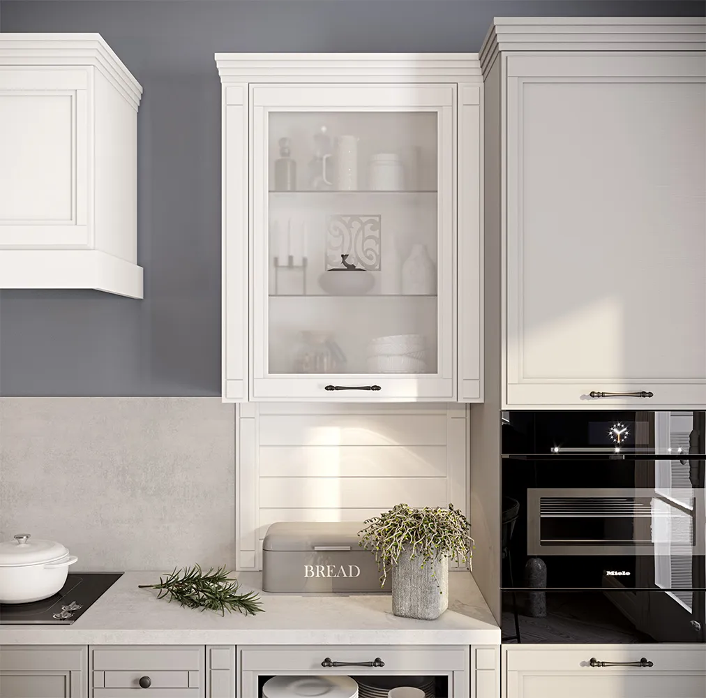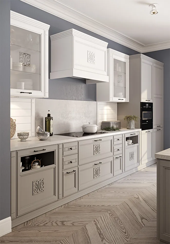 Декоративные элементы: Пилястра #15-7,5, цвет 142 / 143; плинтус мебельный ПМ-7, цвет 143; багет Б7, цвет 142 / 143; вагонка, цвет 143; декоративный короб HB «Вескона» (900) под встраиваемую вытяжку, цвет 143