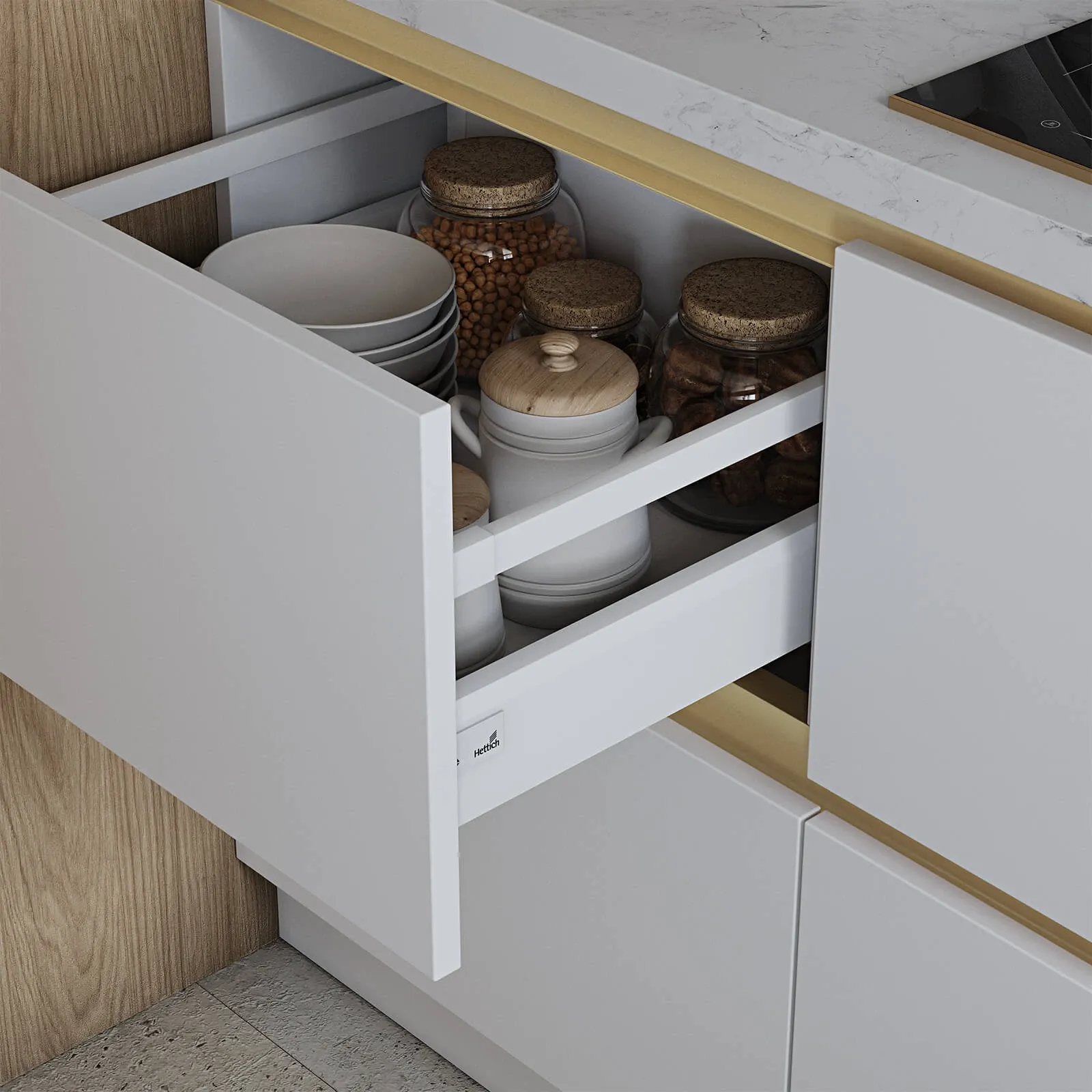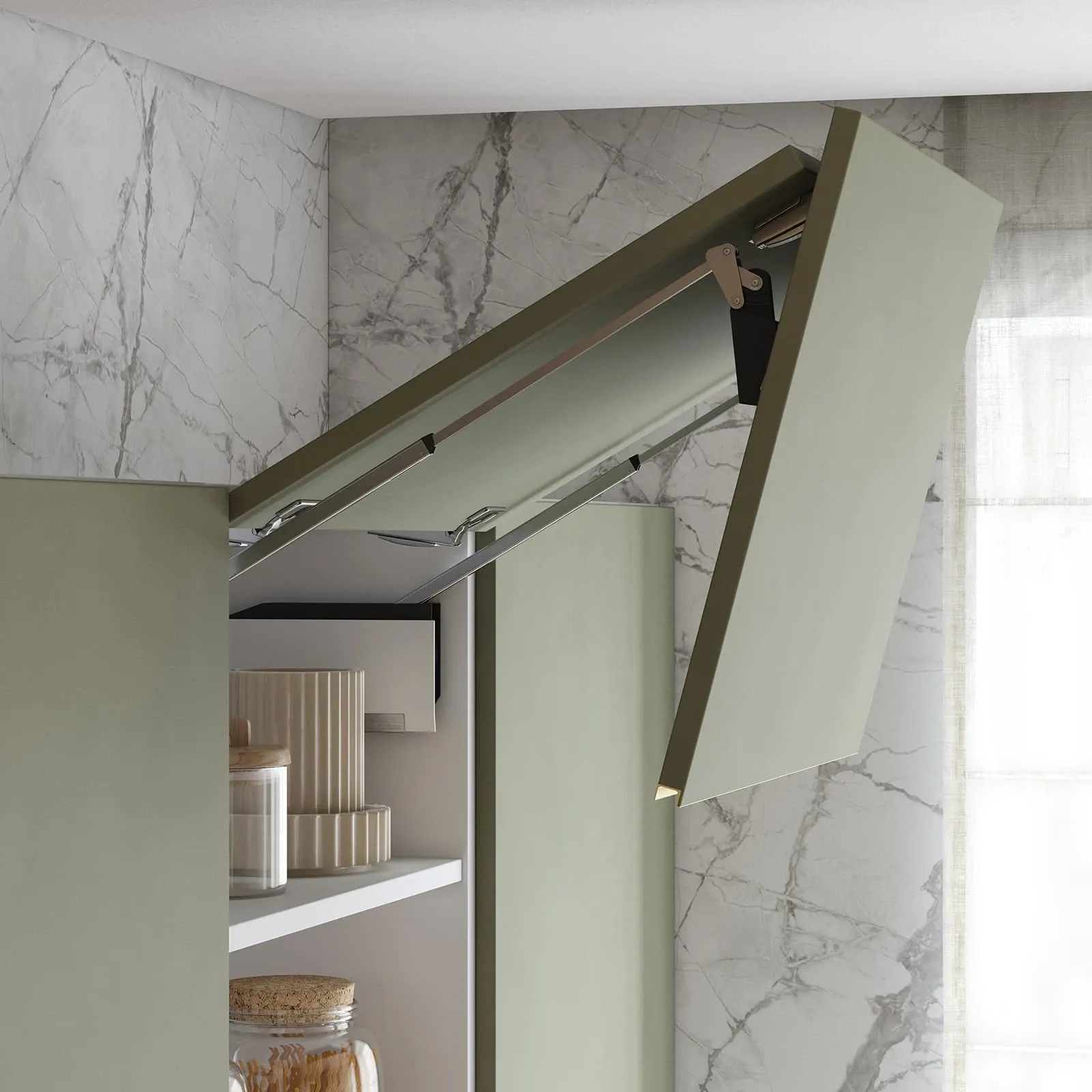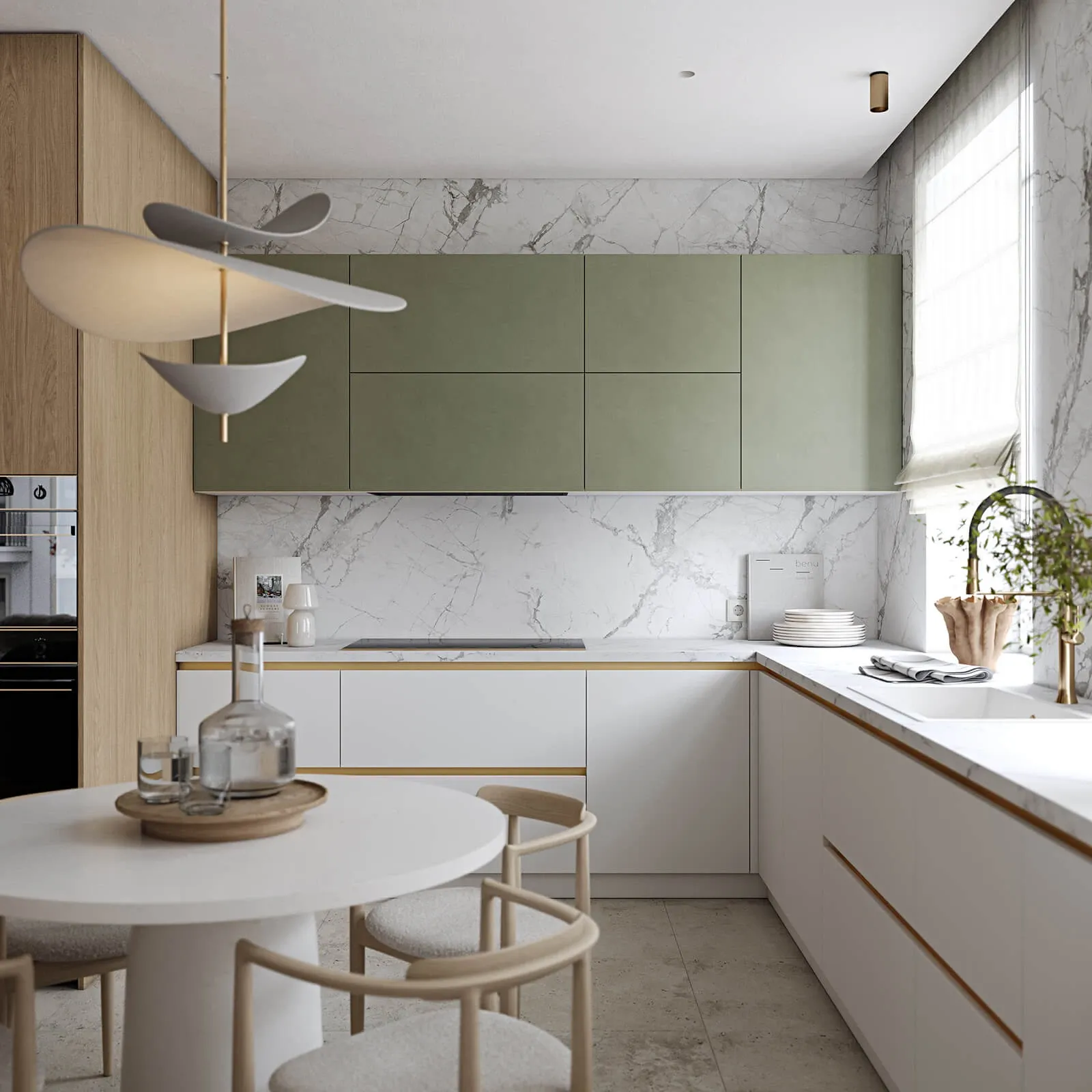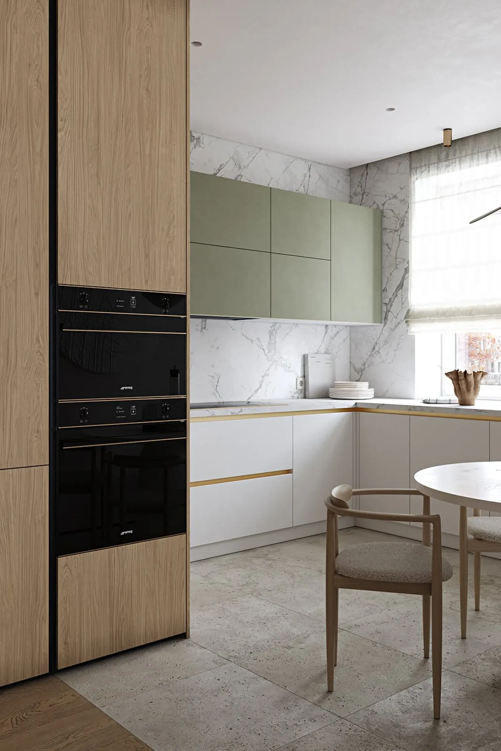 ФАСАДЫ ЛМДФ Тимбер, декор Каселла Натур Светлый / крашеная МДФ, цвет NCS S 4020-G30Y Матовый / NCS S 0500-N Матовый СТОЛЕШНИЦА Пластик HPL, 38 мм, декор Мрамор Бернини