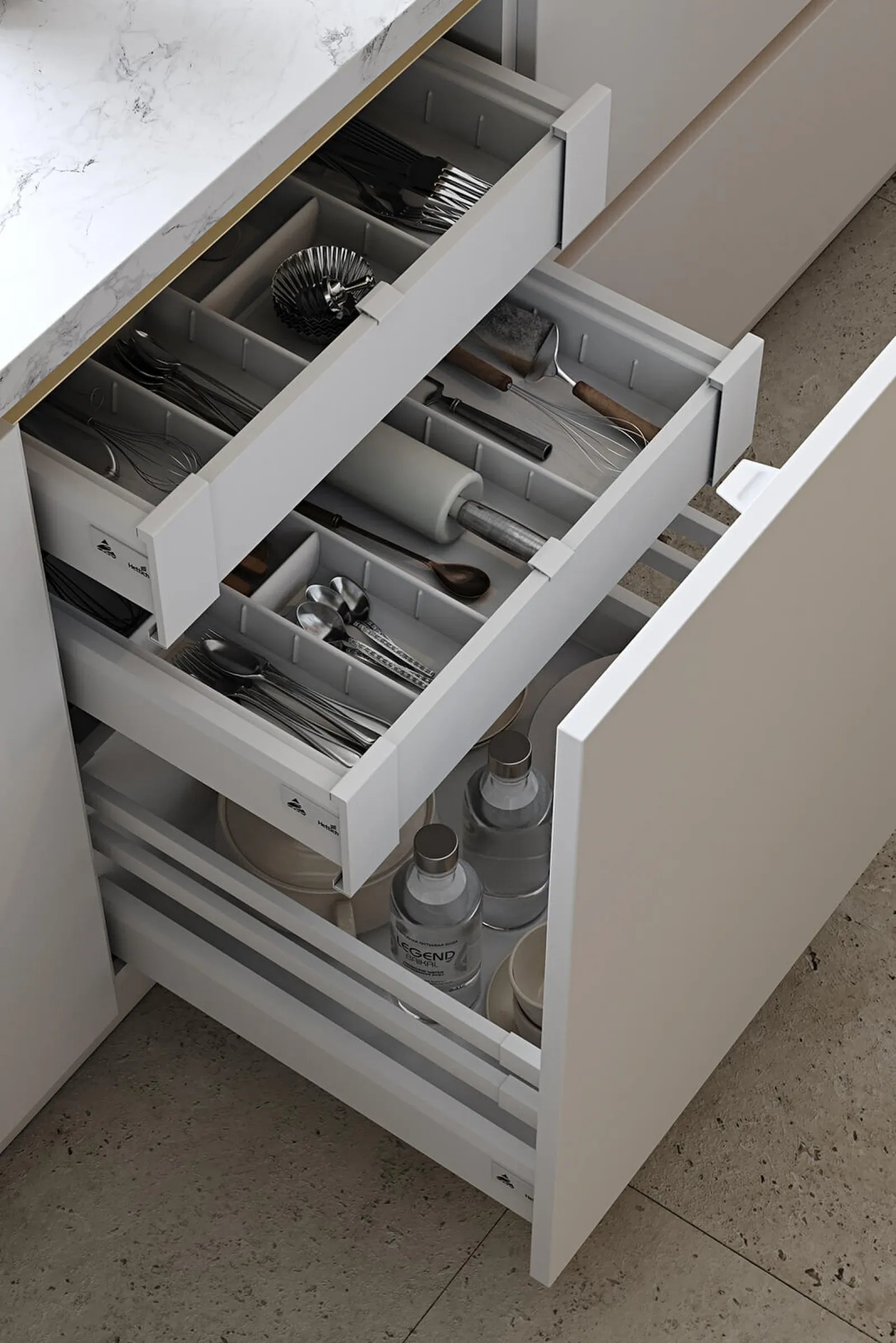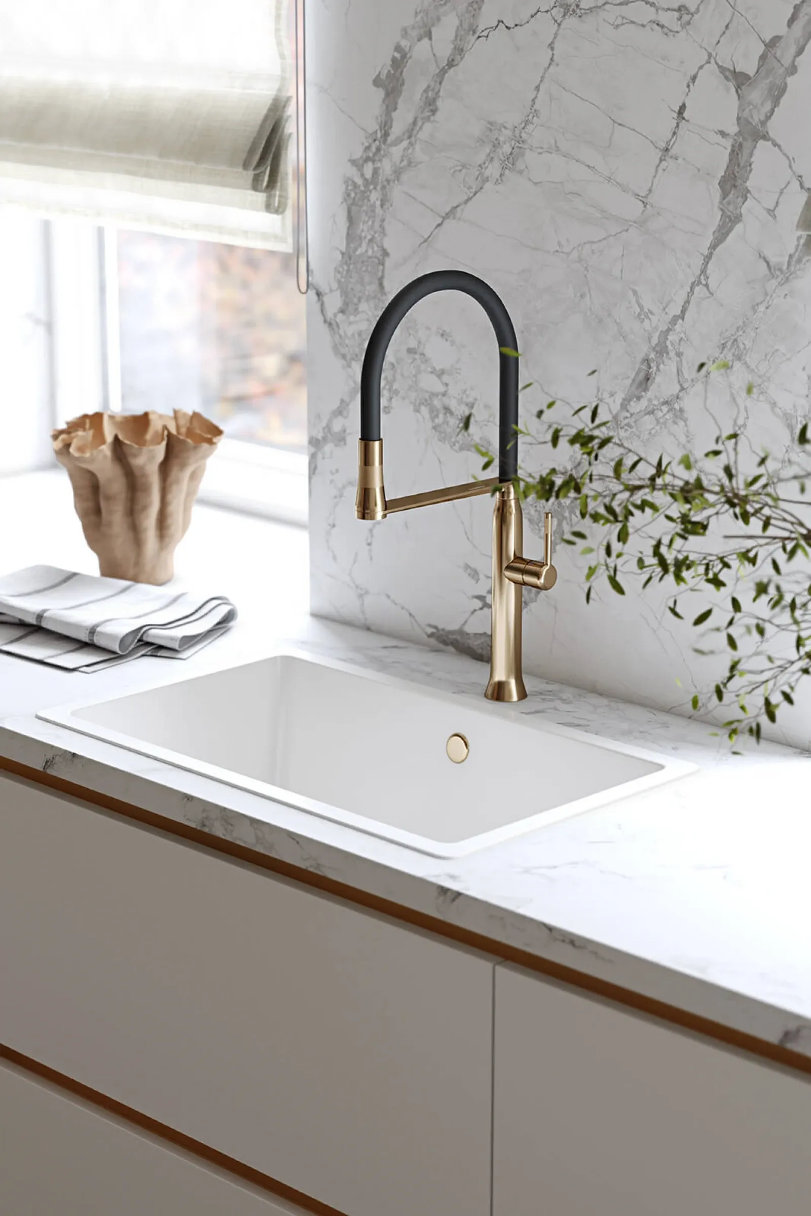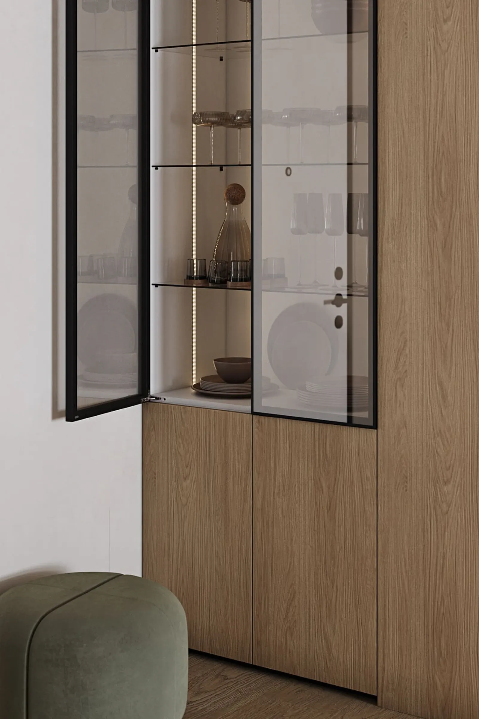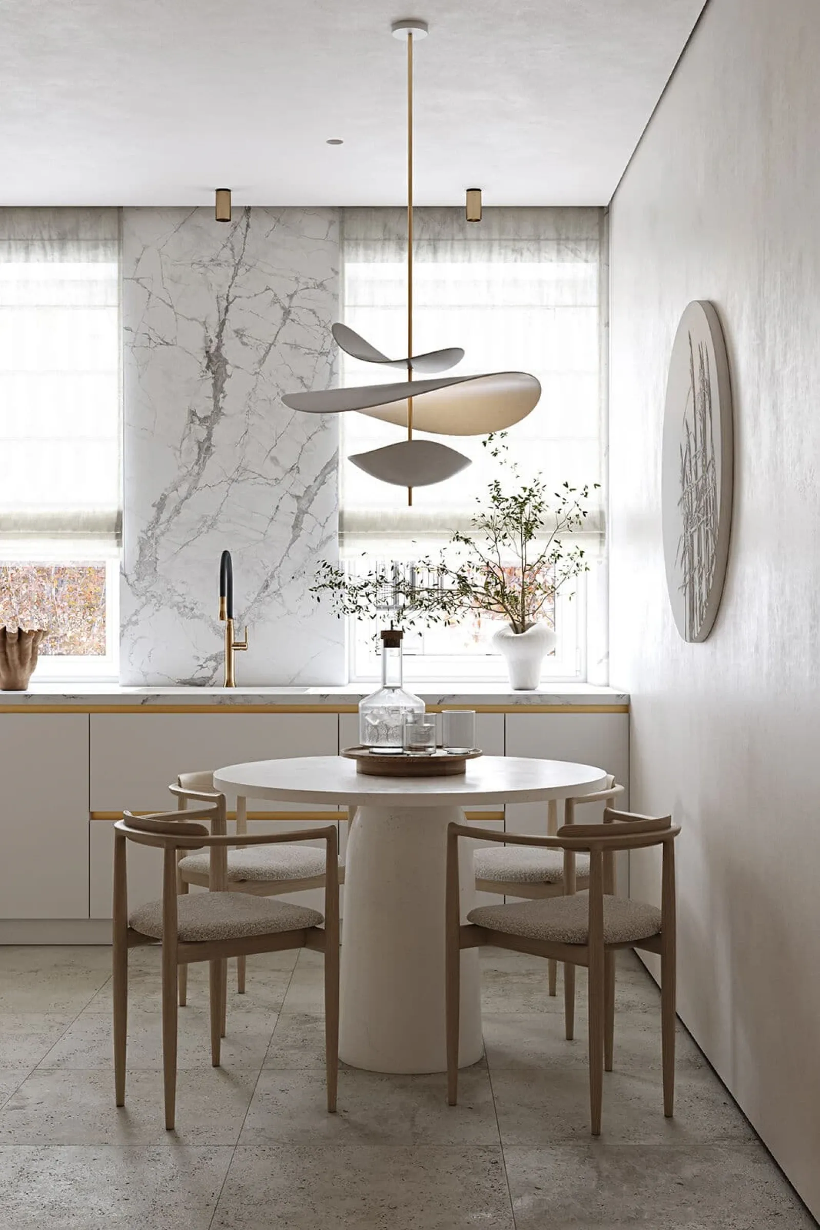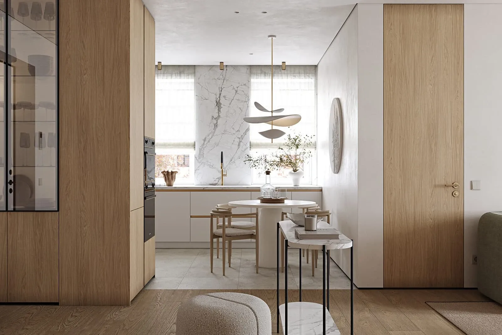 ФАСАДЫ ЛМДФ Тимбер, декор Каселла Натур Светлый / крашеная МДФ, цвет NCS S 4020-G30Y Матовый / NCS S 0500-N Матовый СТОЛЕШНИЦА Пластик HPL, 38 мм, декор Мрамор Бернини