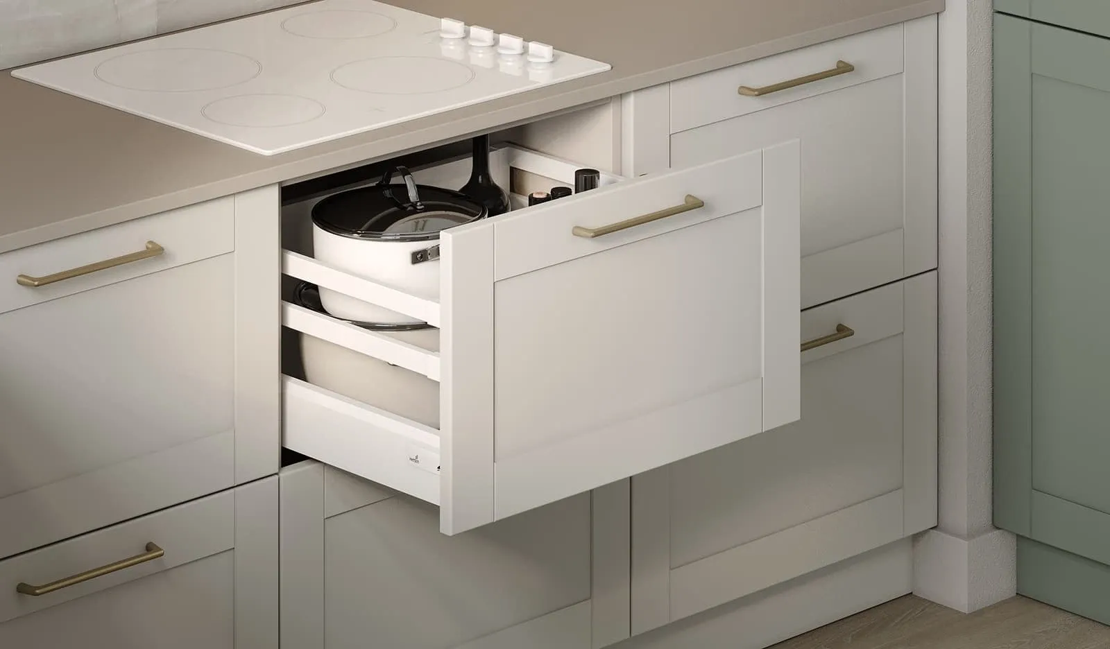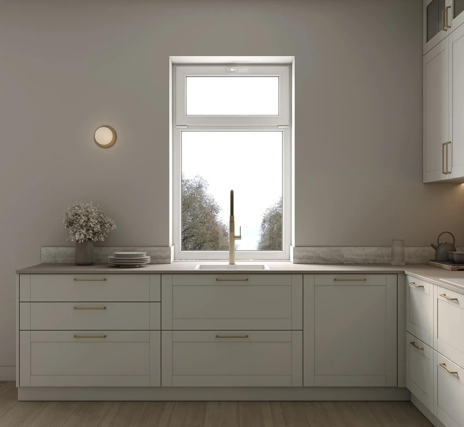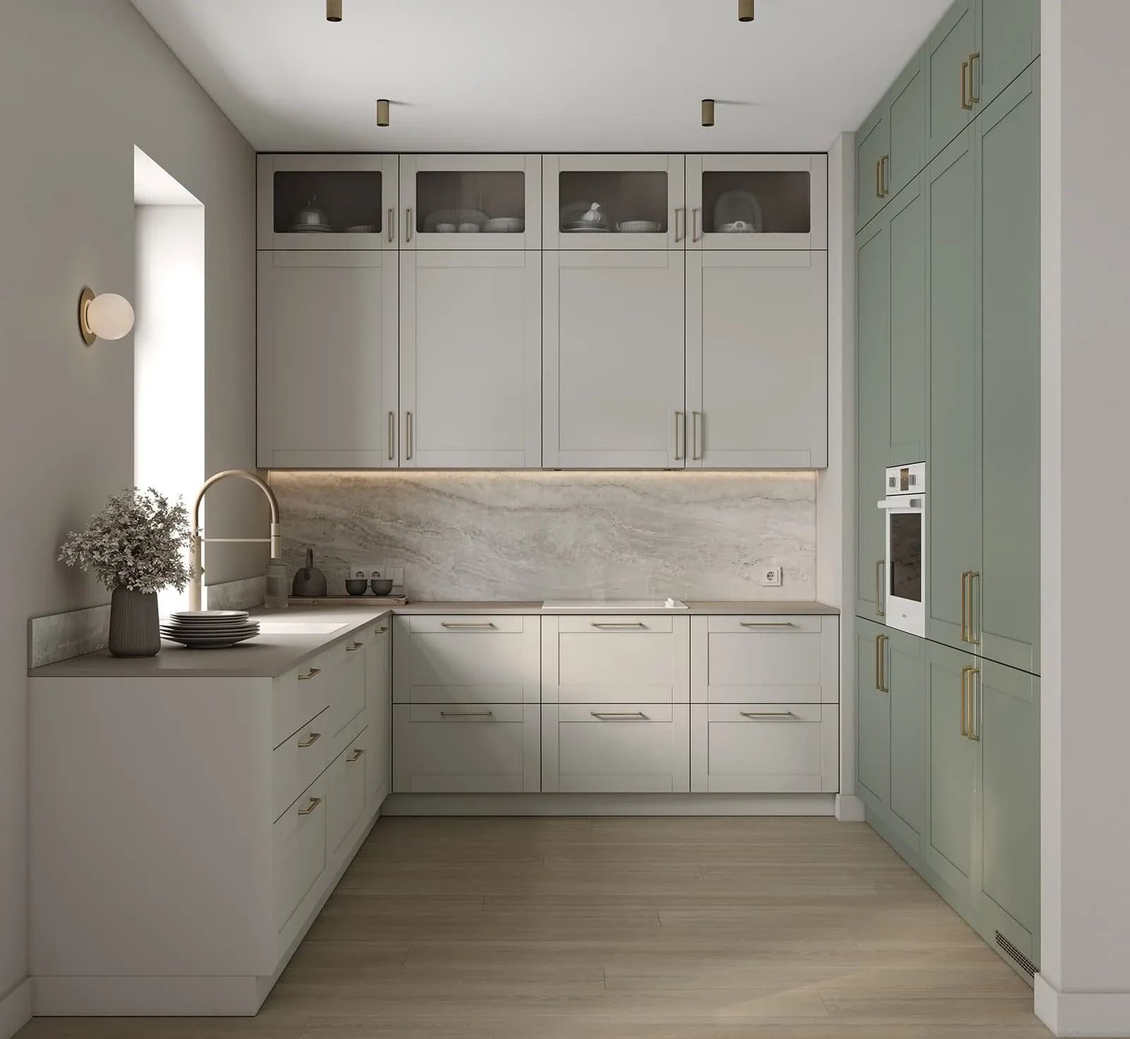 ФАСАДЫ Трент (МДФ/ПВХ), цвет Сильвер Ф / Селадон Ф СТОЛЕШНИЦА Акрил Fenix NTM, 20 мм, цвет Серо-бежевый NTM (0748)