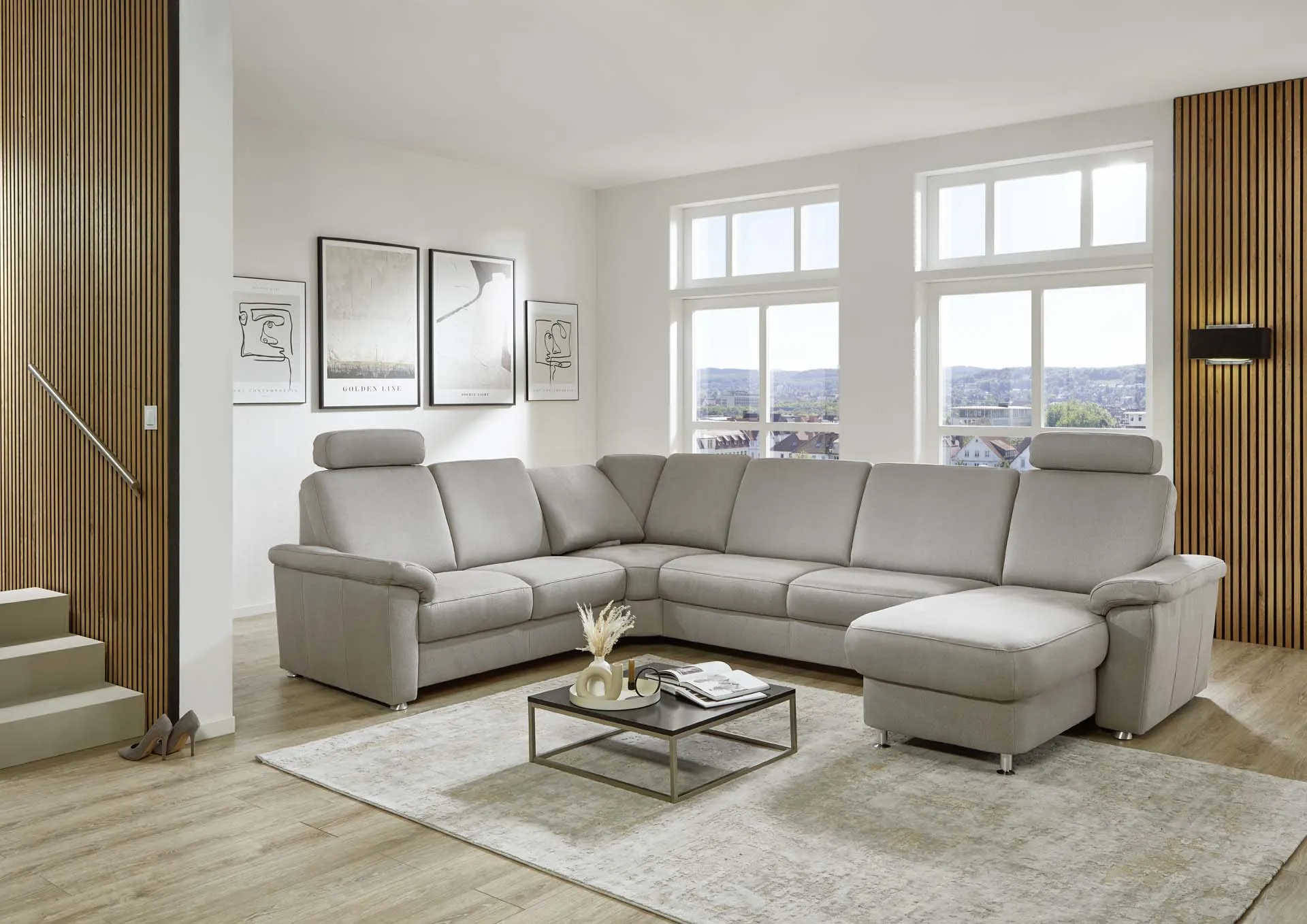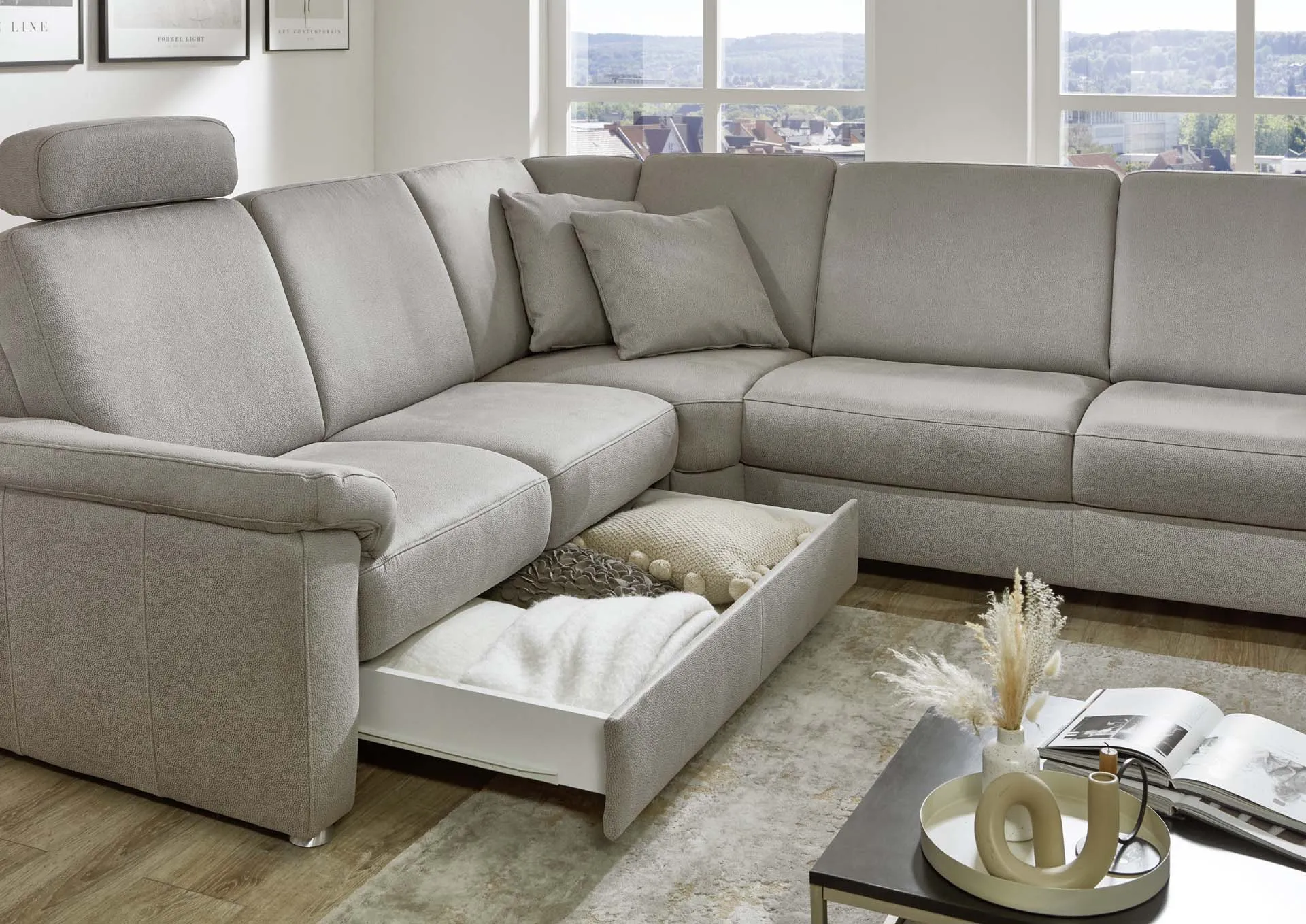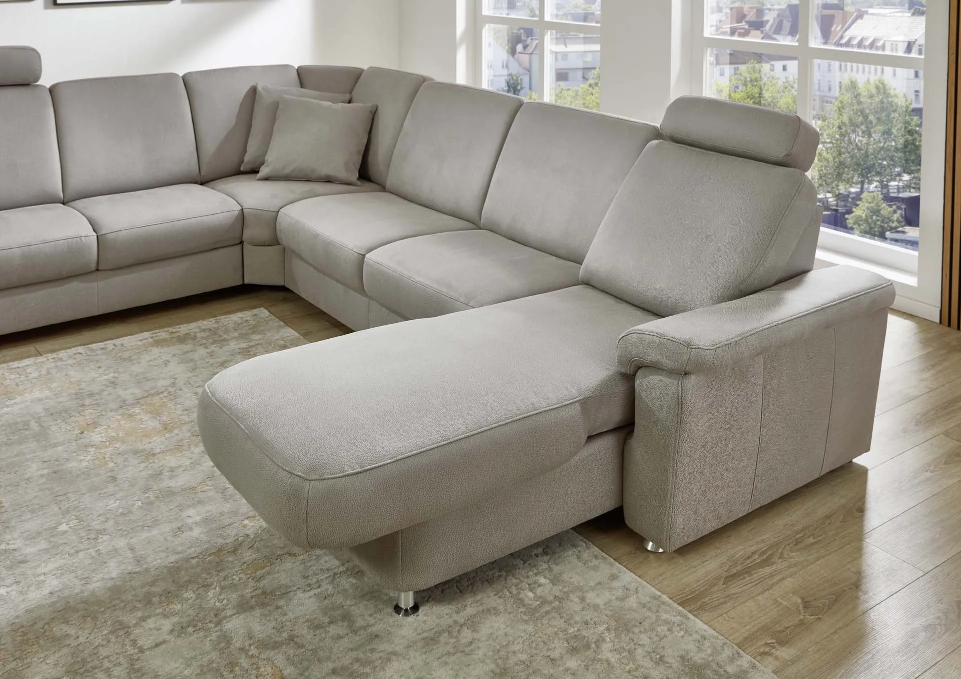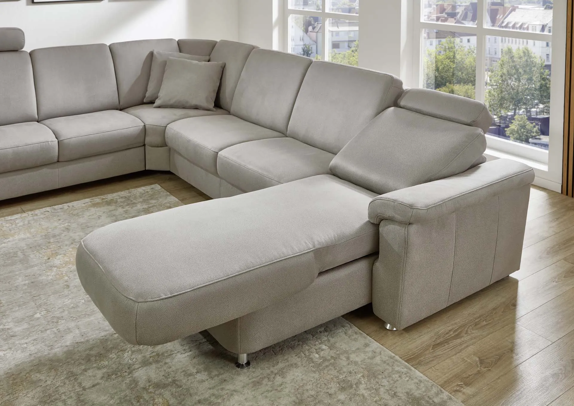2 подголовника + двухместный элемент с выдвижным ящиком для хранения + угловой элемент с внутренним трапециевидным углом с ручным механизмом регулирования трансформации спинок + двухместный элемент с трапециевидным спальным местом, без подлокотников + канапе прямолинейное с электрическим двигателем для регулировки положения спинки и сиденья + 2 подушки.