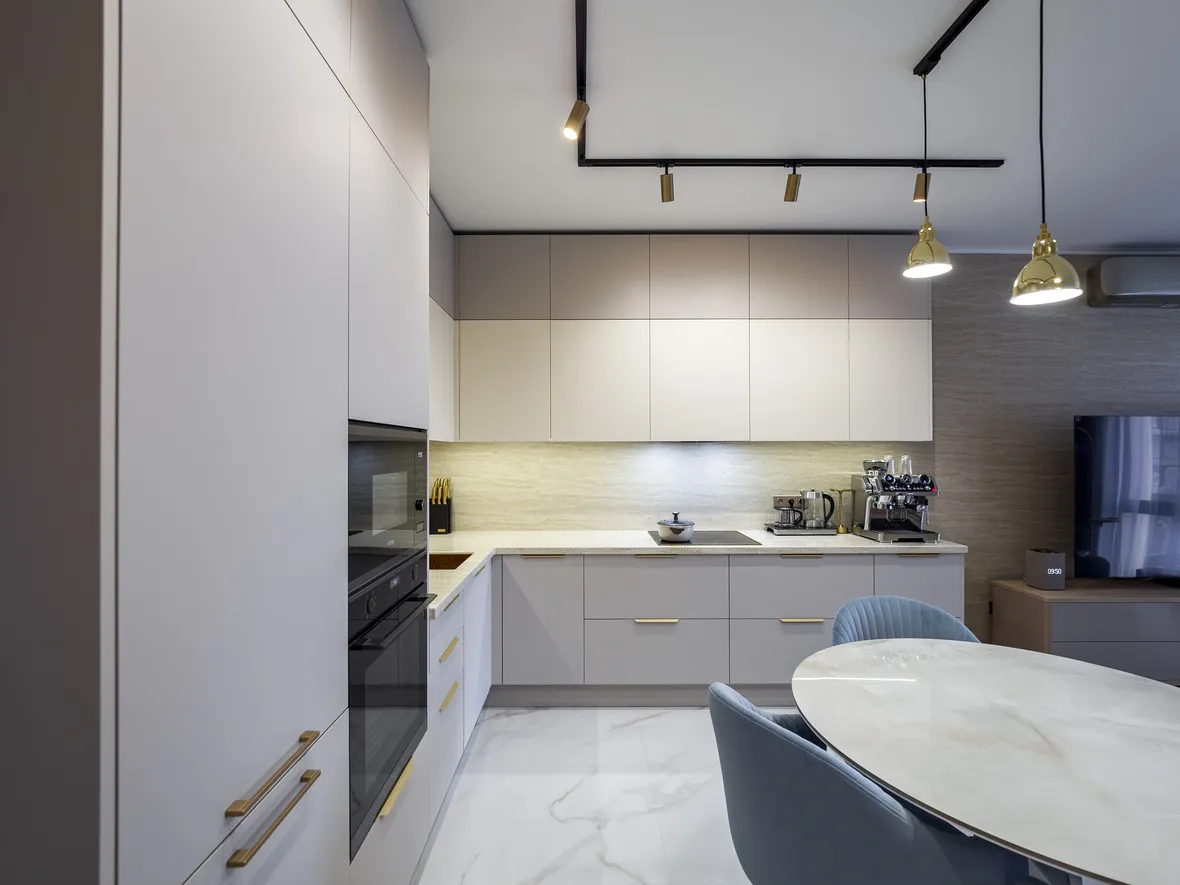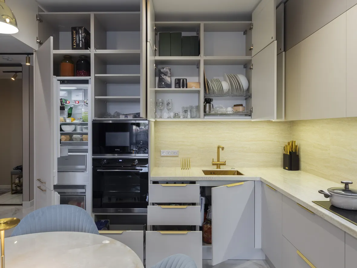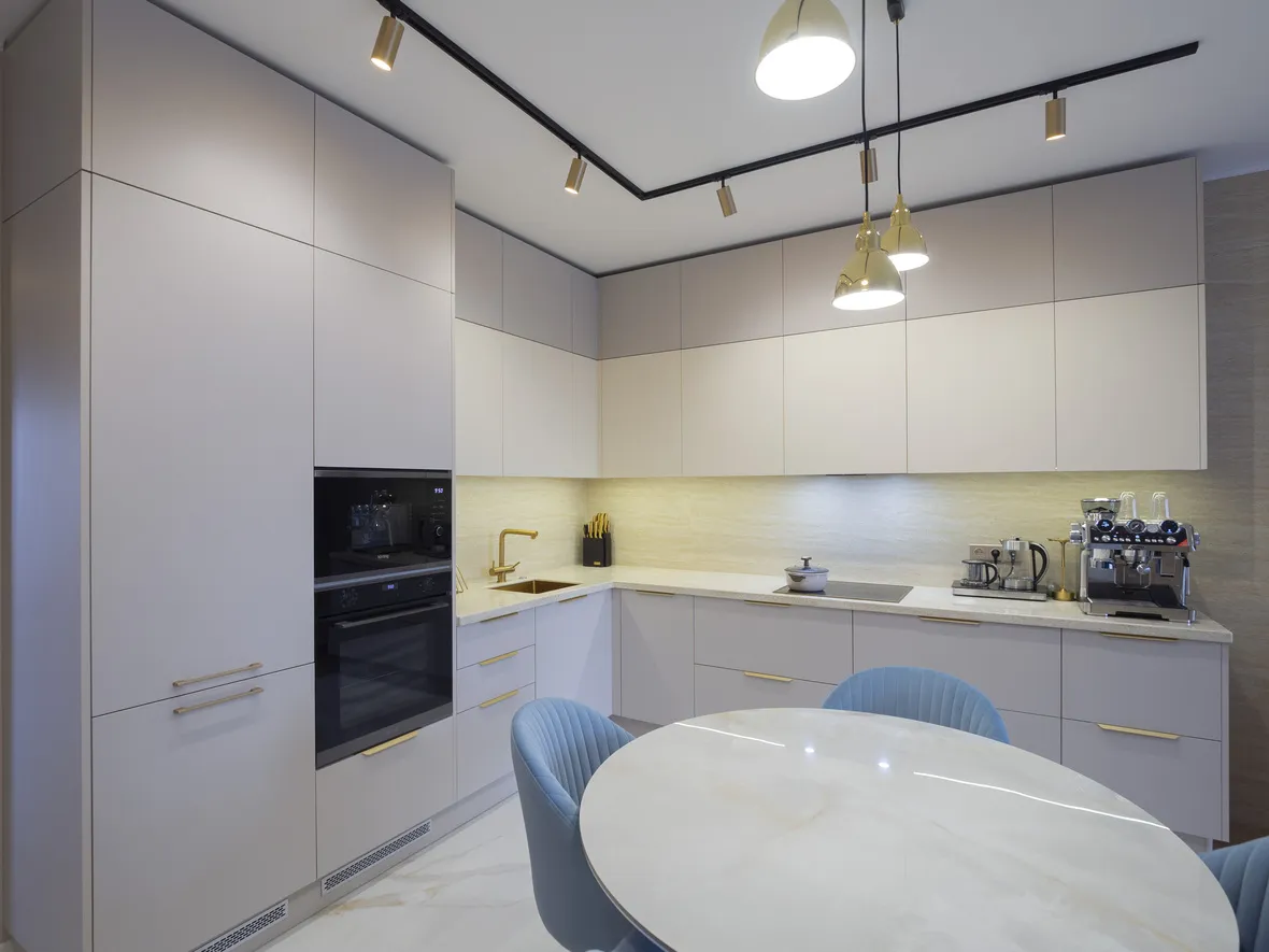 Техника: мойка и смеситель - EMAR, измельчитель - BONE CRUSHER, встроенный духовой шкаф, встроенная электрическая варочная панель, встроенная СВЧ, встроенная вытяжка, встроенная ПММ, встроенный холодильник - KORTING