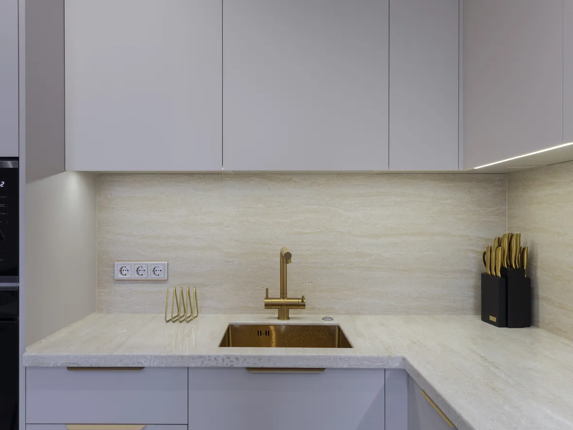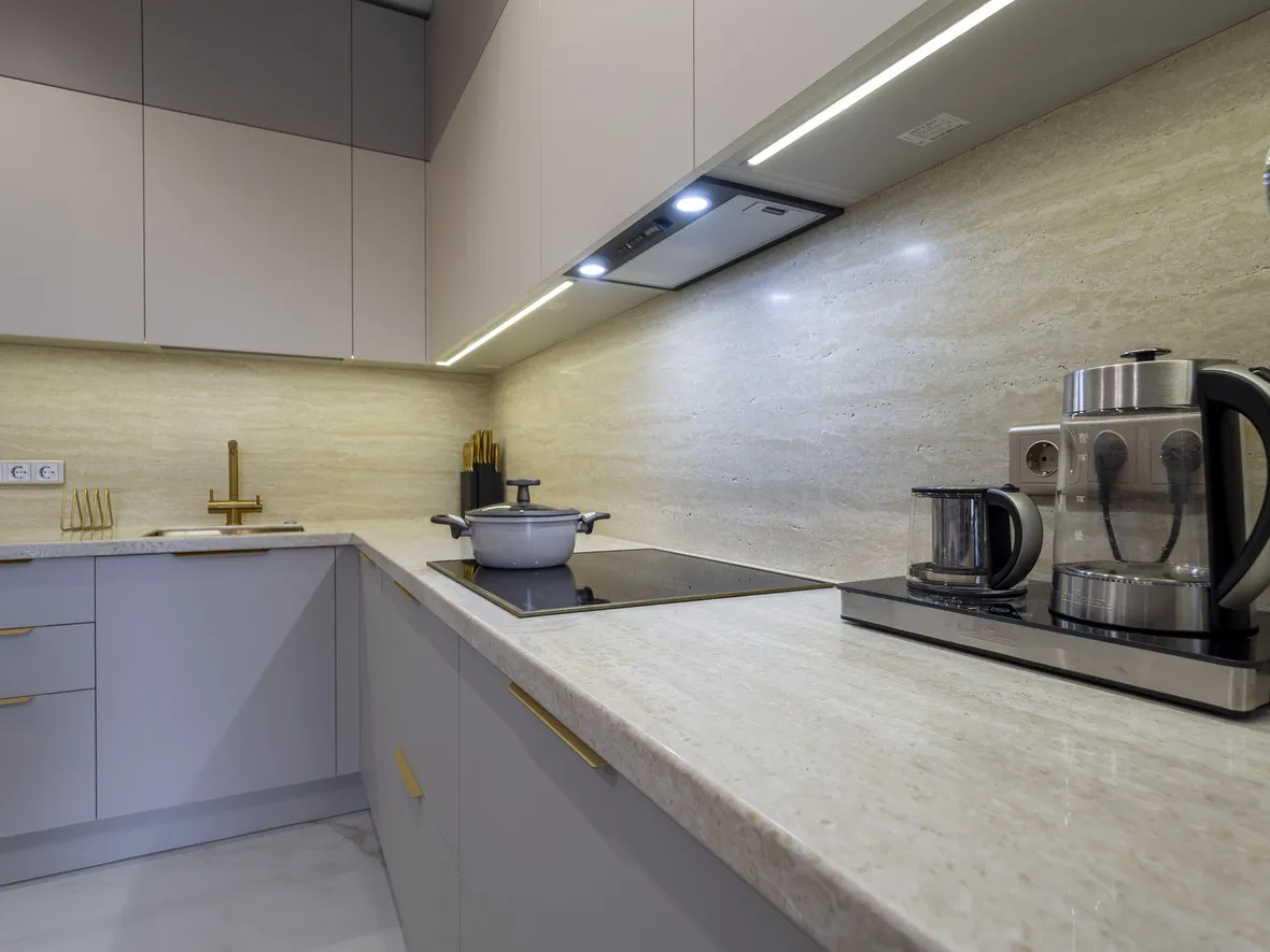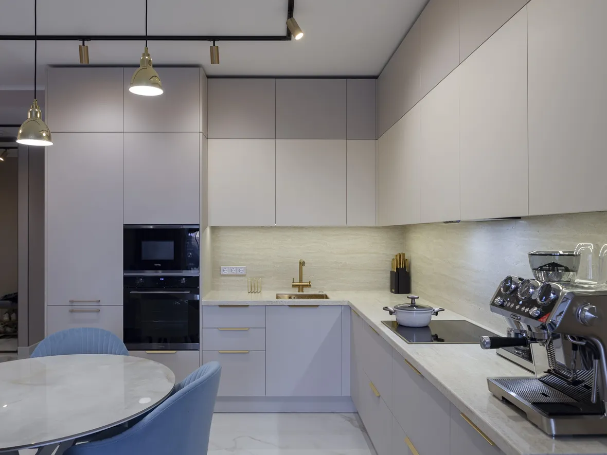 Техника: мойка и смеситель - EMAR, измельчитель - BONE CRUSHER, встроенный духовой шкаф, встроенная электрическая варочная панель, встроенная СВЧ, встроенная вытяжка, встроенная ПММ, встроенный холодильник - KORTING