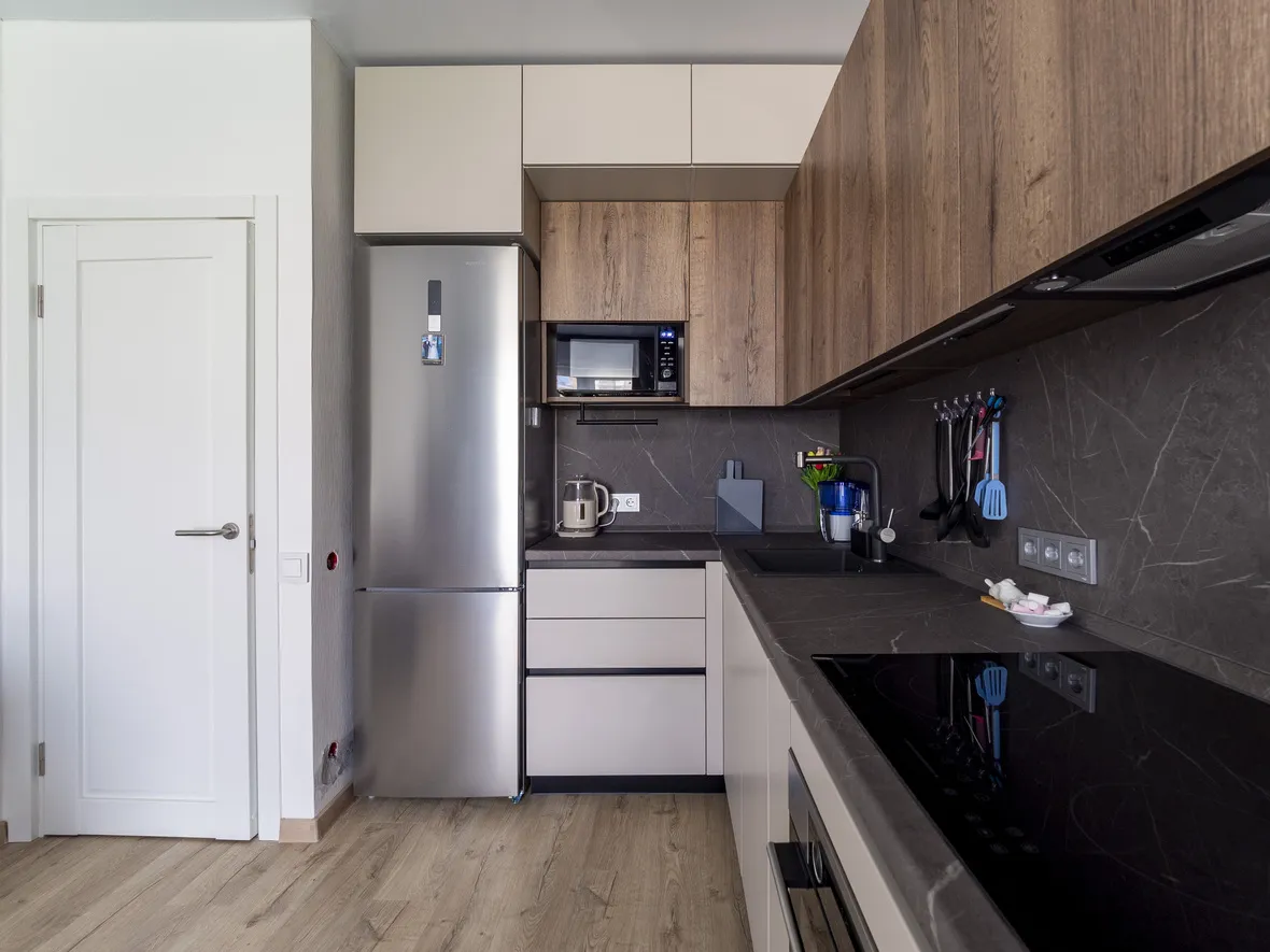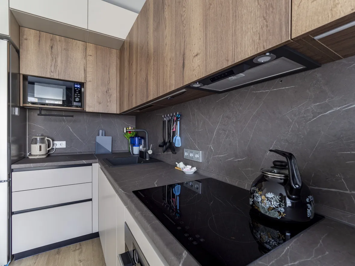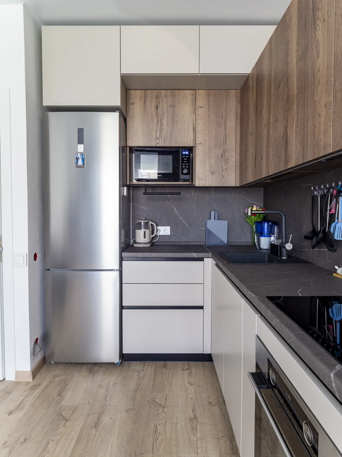 Техника: мойка и смеситель - FLORENTINA, электрический духовой шкаф, встраиваемая вытяжка, электрическая варочная панель, отдельностоящая СВЧ, ПММ, отдельностоящий холодильник - KUPPERSBERG