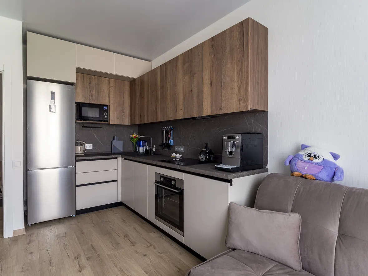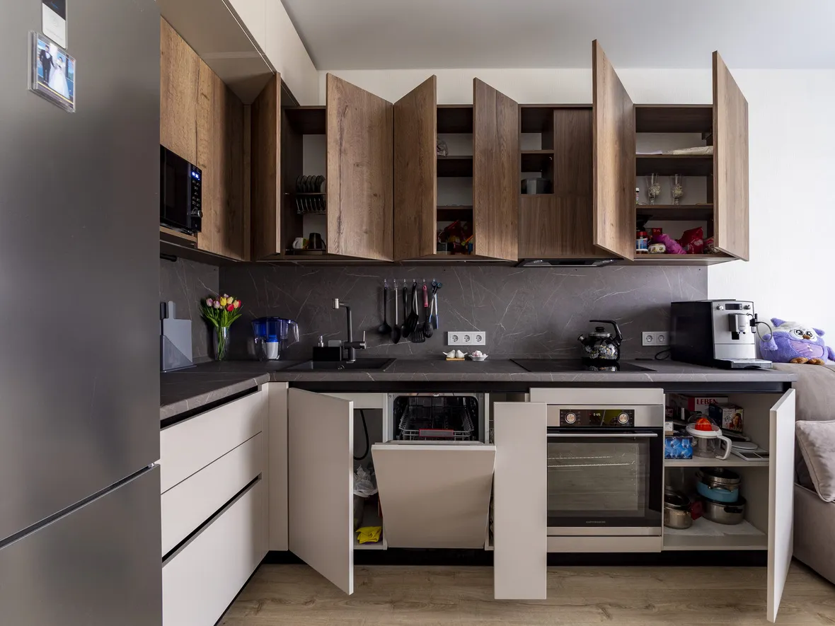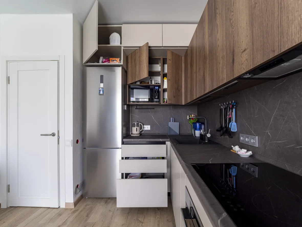 Техника: мойка и смеситель - FLORENTINA, электрический духовой шкаф, встраиваемая вытяжка, электрическая варочная панель, отдельностоящая СВЧ, ПММ, отдельностоящий холодильник - KUPPERSBERG