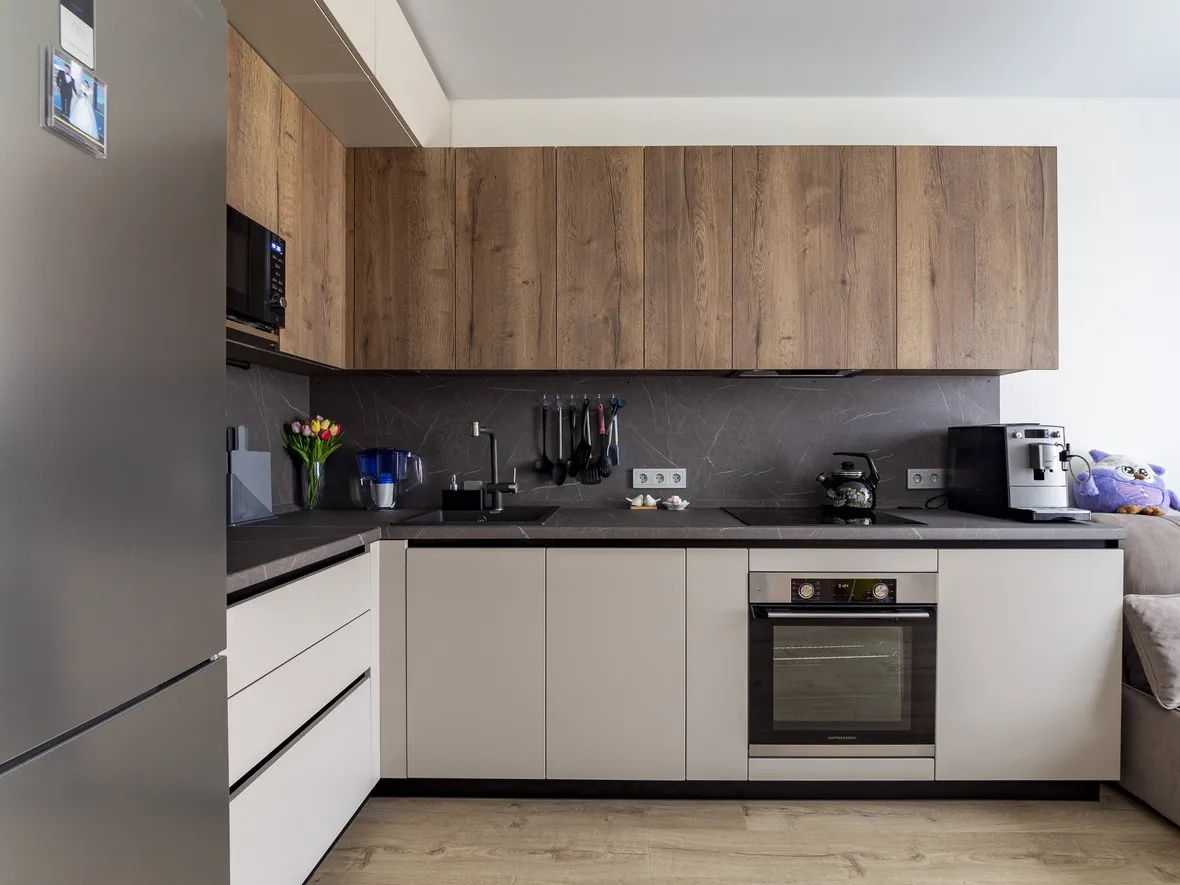 Фасад: Пленка ПВХ в цвете Кашемир; Тимбер в цвете Рока