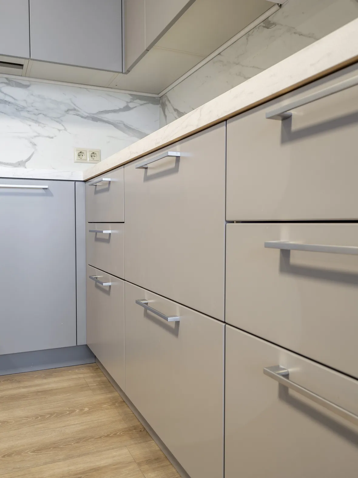 Техника: Встраиваемая вытяжка – MAUNFELD, электрический духовой шкаф, индукционная варочная панель, СВЧ, ПММ – KORTING, встраиваемый холодильник – HUNDAI, смеситель, мойка - EMAR
