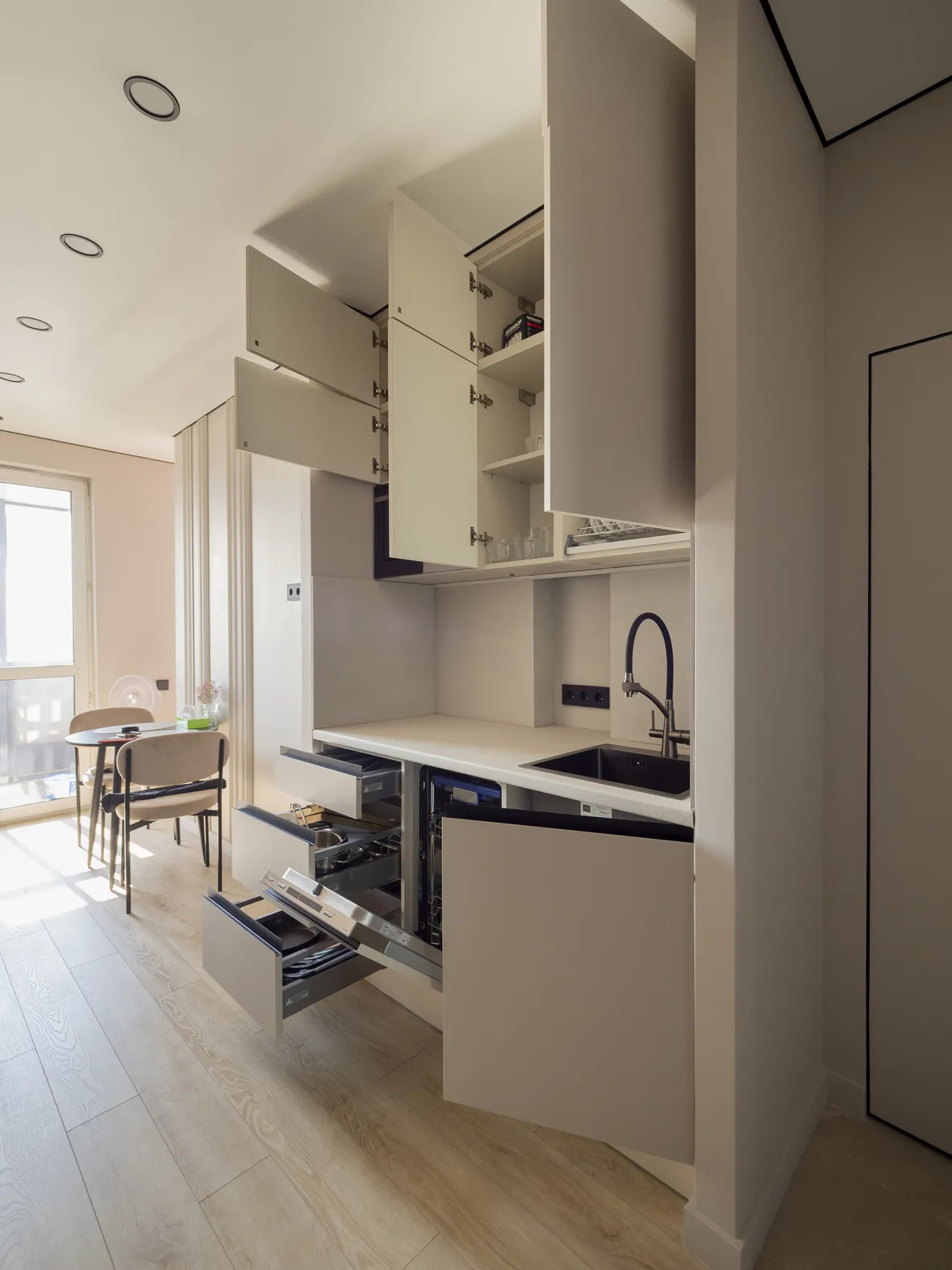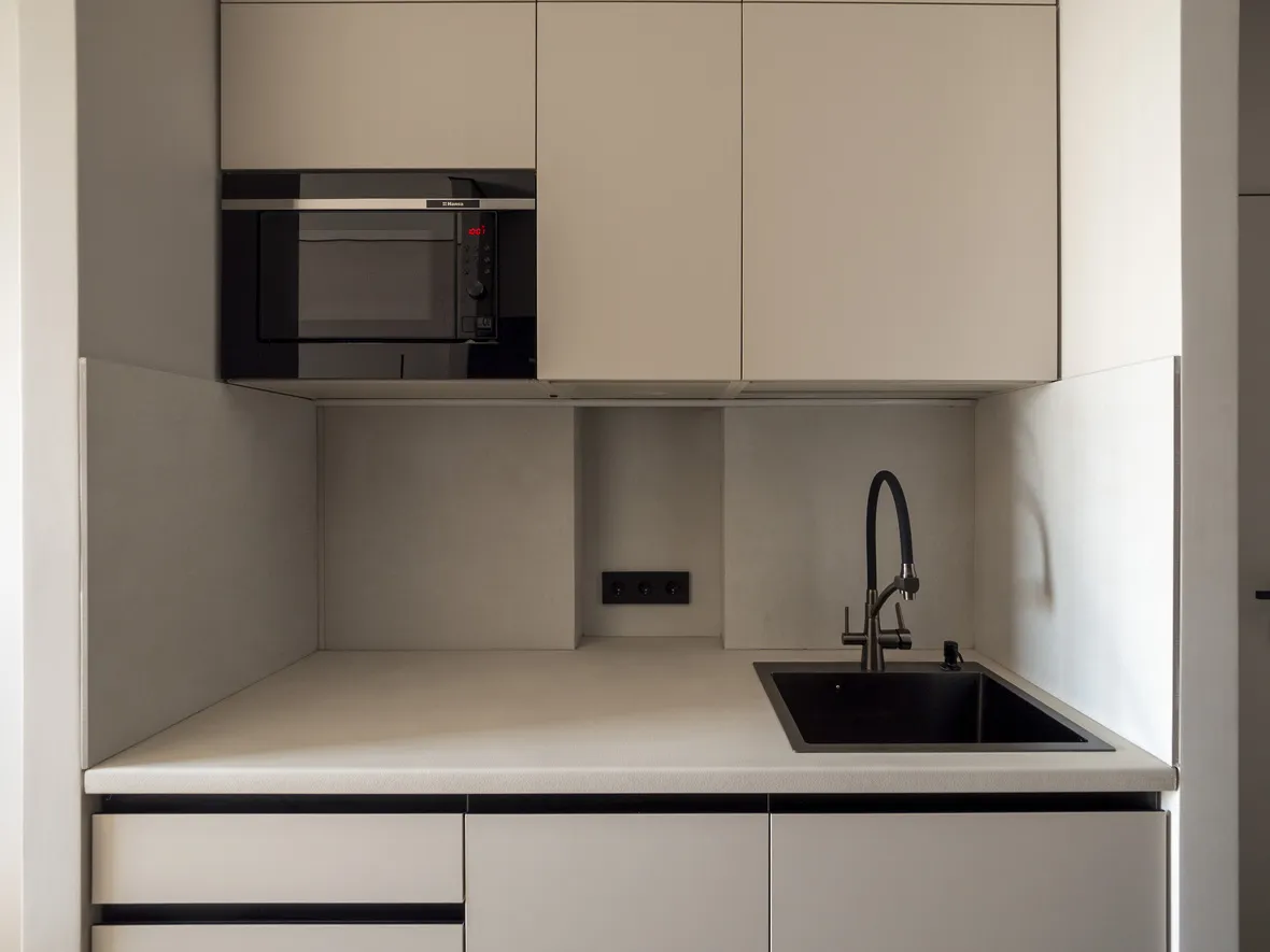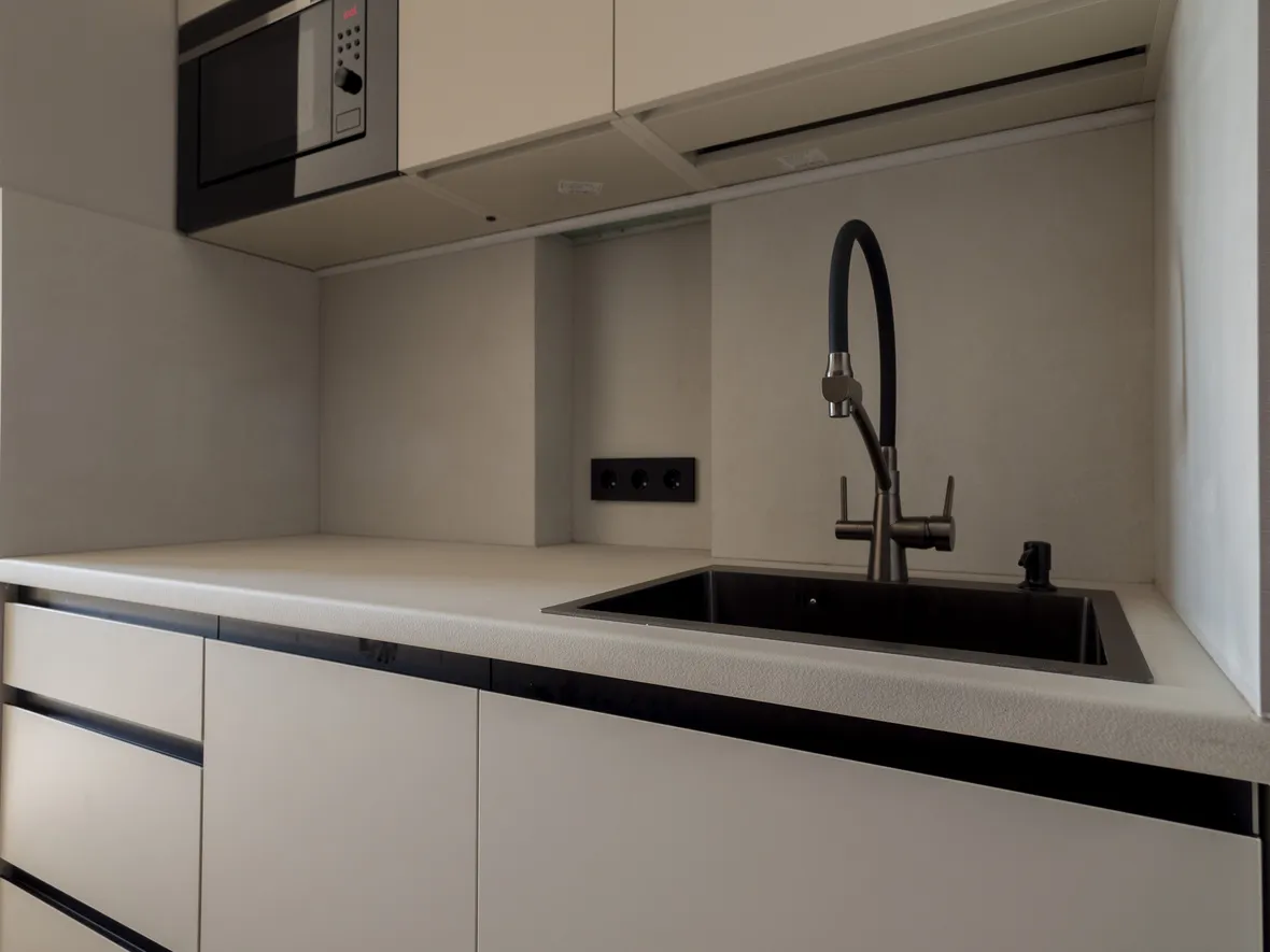 Техника: мойка и смеситель - EMAR, измельчитель - BONE CRUSHER, встроенный духовой шкаф, встроенная электрическая варочная панель, встроенная СВЧ, встроенная вытяжка, встроенная ПММ, встроенный холодильник - KORTING