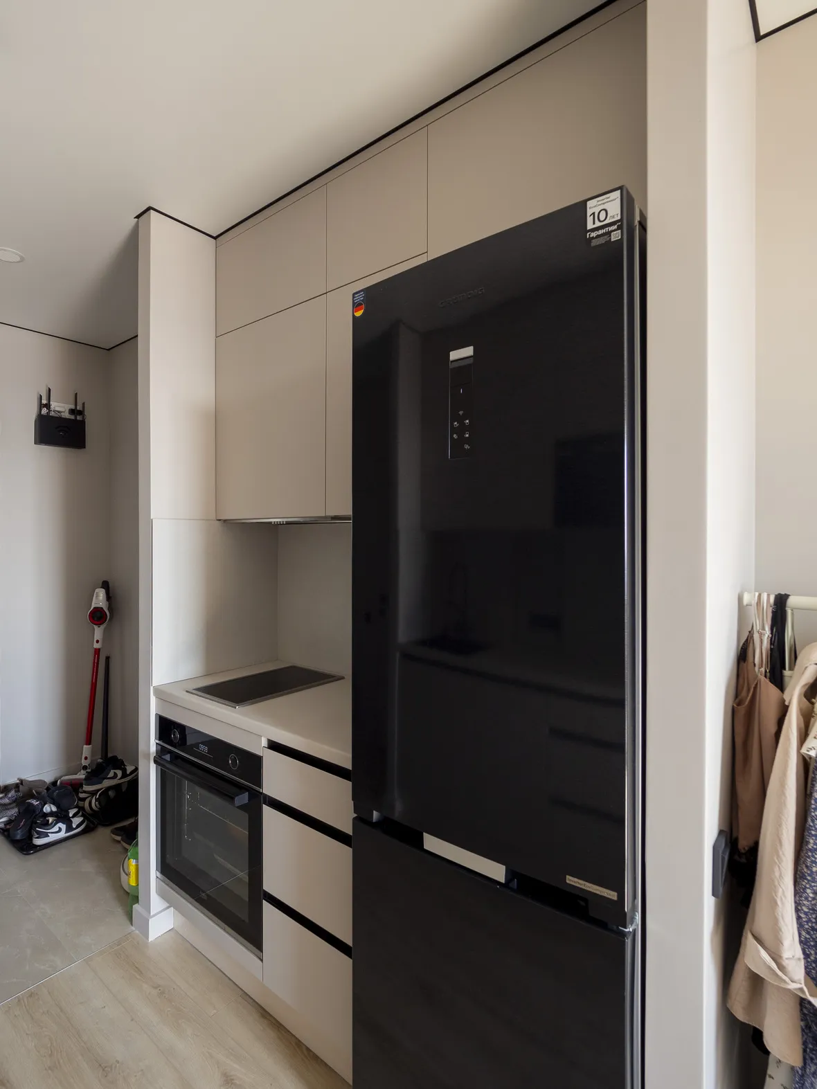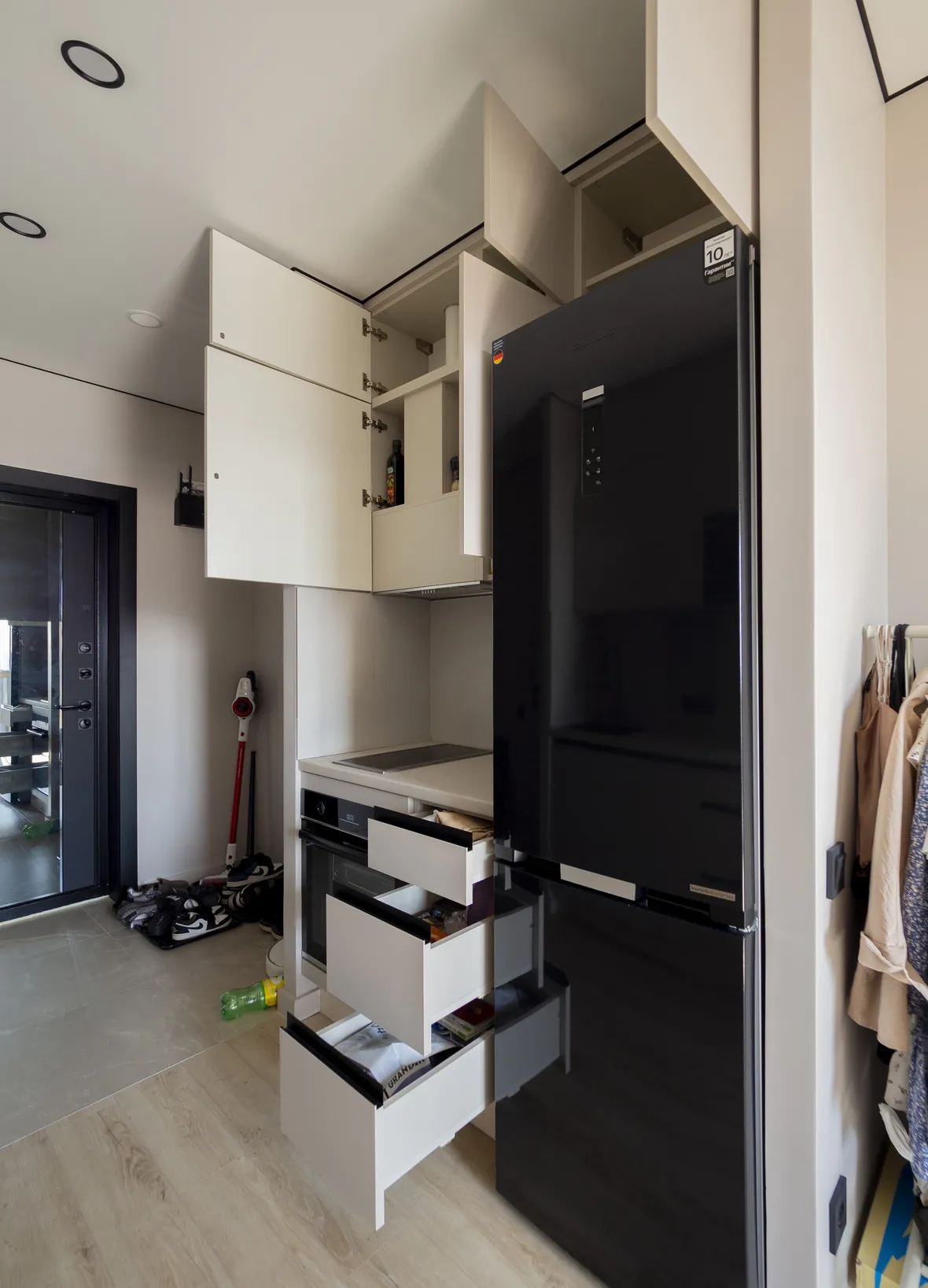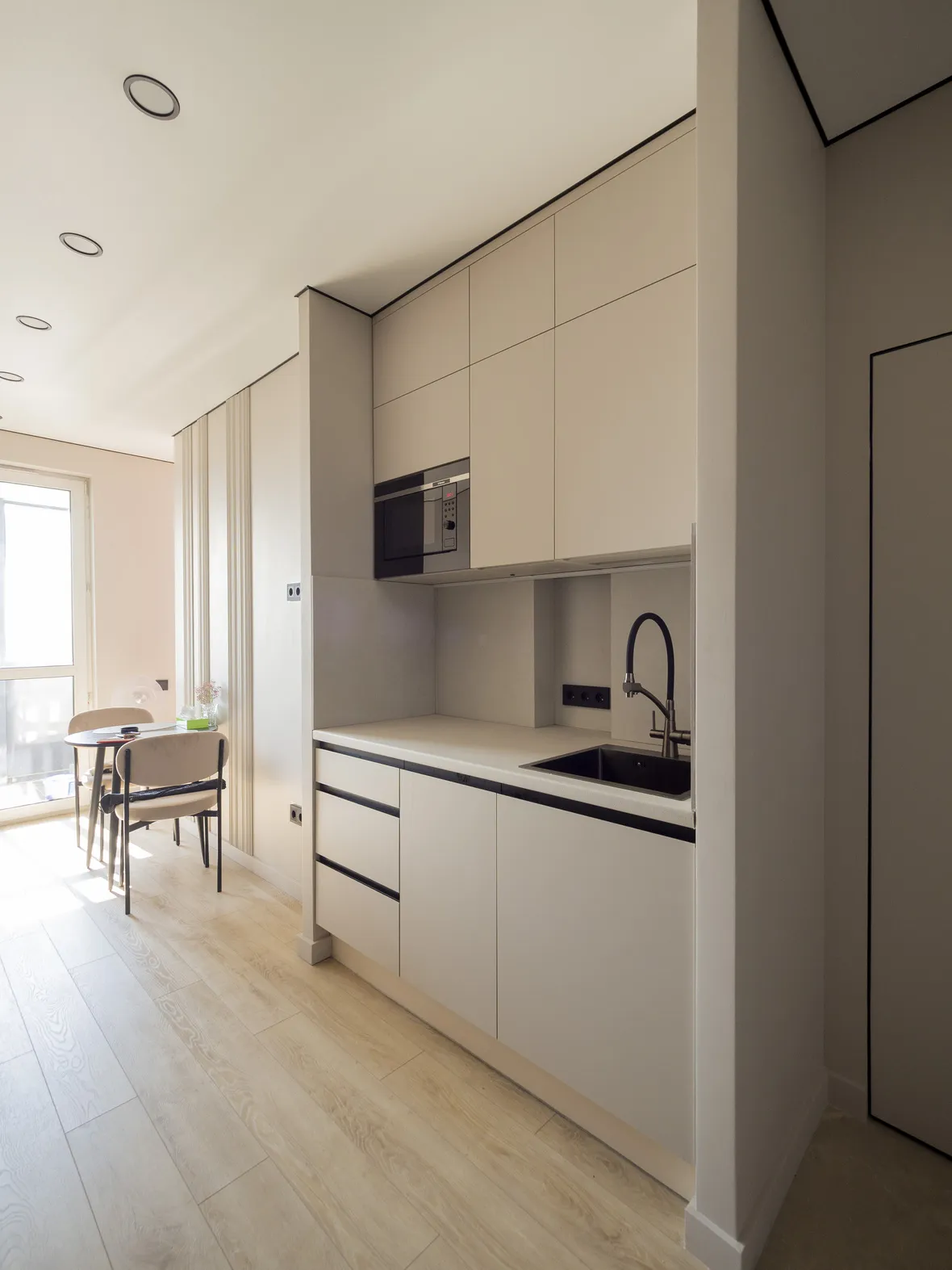 Техника: мойка и смеситель - EMAR, измельчитель - BONE CRUSHER, встроенный духовой шкаф, встроенная электрическая варочная панель, встроенная СВЧ, встроенная вытяжка, встроенная ПММ, встроенный холодильник - KORTING