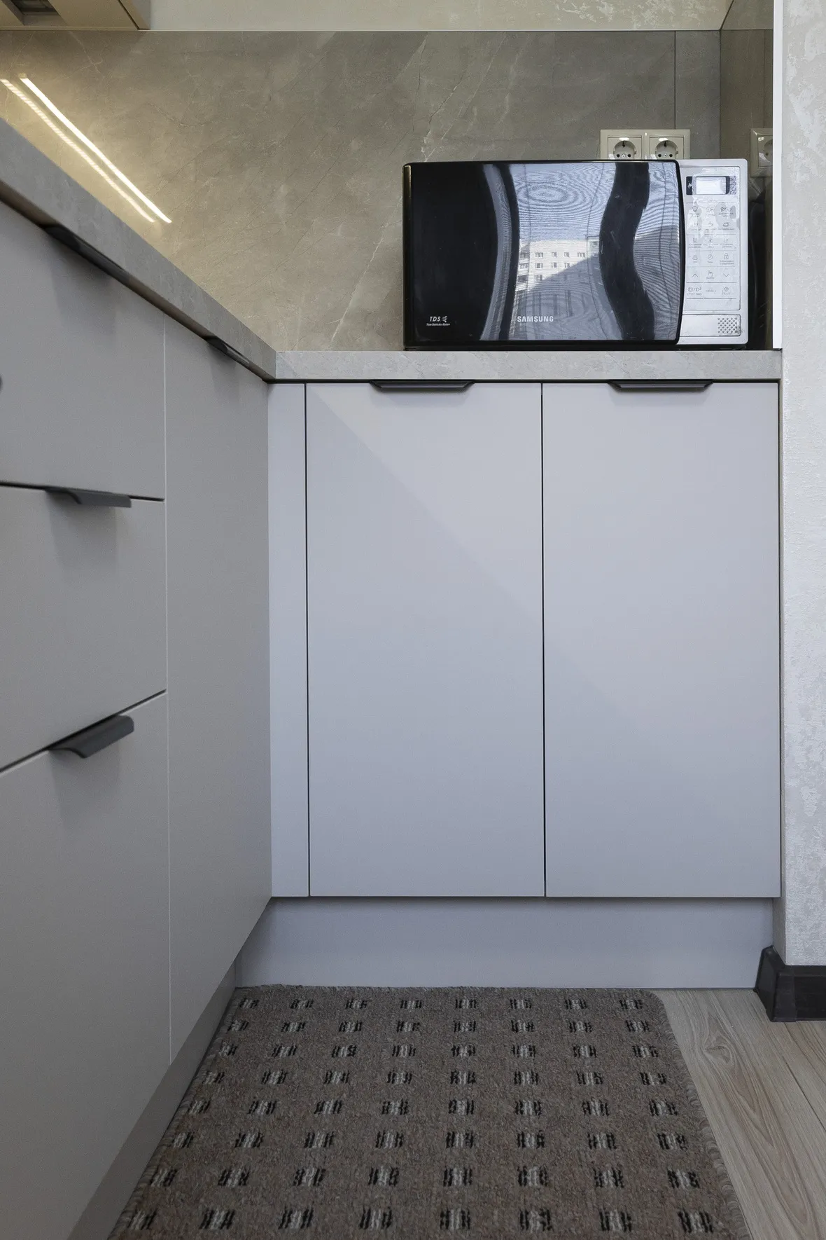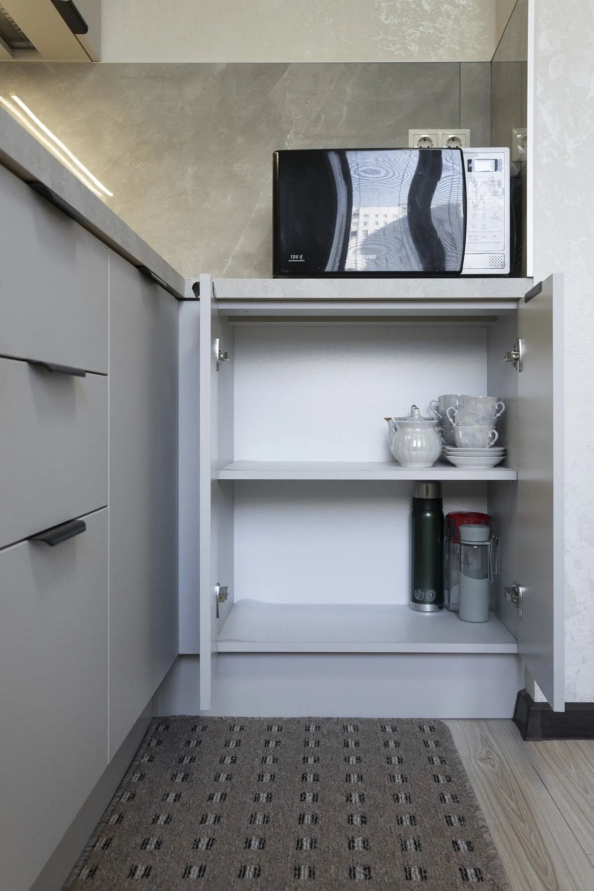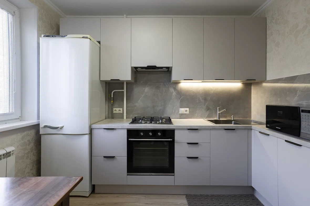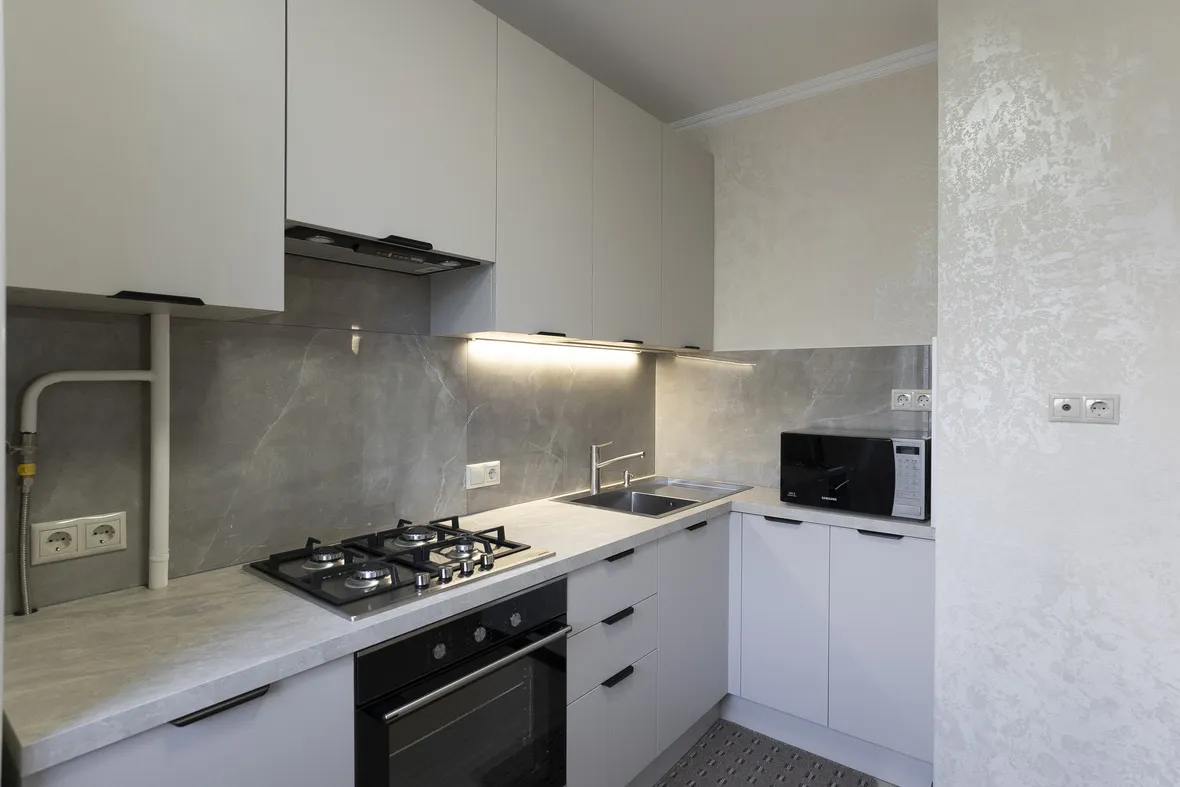 Техника: духовой шкаф, варочная панель газовая, полновстраиваемая вытяжка - KORTING, смеситель - OULIN, смеситель - EMAR
