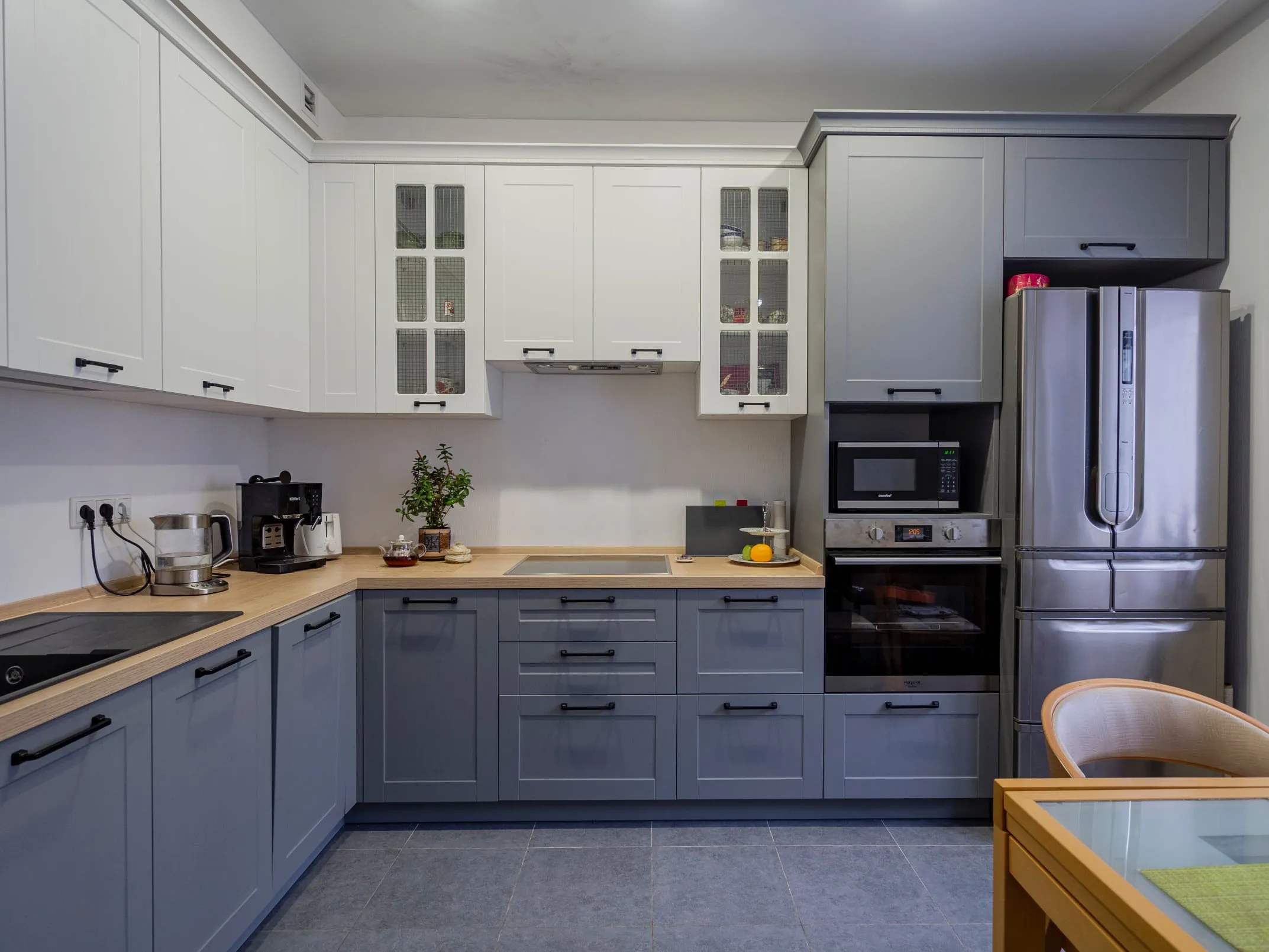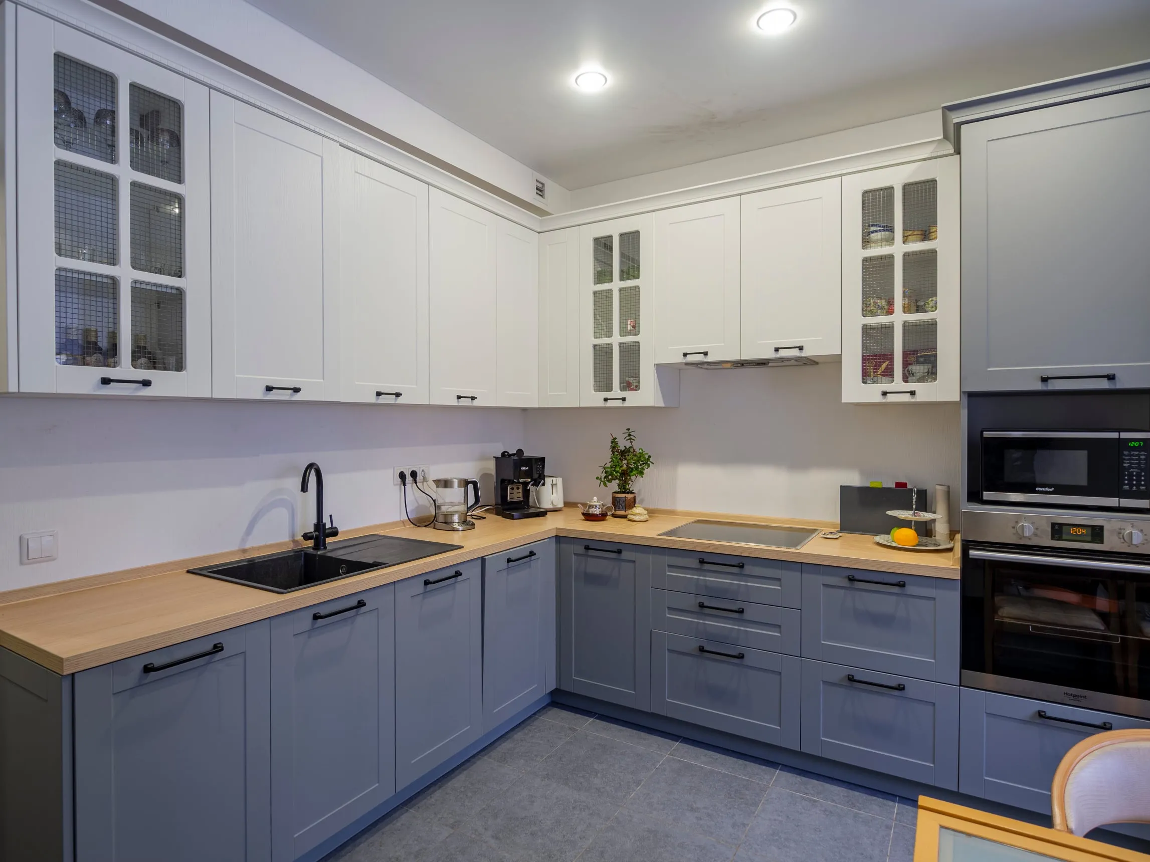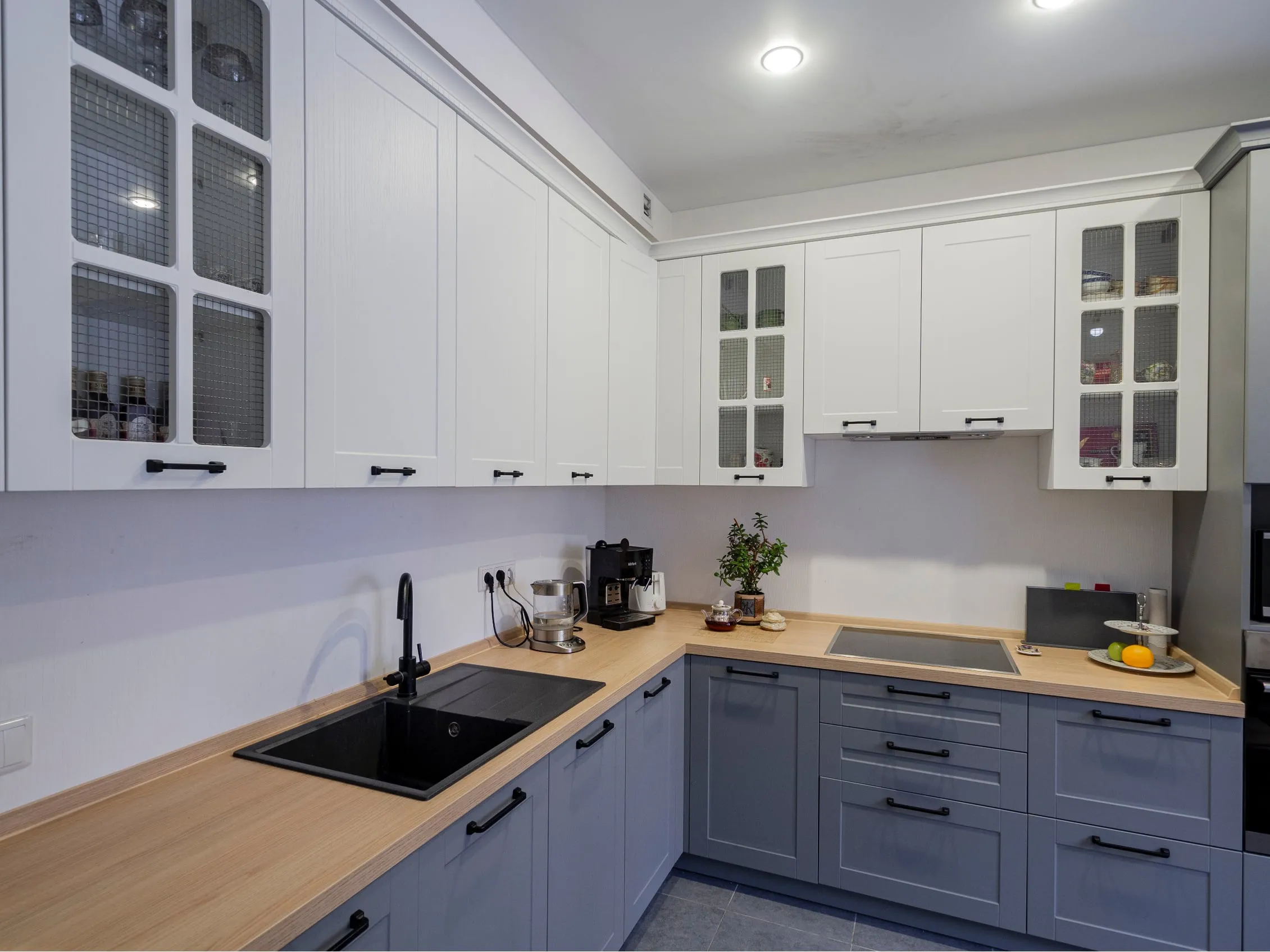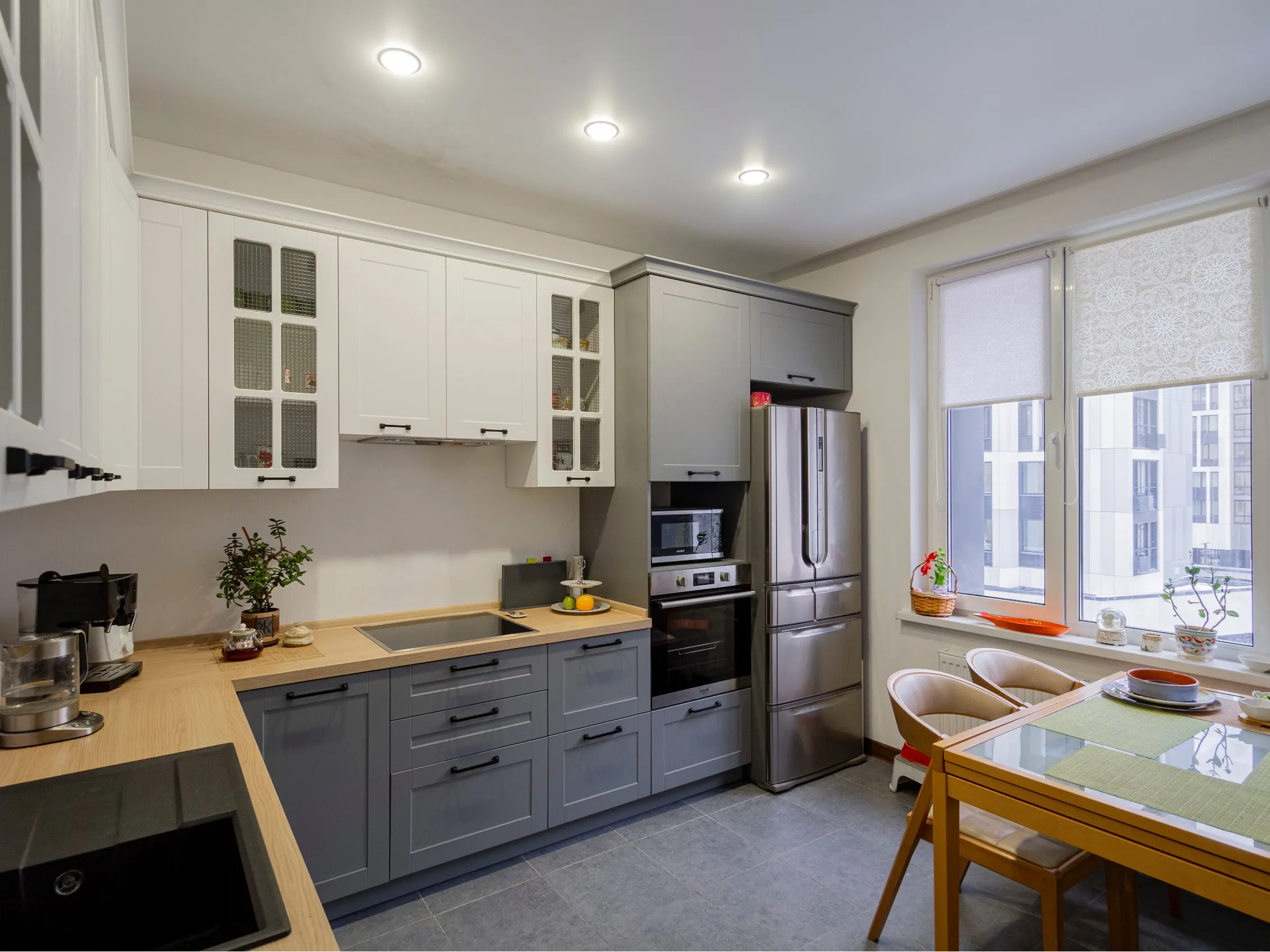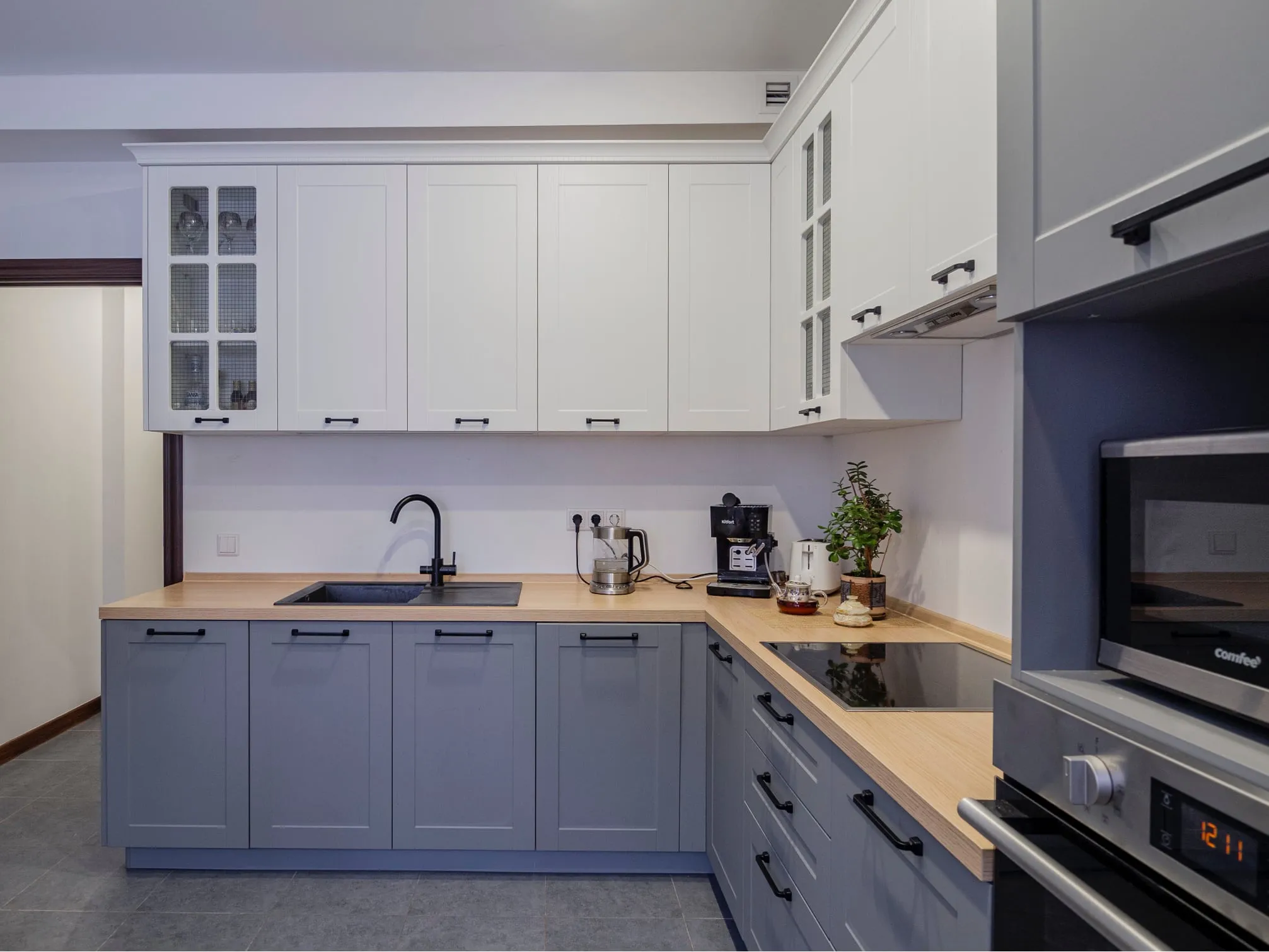 Фасады: МДФ ПВХ, Ясень белый/Серый PET