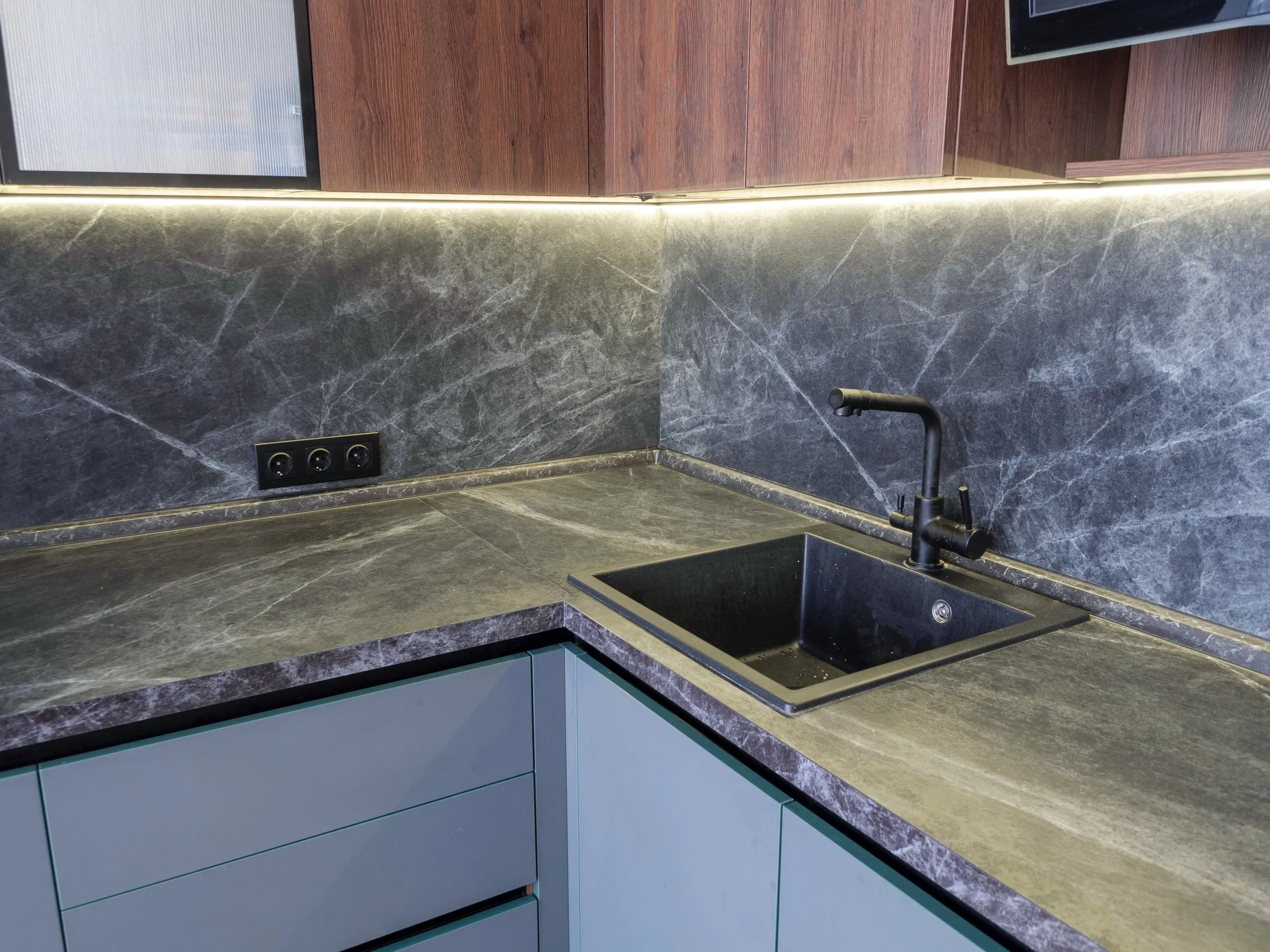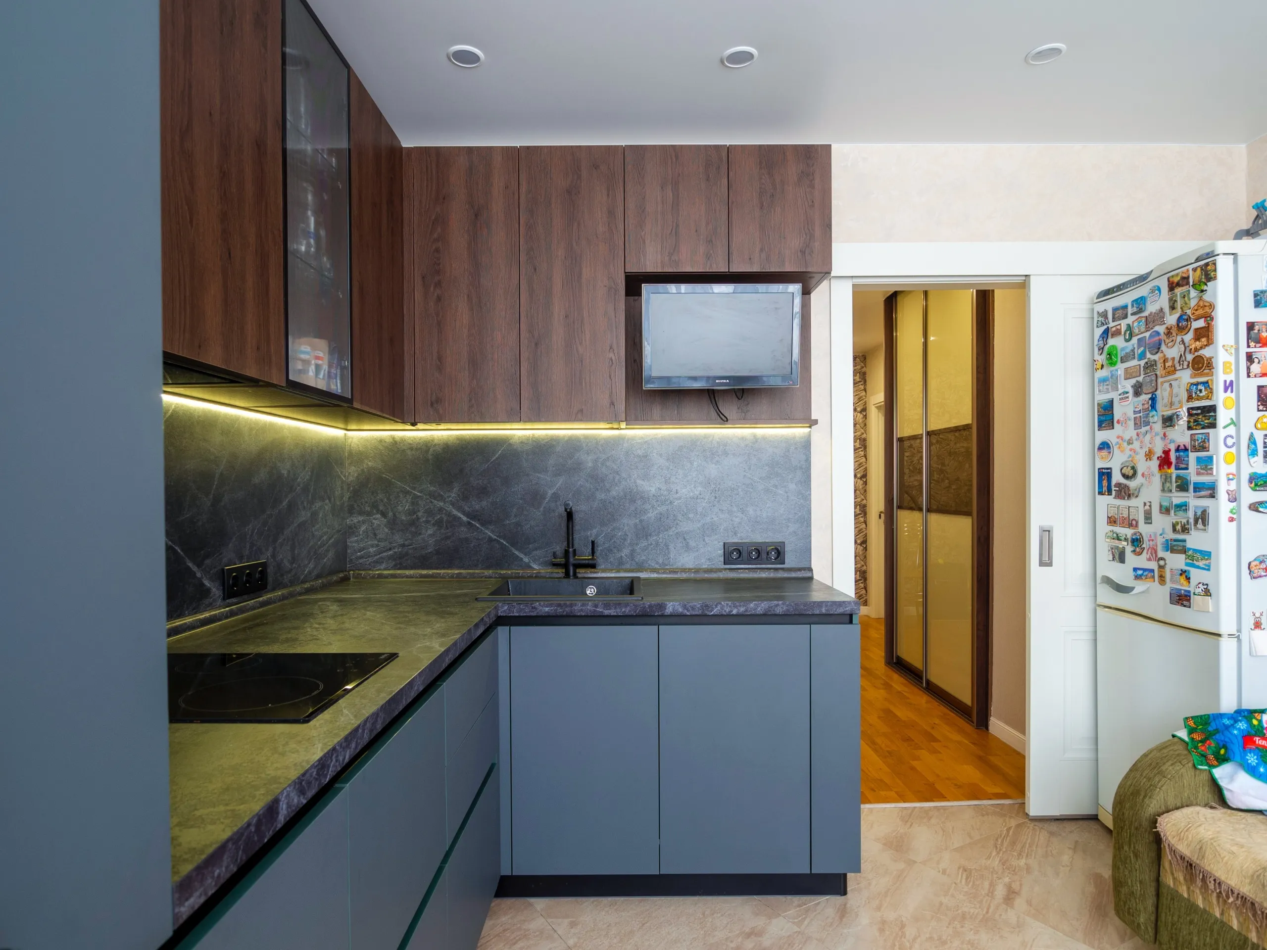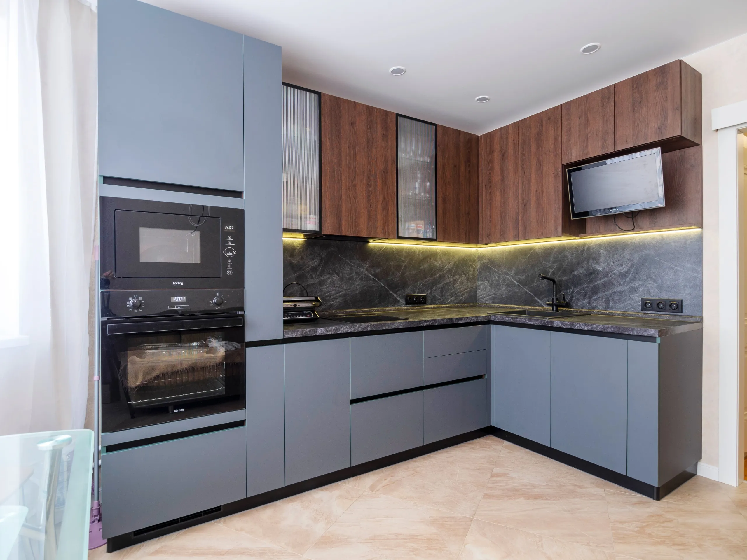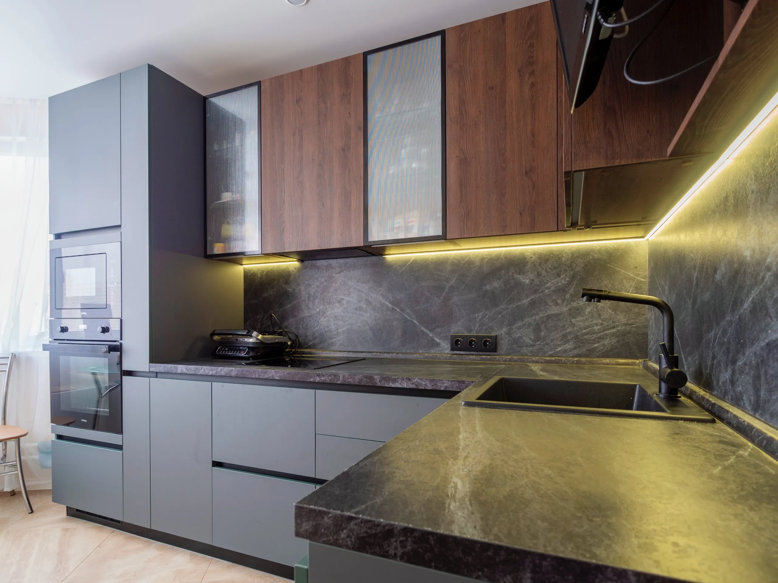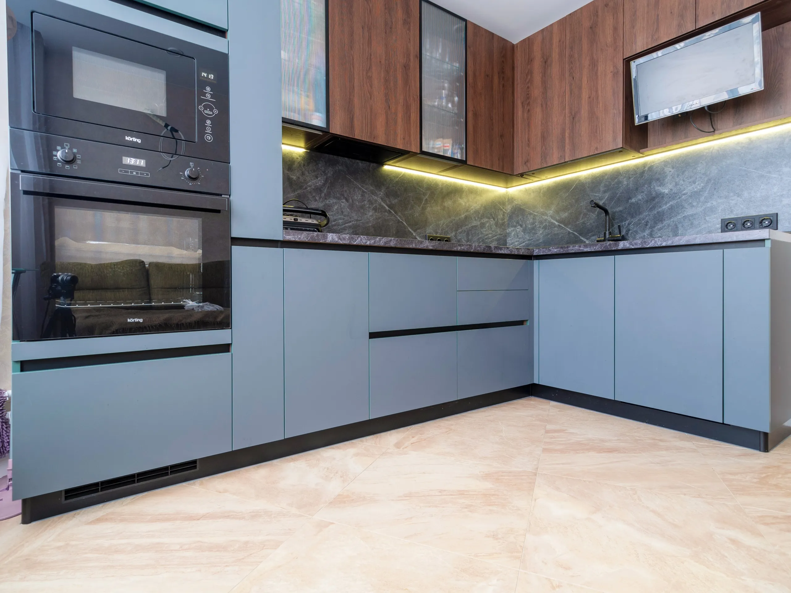 Фасады: Пост-АГТ Супрамат Форест Супрамат / ЛДСП Тибер Кестен верт / Alum A1 Терра черная