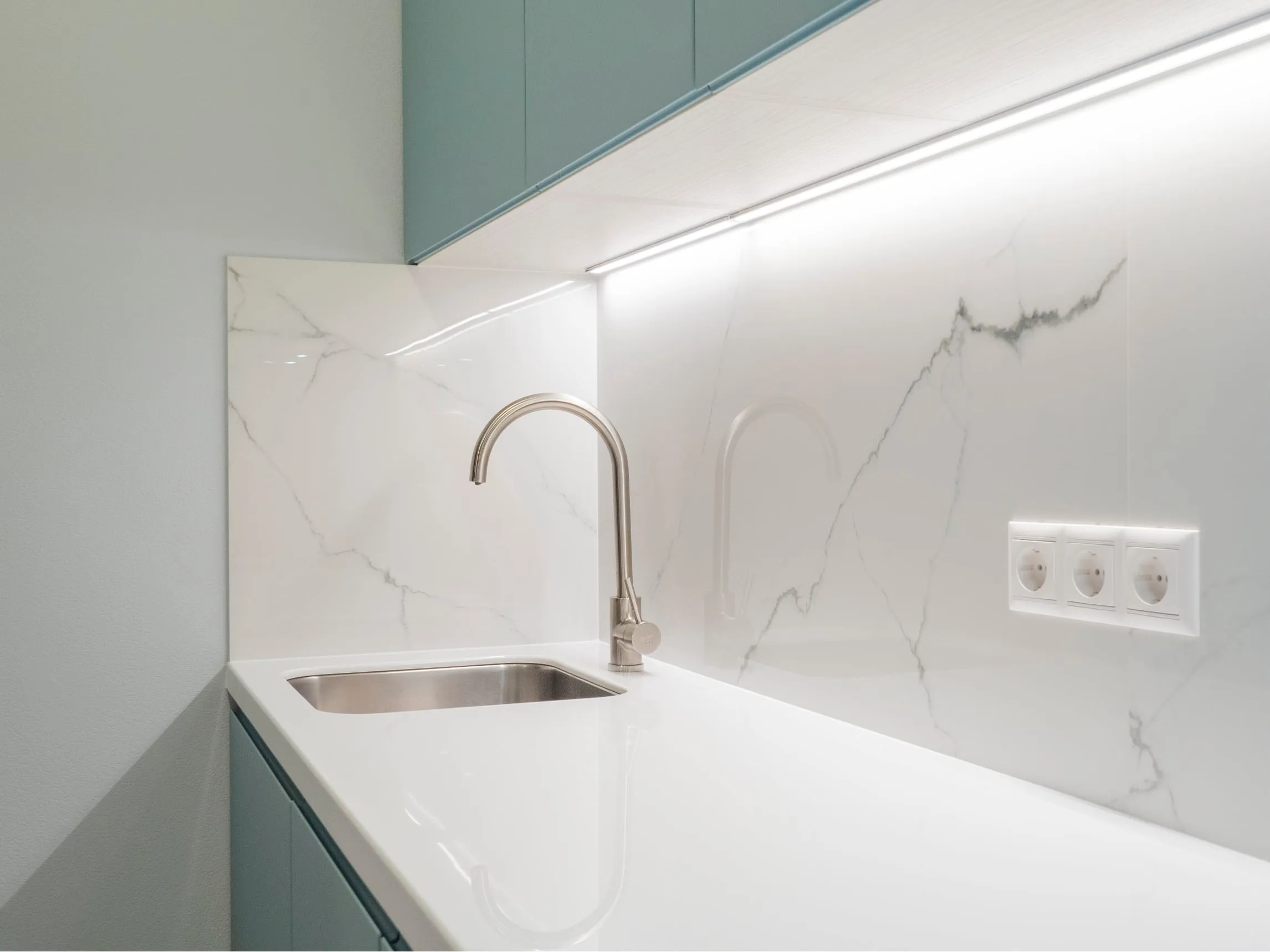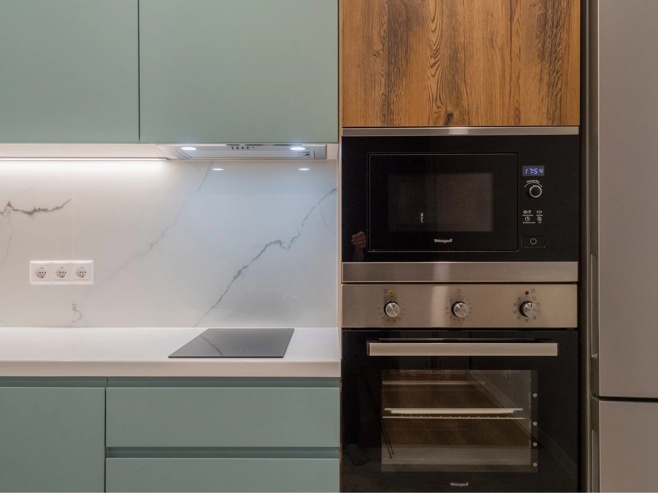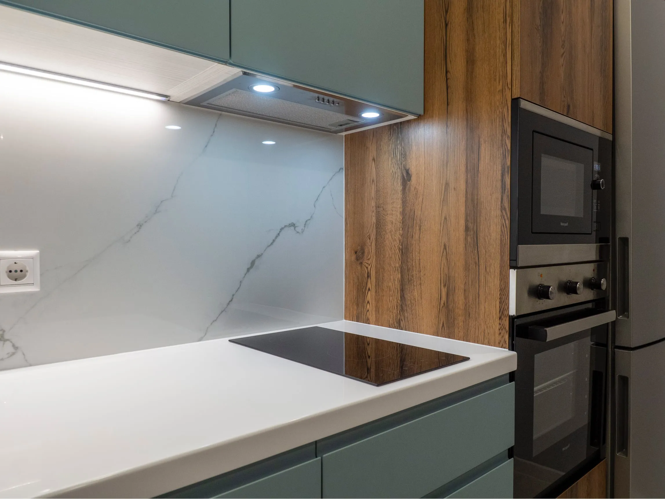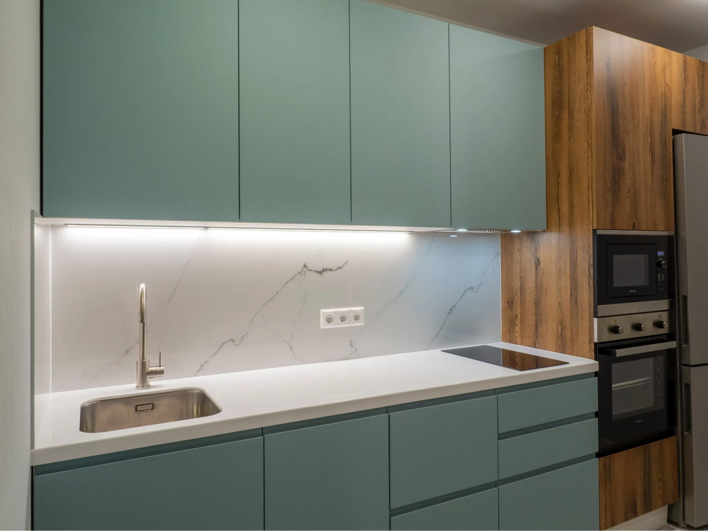 Фасады: МДФ Эмаль, Система NCS S 3010-B30G СМАТ / ЛДСП Тимбер Атик