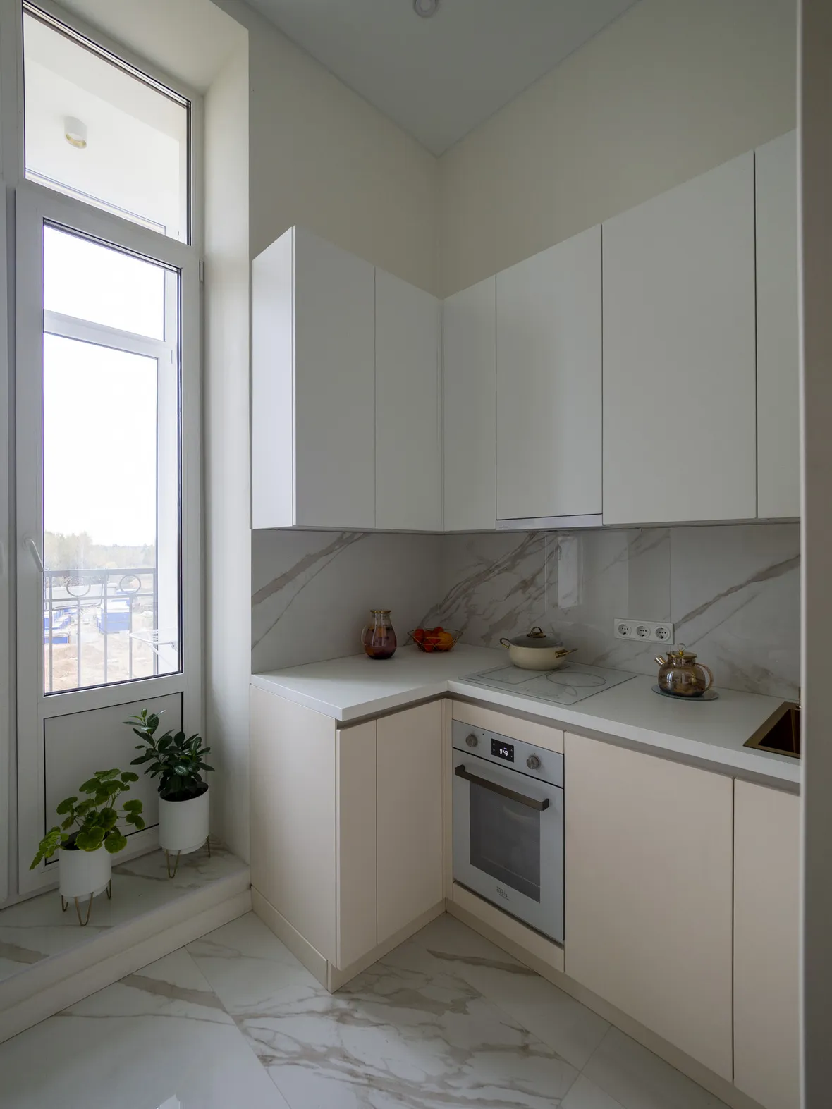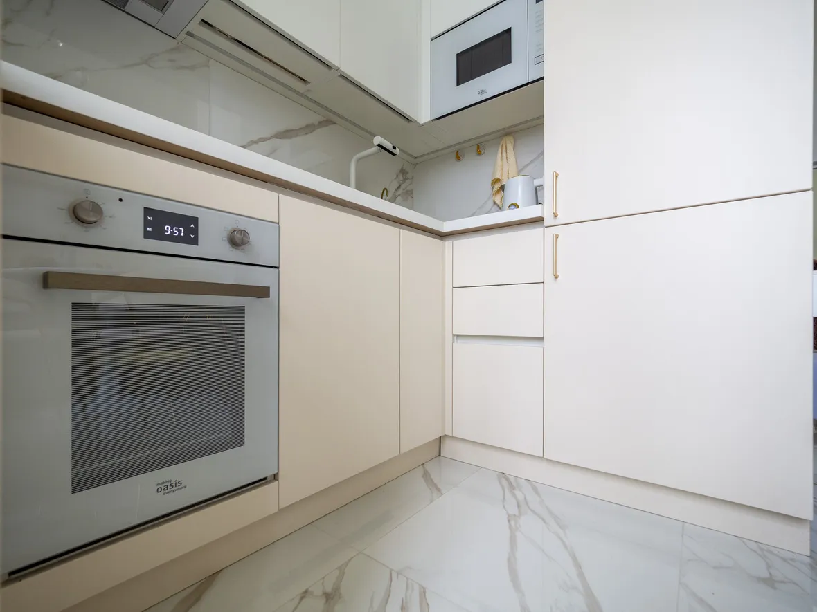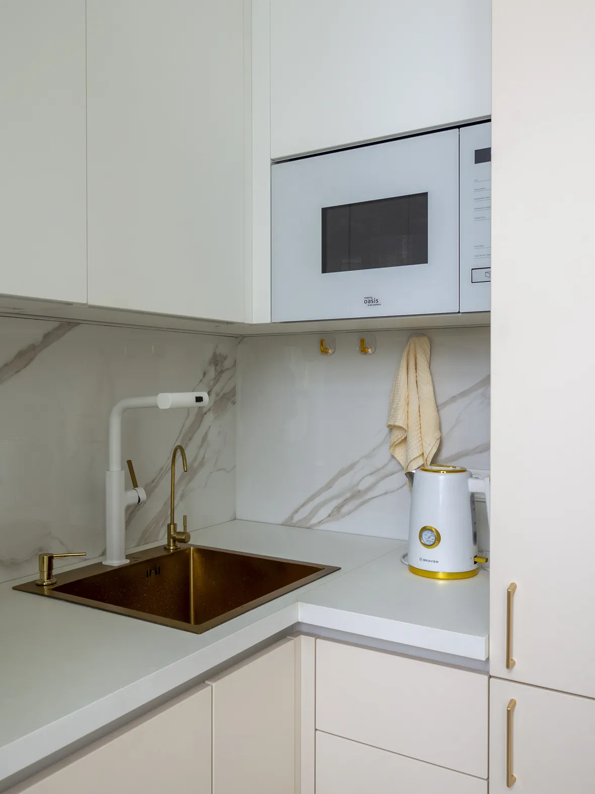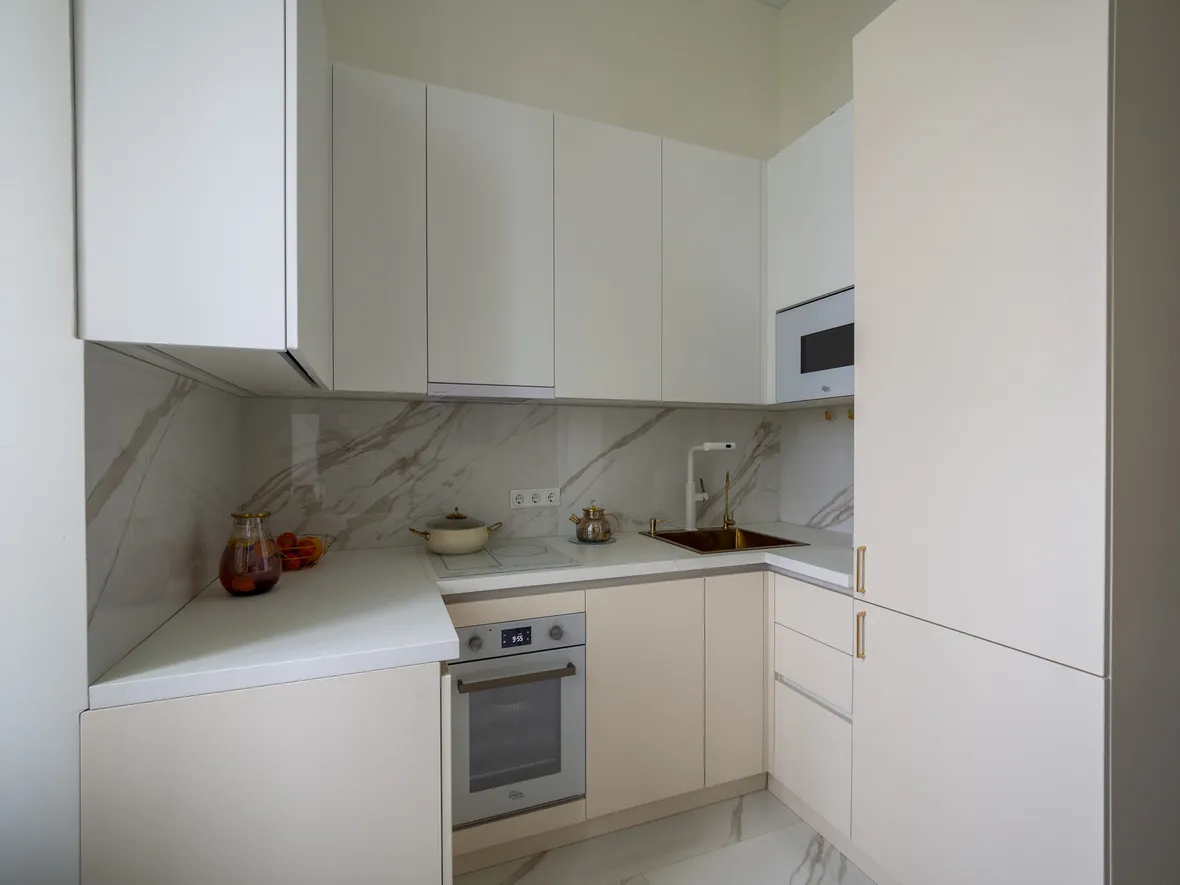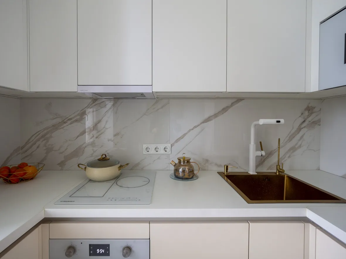 Техника: мойка и смеситель - EMAR, измельчитель - BONE CRUSHER, встроенный духовой шкаф, встроенная электрическая варочная панель, встроенная СВЧ, встроенная вытяжка, встроенная ПММ, встроенный холодильник - KORTING
