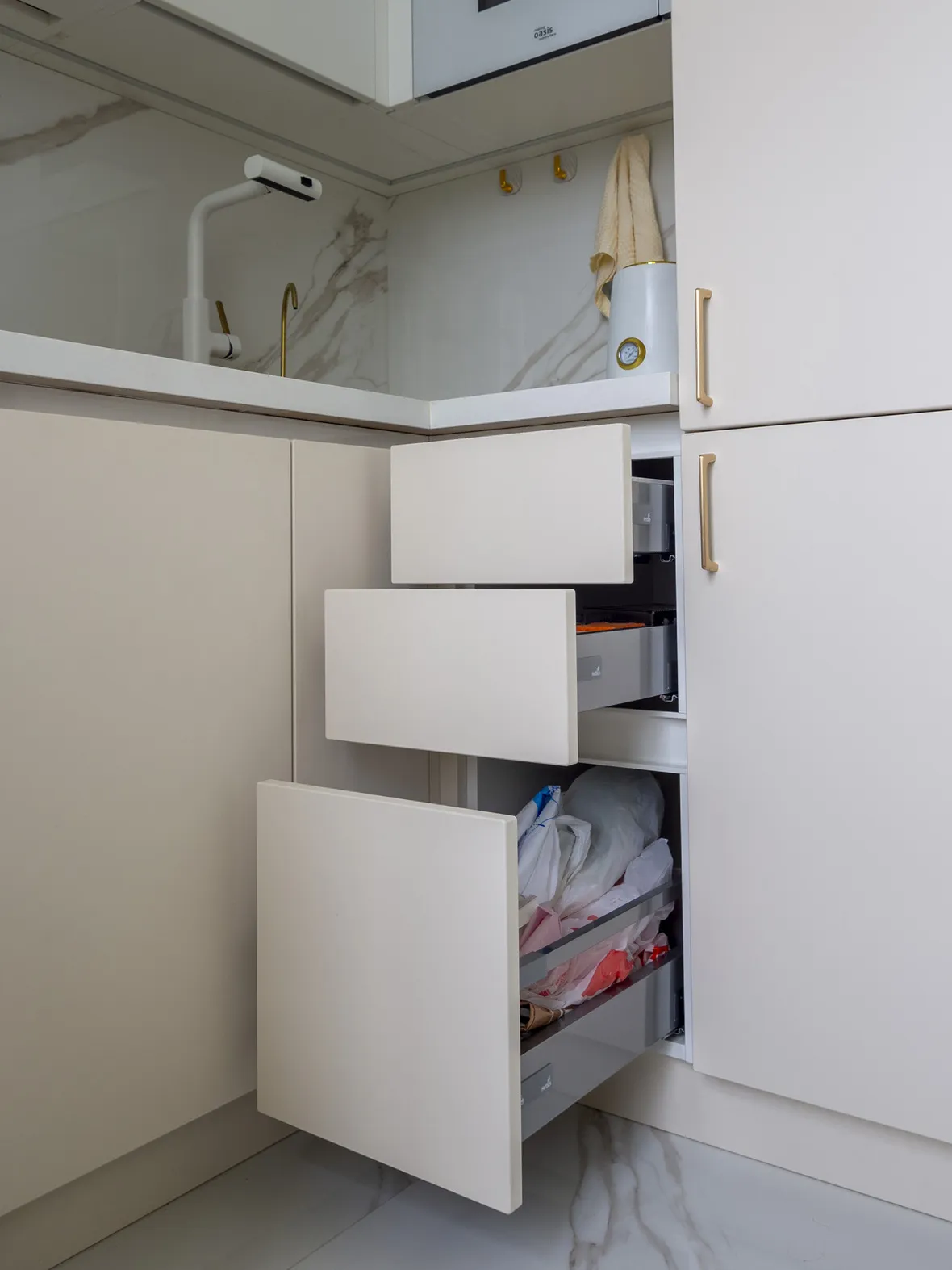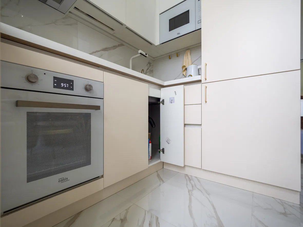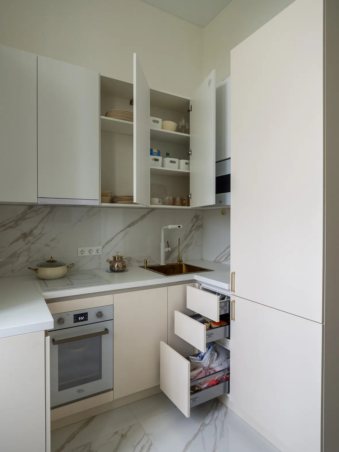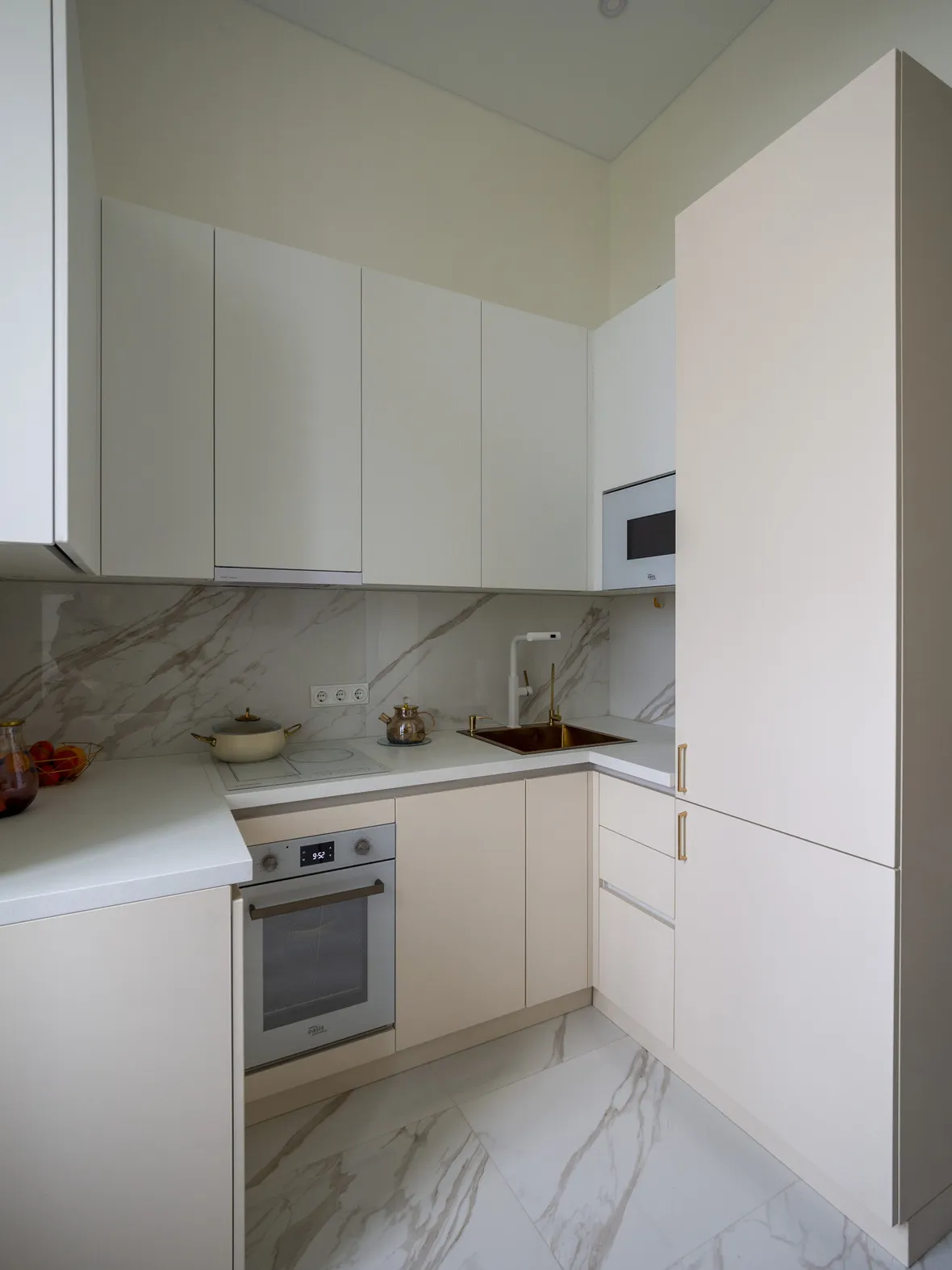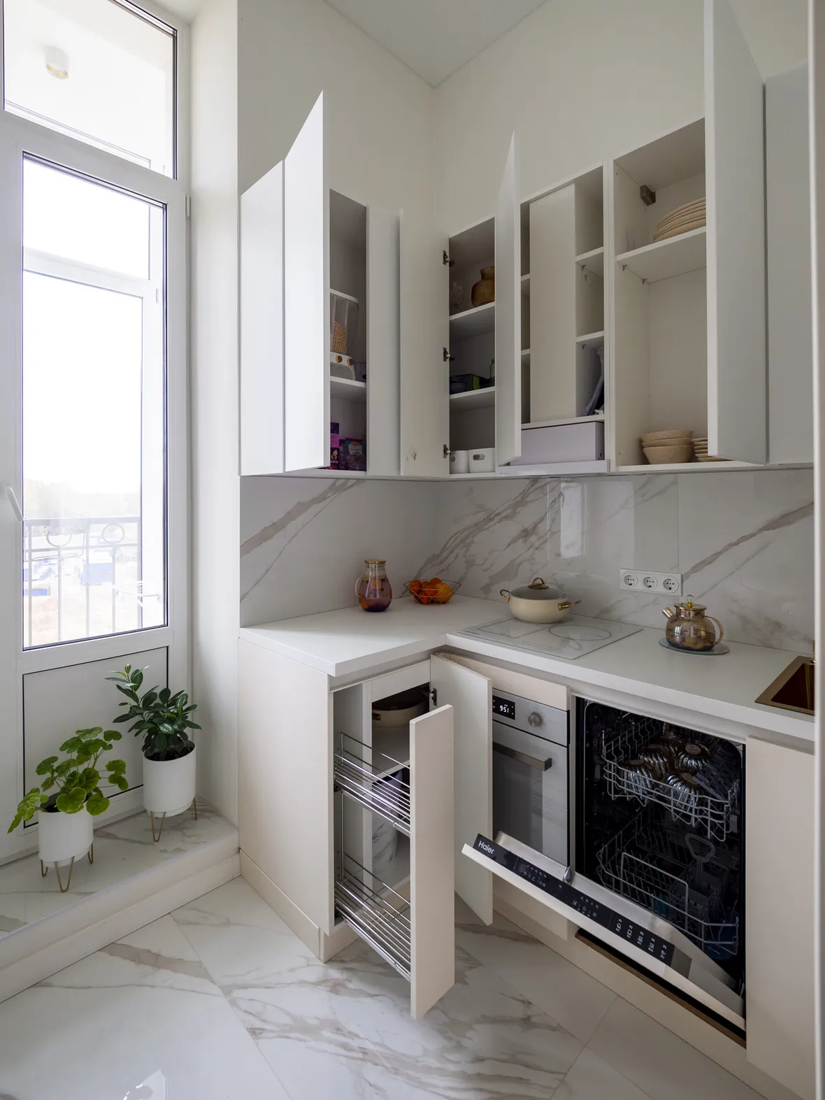 Техника: мойка и смеситель - EMAR, измельчитель - BONE CRUSHER, встроенный духовой шкаф, встроенная электрическая варочная панель, встроенная СВЧ, встроенная вытяжка, встроенная ПММ, встроенный холодильник - KORTING