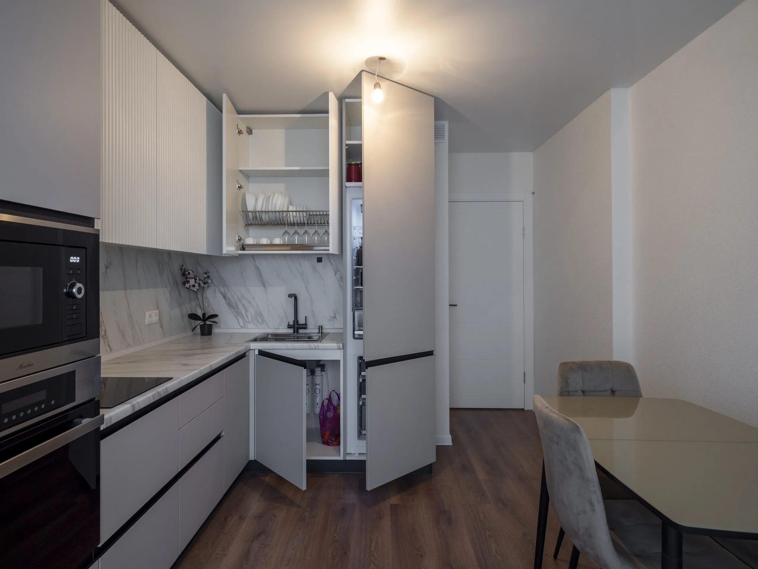 Техника: мойка и смеситель - EMAR, измельчитель - BONE CRUSHER, встроенный духовой шкаф, встроенная электрическая варочная панель, встроенная СВЧ, встроенная вытяжка, встроенная ПММ, встроенный холодильник - KORTING