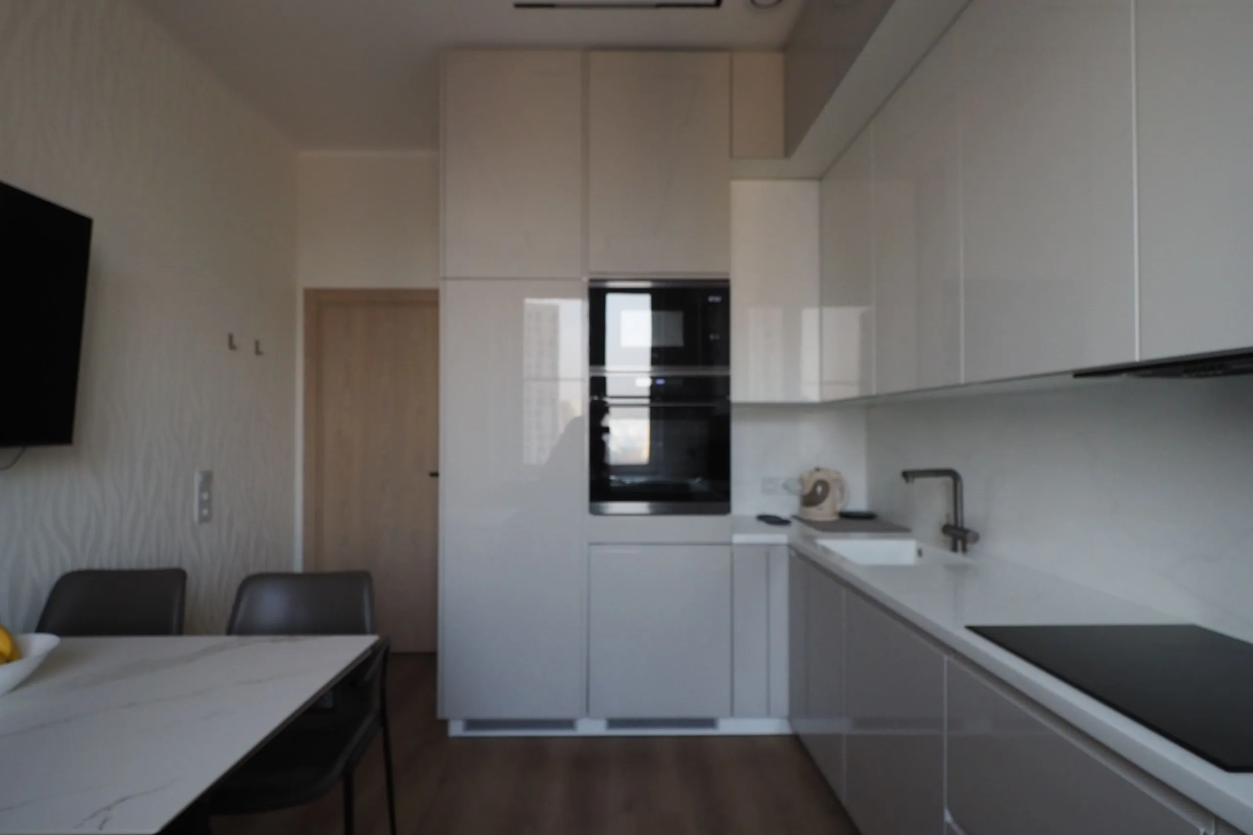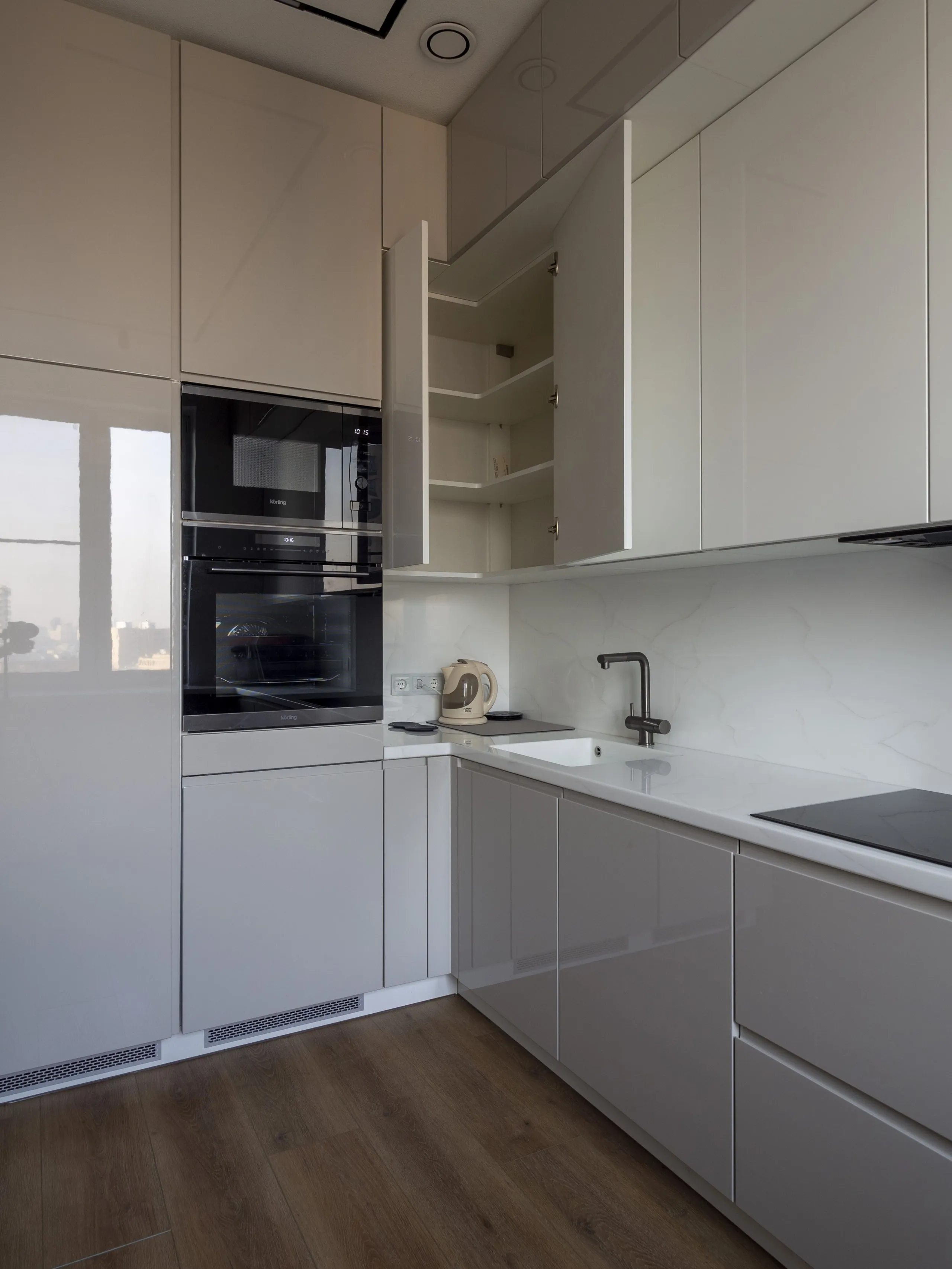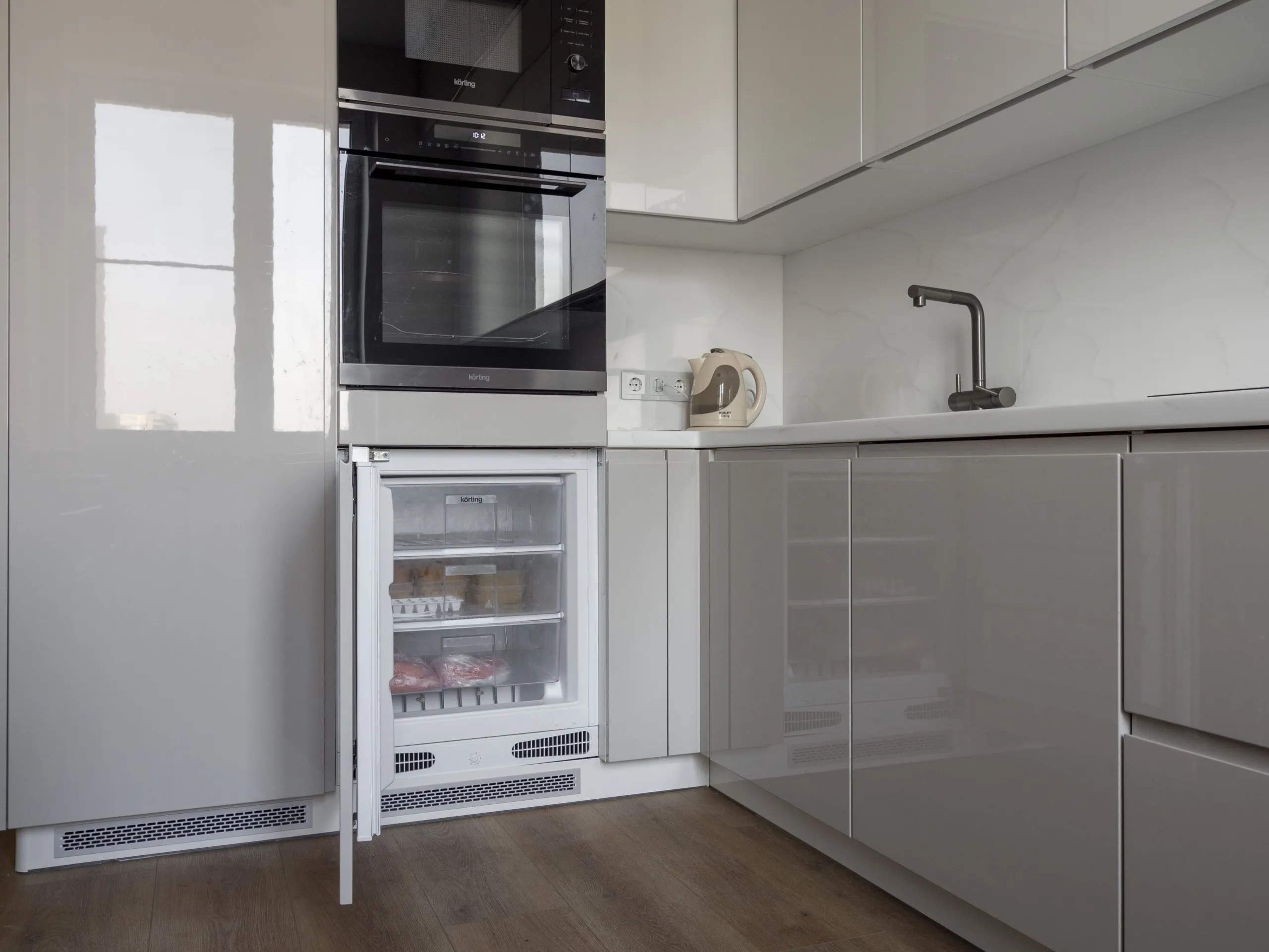 Техника: холодильник, СВЧ, электрический духовой шкаф, ПММ, морозильная камера, индукционная варочная панель, стиральная машина - KORTING, смеситель - EMAR