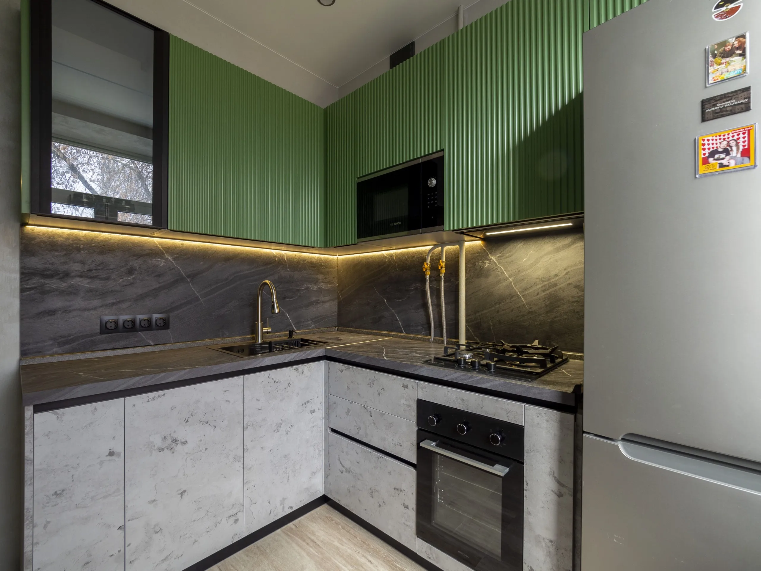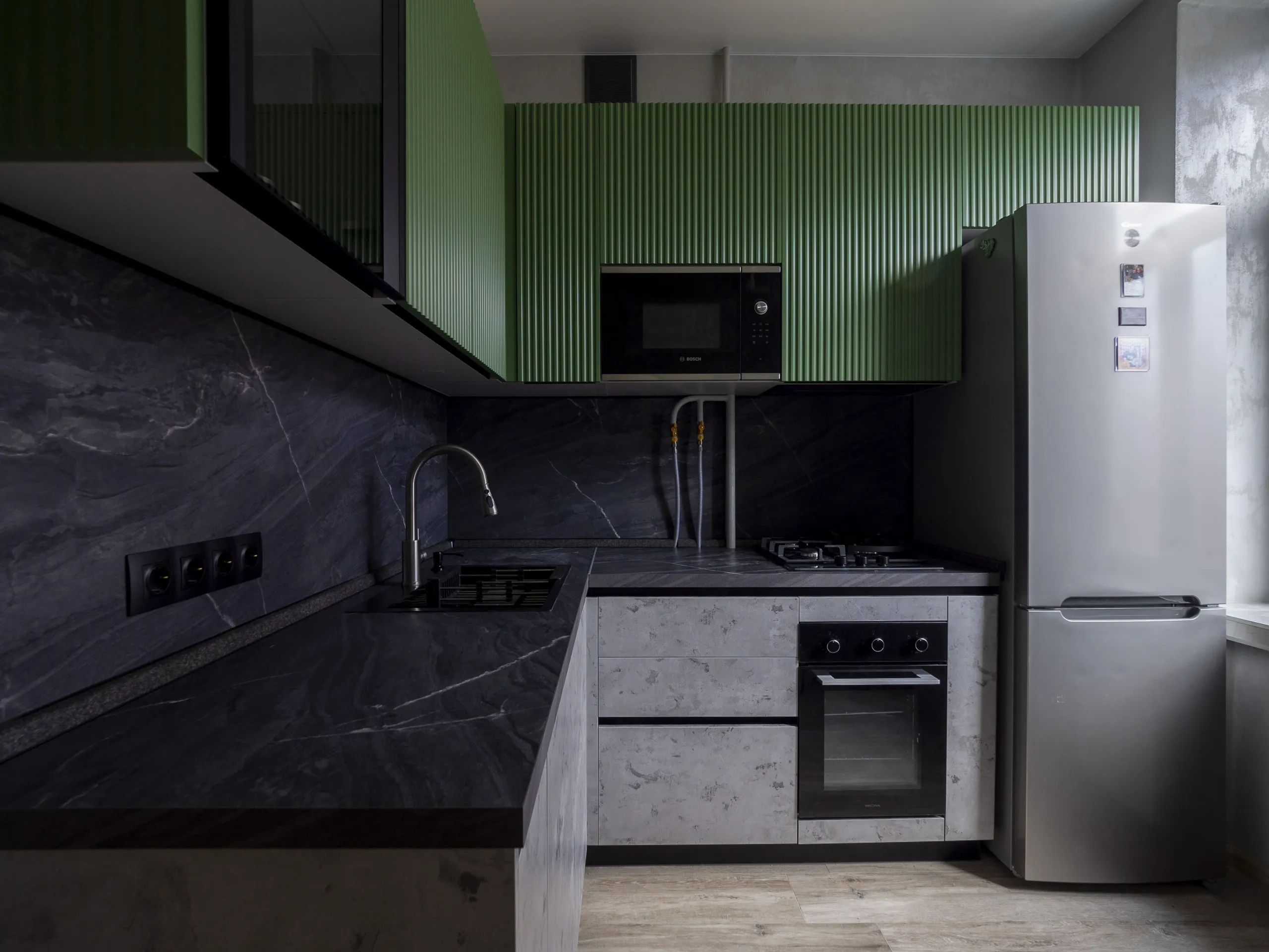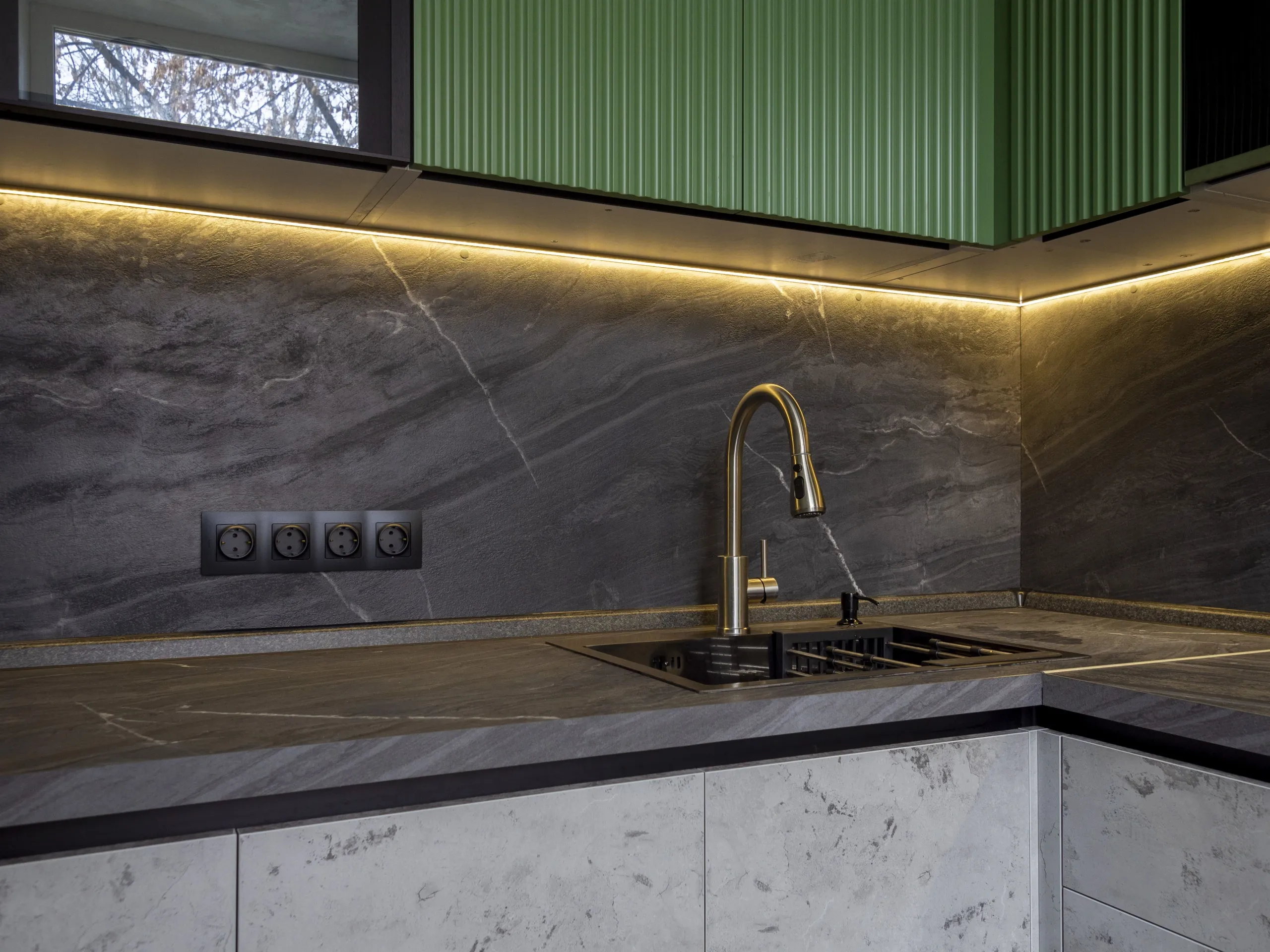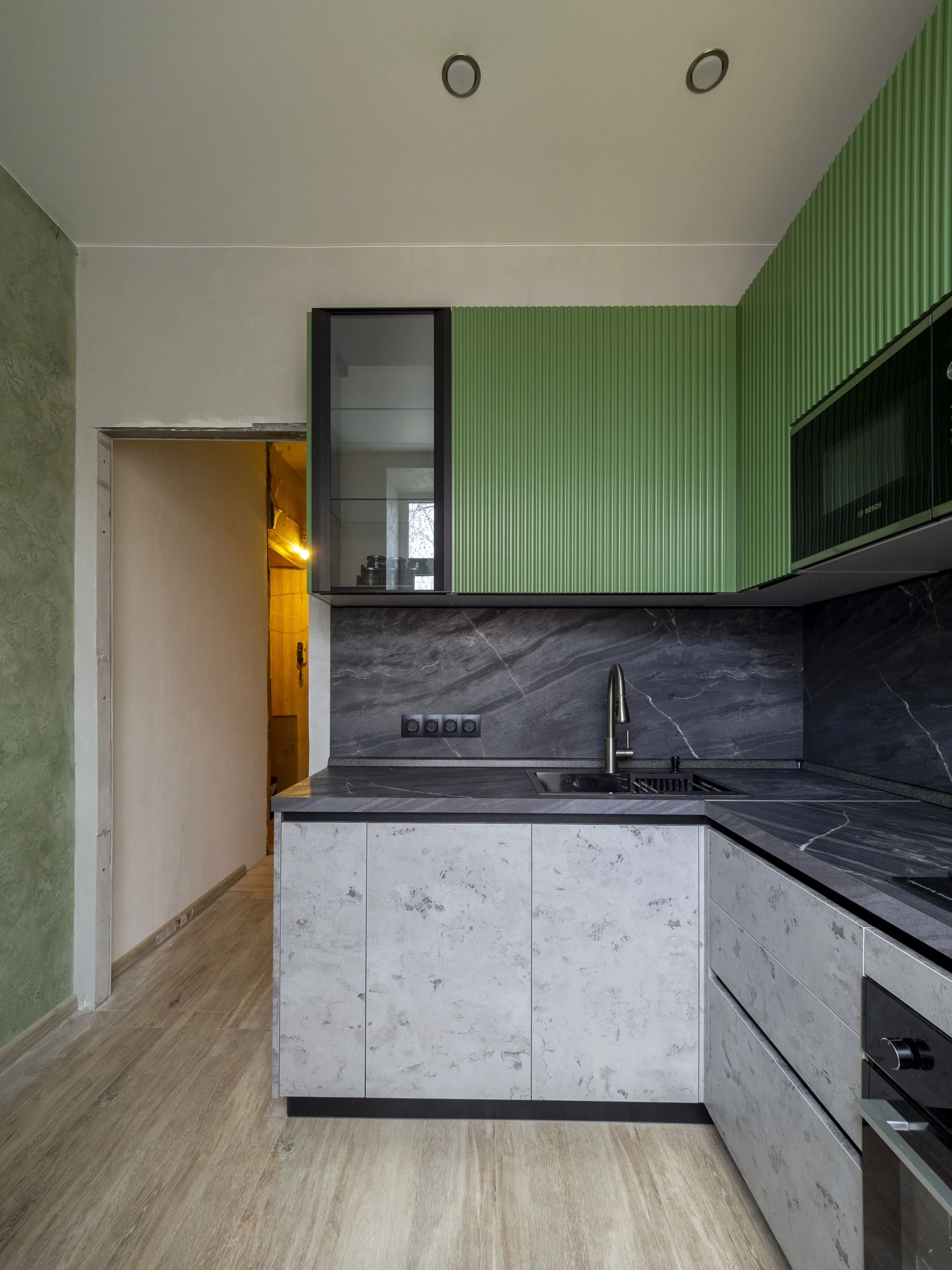 Фасад: Т641 в цвете RAL 6011, Синкрон в цвете Аргенто