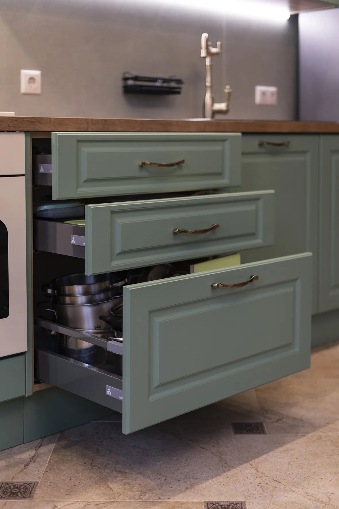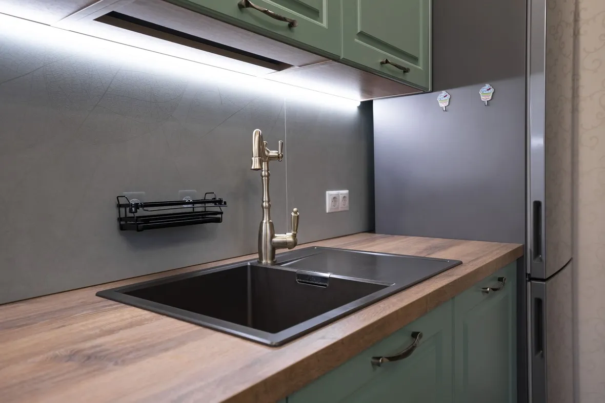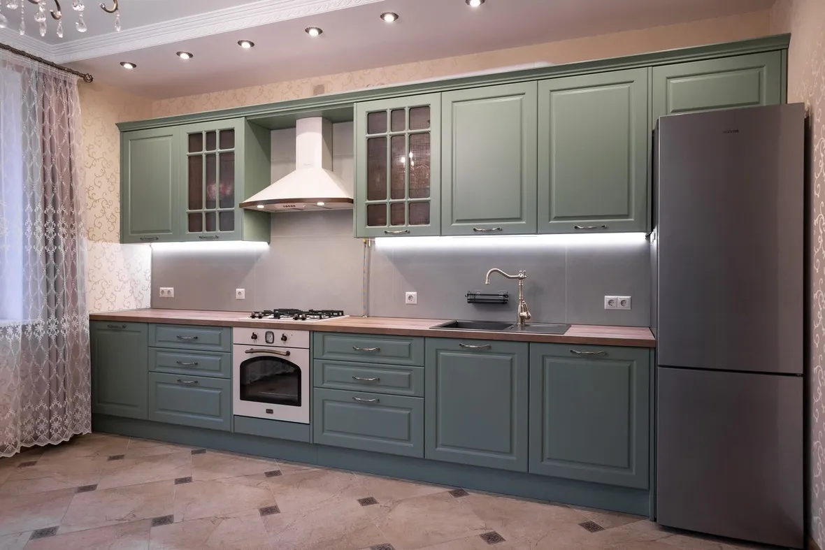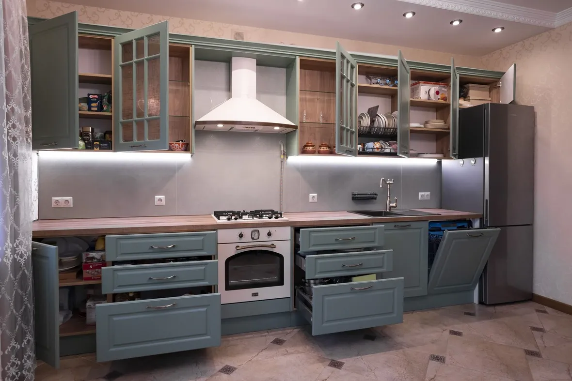 Техника: мойка и смеситель - EMAR, измельчитель - BONE CRUSHER, встроенный духовой шкаф, встроенная электрическая варочная панель, встроенная СВЧ, встроенная вытяжка, встроенная ПММ, встроенный холодильник - KORTING