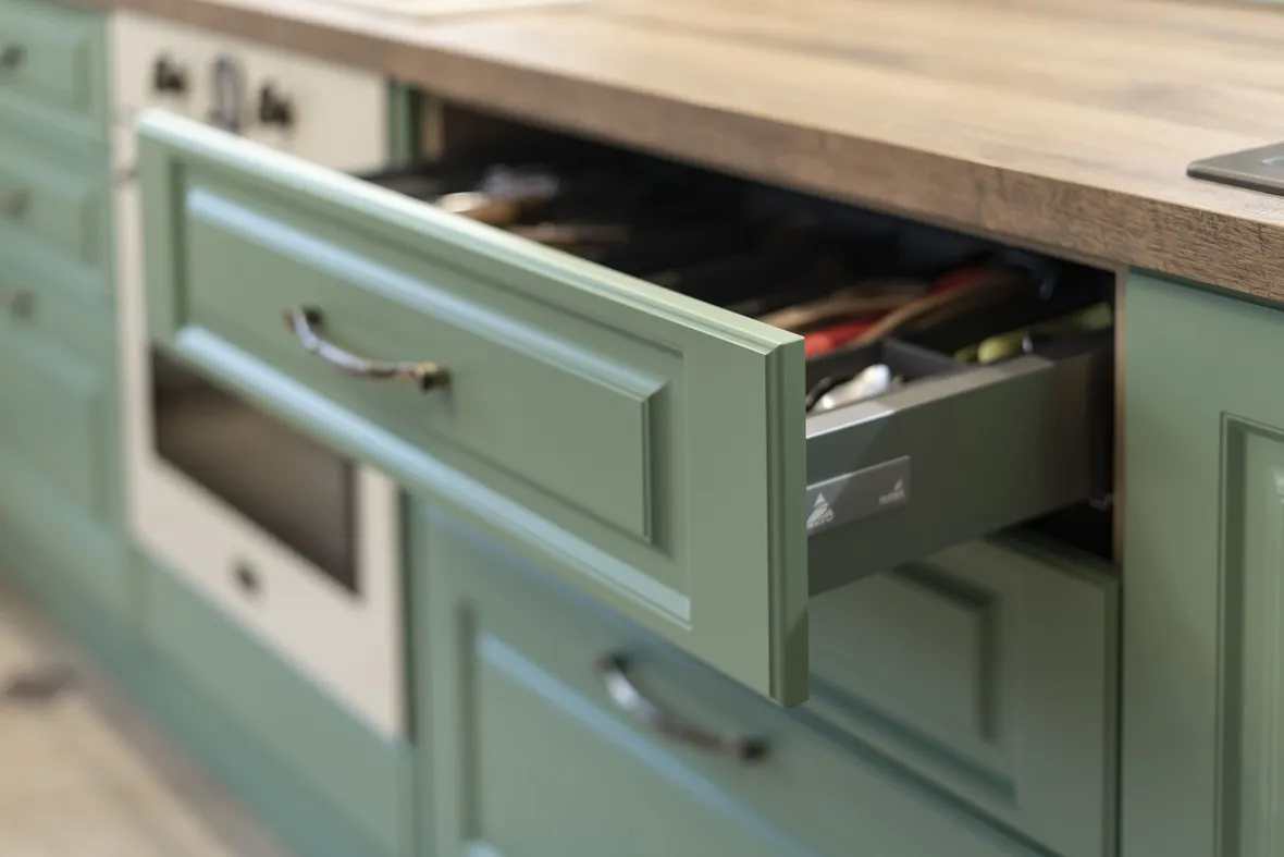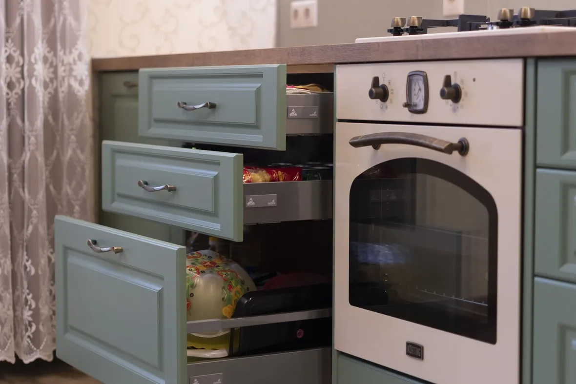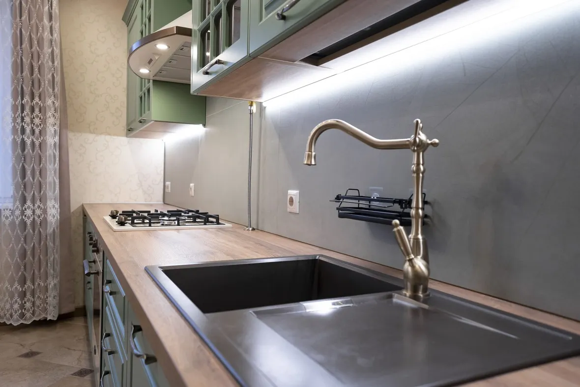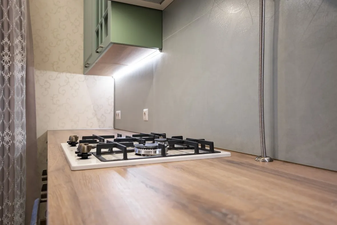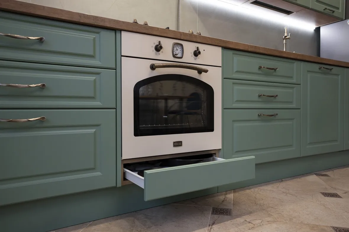 Техника: мойка и смеситель - EMAR, измельчитель - BONE CRUSHER, встроенный духовой шкаф, встроенная электрическая варочная панель, встроенная СВЧ, встроенная вытяжка, встроенная ПММ, встроенный холодильник - KORTING