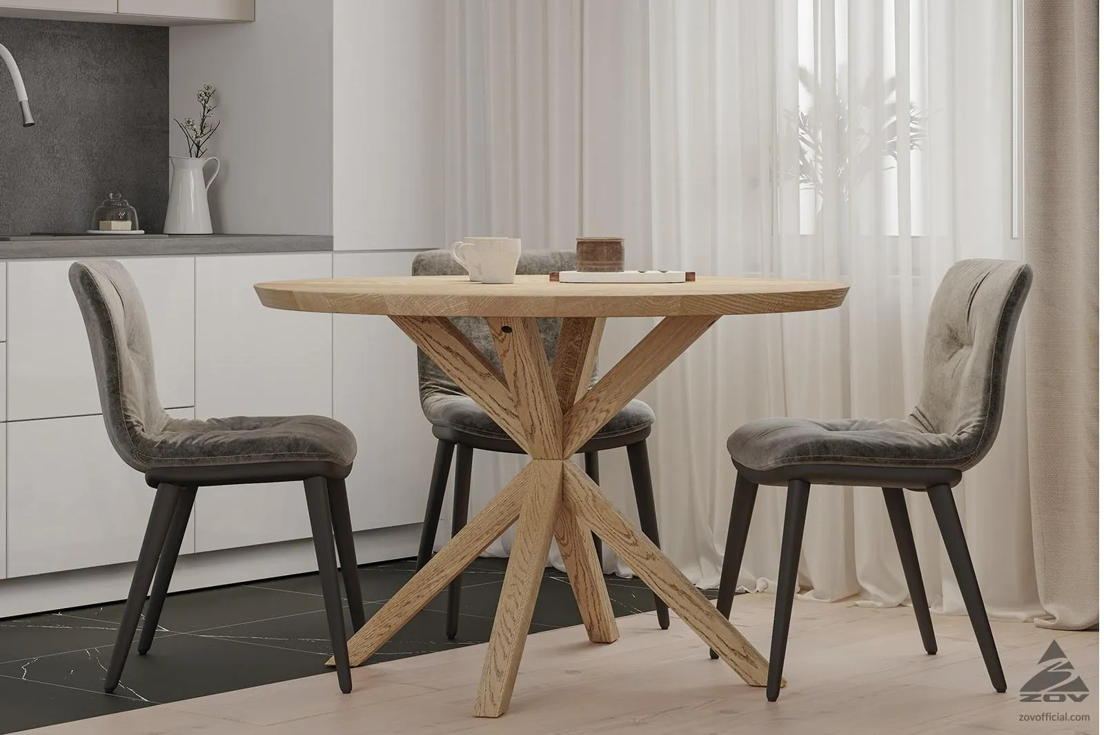 Модель круглой формы из натурального дуба. Столешница диаметром 1200 мм. Высота составляет 782 мм.
